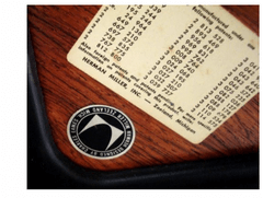 Round Metal Disc - between 1956-1969 the Herman Miller logo was in the center and the legend "Designed by Charles Eames - Herman Miller Zeeland, Mich” around it. The label color was white and or black. This period marks a significant part of the Herman Miller label history.