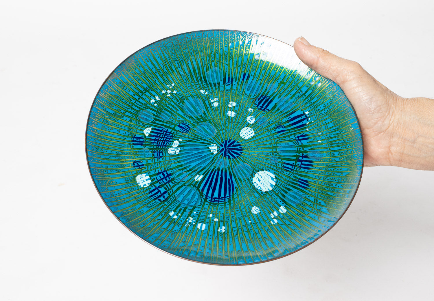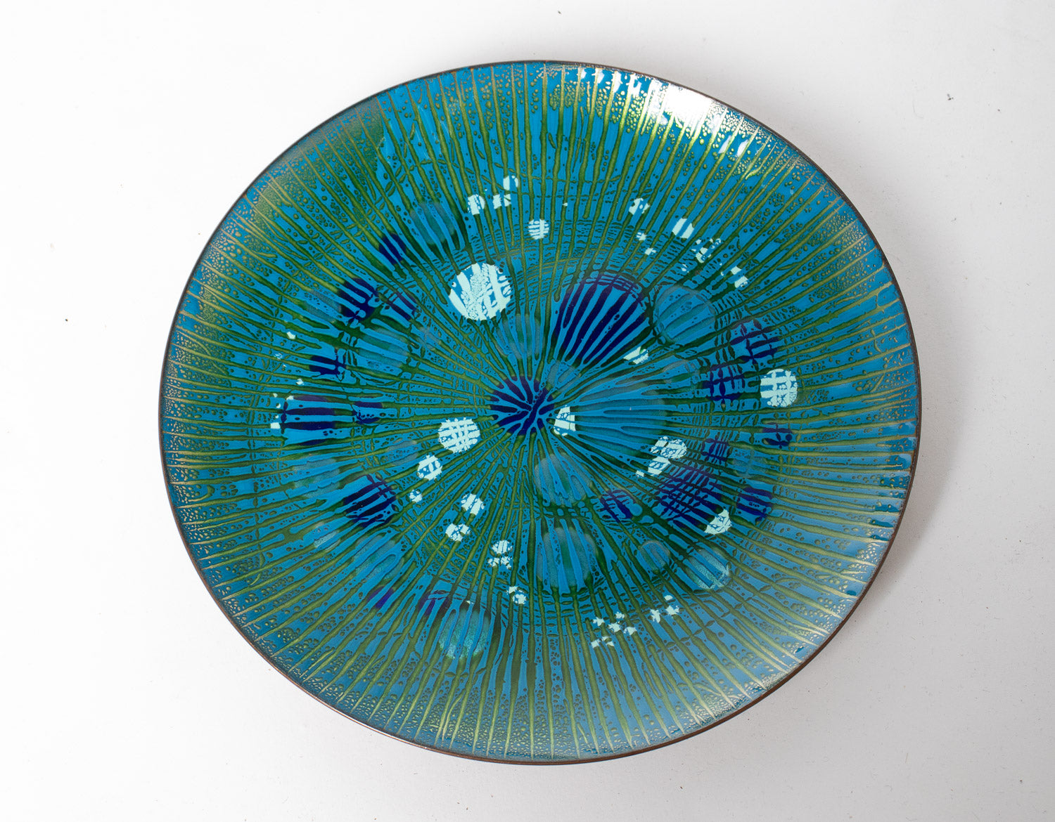 Annemarie Davidson was a central figure in the California mid-century enameling movement, working alongside other studio craft pioneers who helped elevate enamel from simple decoration to expressive fine art. Trained at UCLA and deeply influenced by the postwar craft renaissance, Davidson developed a distinctive visual language: jewel-like color palettes, radiating textures, and hand-applied resist techniques that create the shimmering “ghosted” forms seen here. Her work remains highly collected for its artistry, vibrancy, and technical mastery.