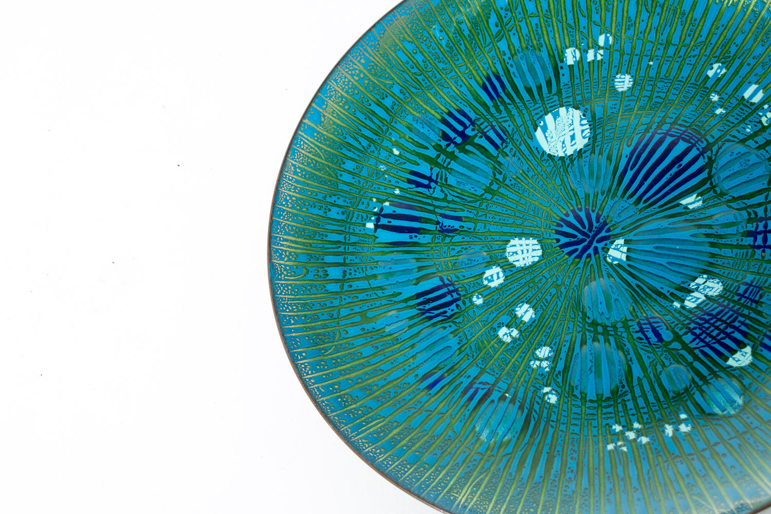 This particular plate is an uncommon variation of the “Ghostline” motif, featuring the rarer inclusion of white enamel elements that punctuate and highlight the composition. The effect is luminous and dimensional—almost like viewing coral forms or constellations through deep water.