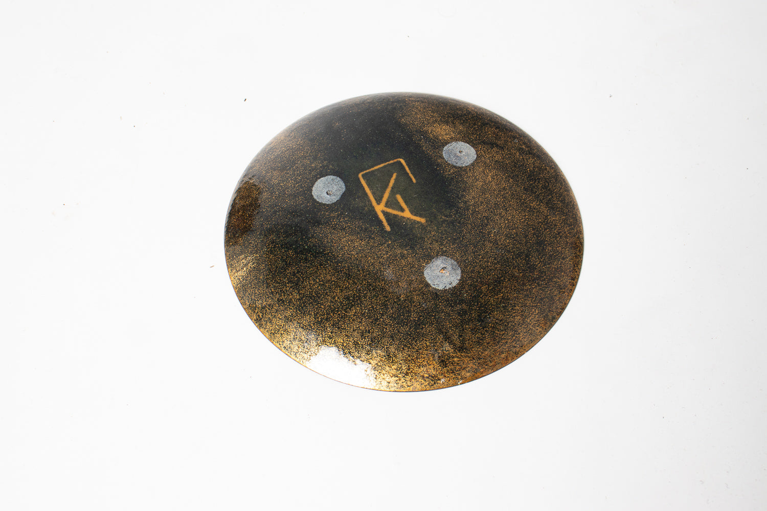 Set on copper and fired to a luminous gloss, the surface has depth and subtle texture, with tiny speckles and tonal shifts that reveal themselves as the light moves. The underside retains its original artist’s mark.