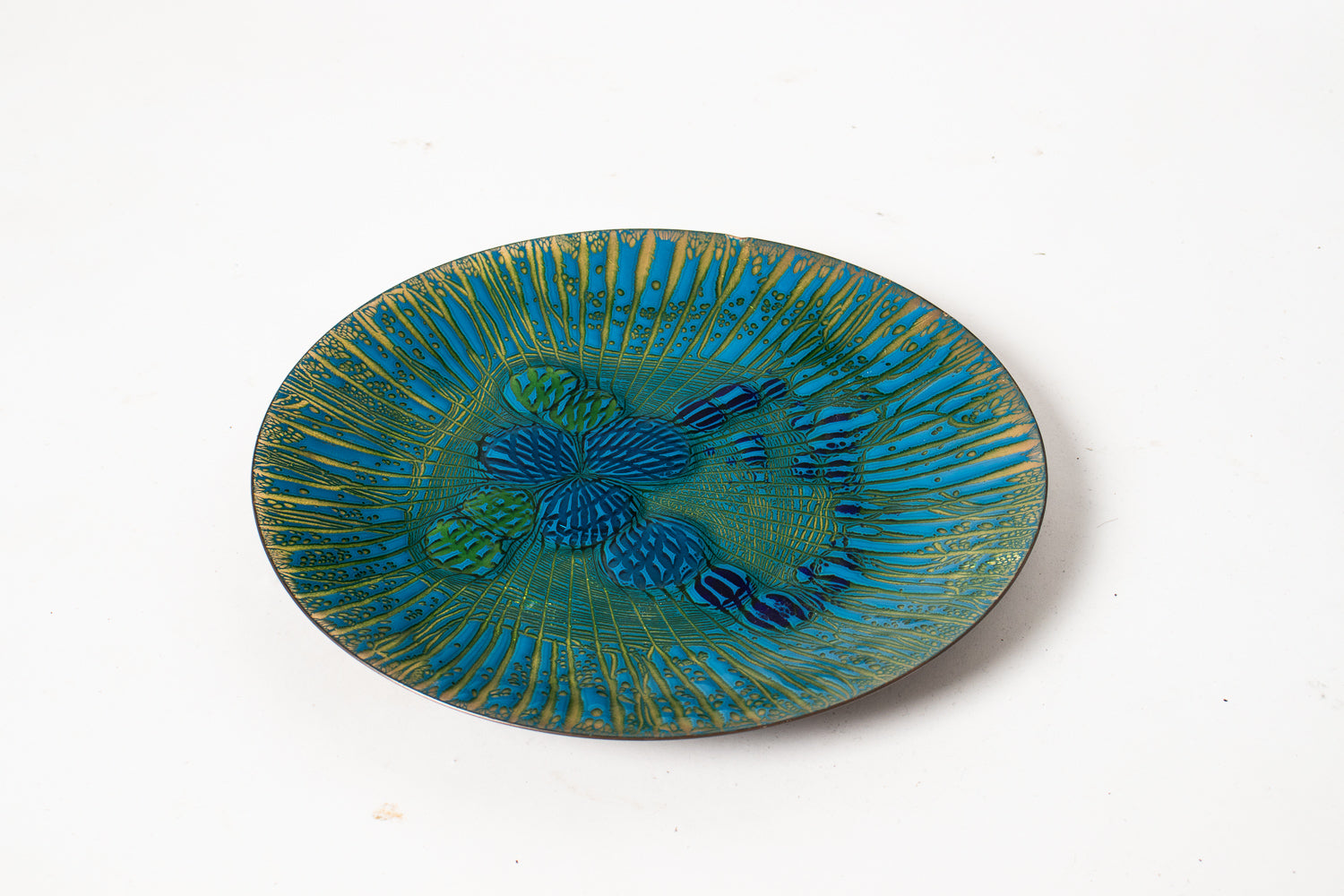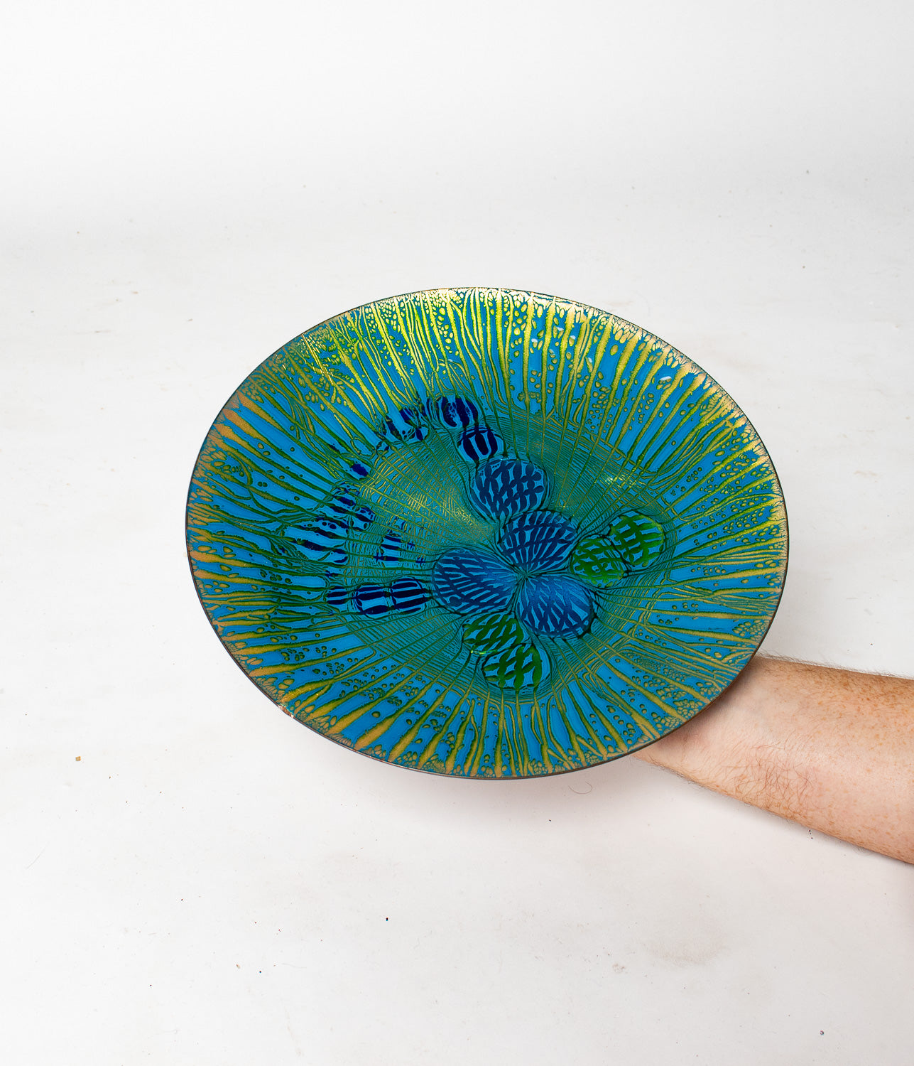 A vibrant and sculptural enamel plate by California studio artist Annemarie Davidson, part of her celebrated Ghostline series. This piece features an exceptional composition of layered blues and greens, with radiating etched linework that creates movement and a sense of depth. The clustered, hand-applied enamel forms at the center feel almost botanical or aquatic, giving the plate a lively, organic energy.