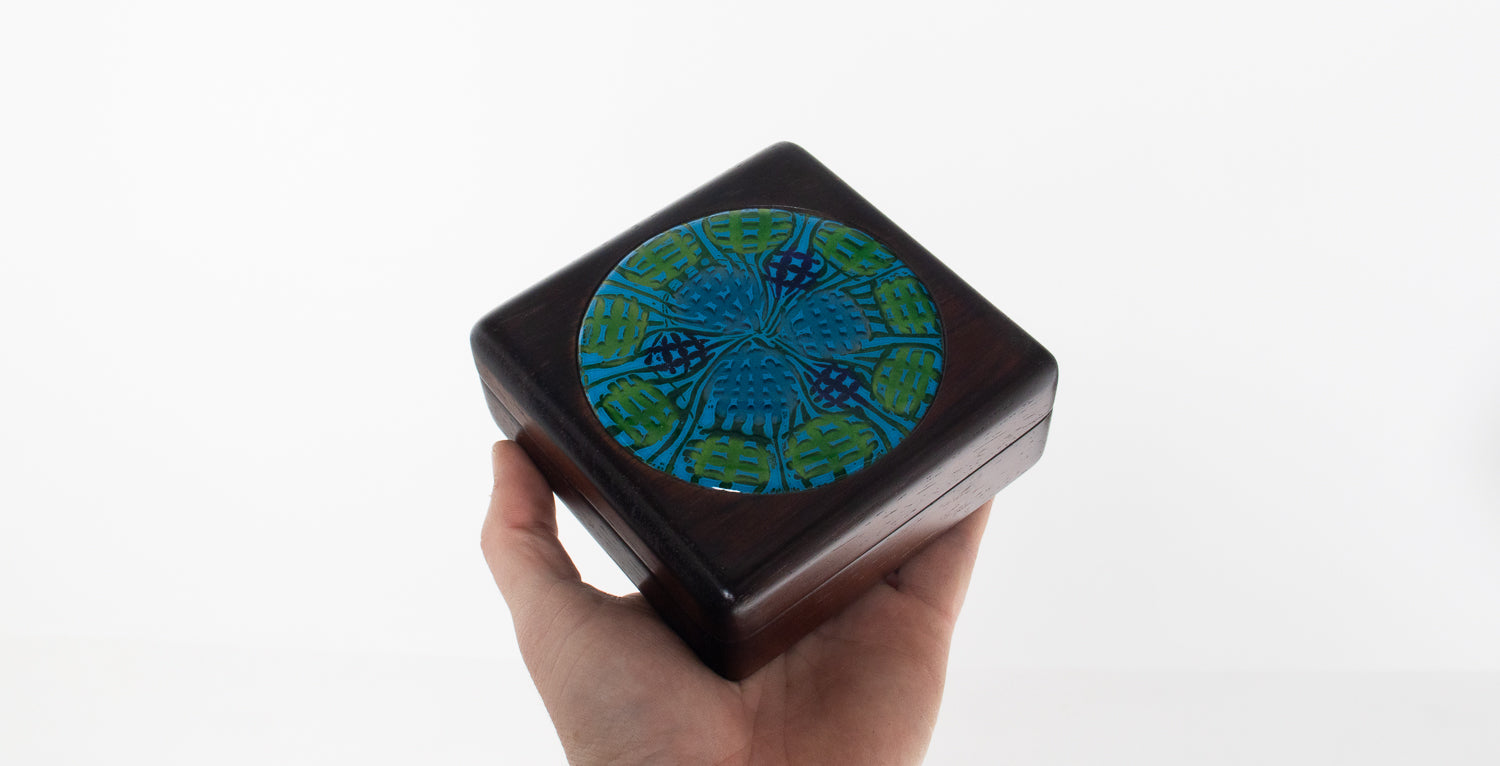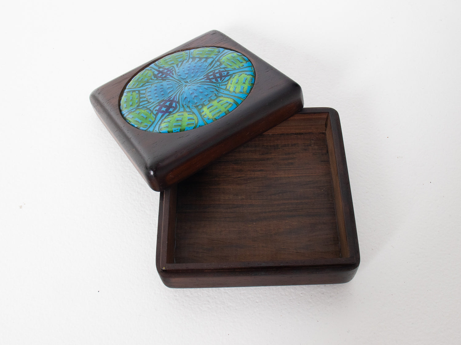 The lid features a vibrant Ghostline enamel composition in layered blues and greens, alive with Davidson’s signature rhythmic patterning and subtle sense of movement. The enamel’s depth and color saturation contrast strikingly with the richness of the rosewood, whose warm tone and fine grain lend the piece both visual weight and refinement. The box is finely made, with softly rounded edges that feel deliberate and architectural in hand.