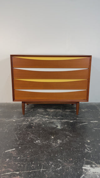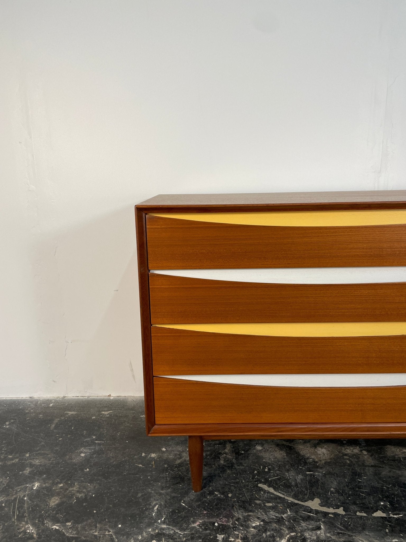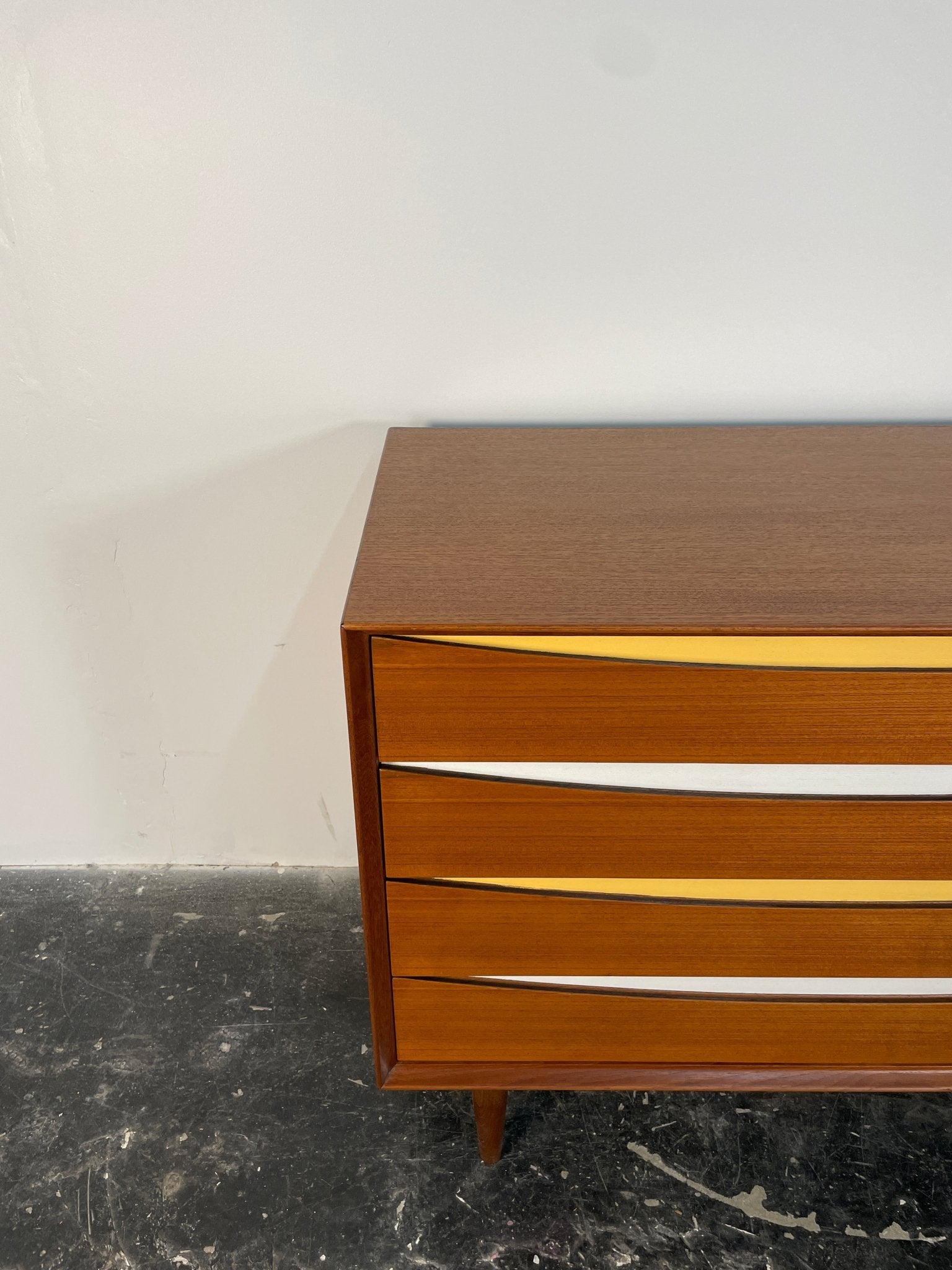 The piece is signed with Danish Control logos on the inside top drawer. This dresser has been completely restored by us and is in excellent condition. This is hands down the highest quality Danish dressers of the period. Circa 1950's.
