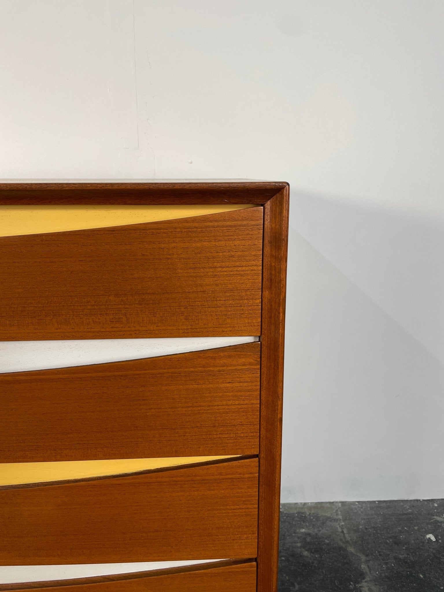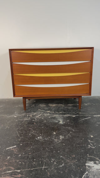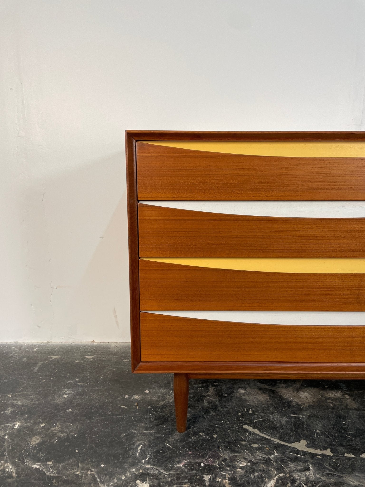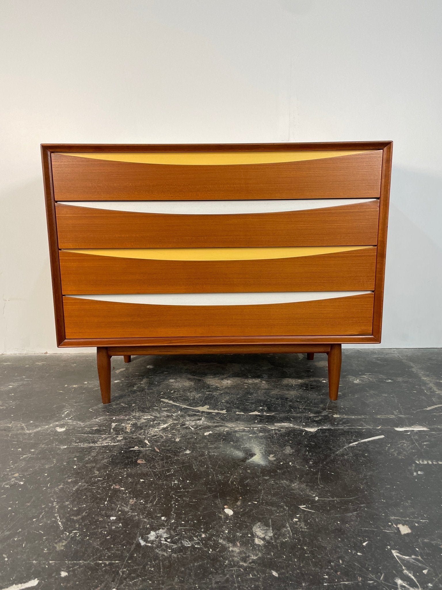 The piece is signed with Danish Control logos on the inside top drawer. This dresser has been completely restored by us and is in excellent condition. This is hands down the highest quality Danish dressers of the period. Circa 1950's.