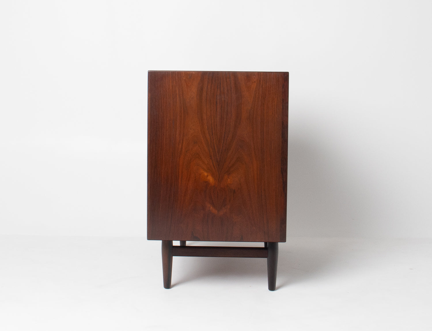 Sleek, sculptural, and unmistakably Danish Modern. This rare rosewood dresser by Arne Vodder presents a double bank of four drawers with Vodder’s signature crescent “smile” pulls carved directly into the fronts—no added hardware, just pure form and shadow. The case is clad in richly figured rosewood with deep, chocolate and redish tones with ribbons of lighter grain; sides and top show consistent, book-matched movement. A slim, bullnose perimeter frames the facade, floating above an integrated apron and four tapered legs that visually lighten the piece.