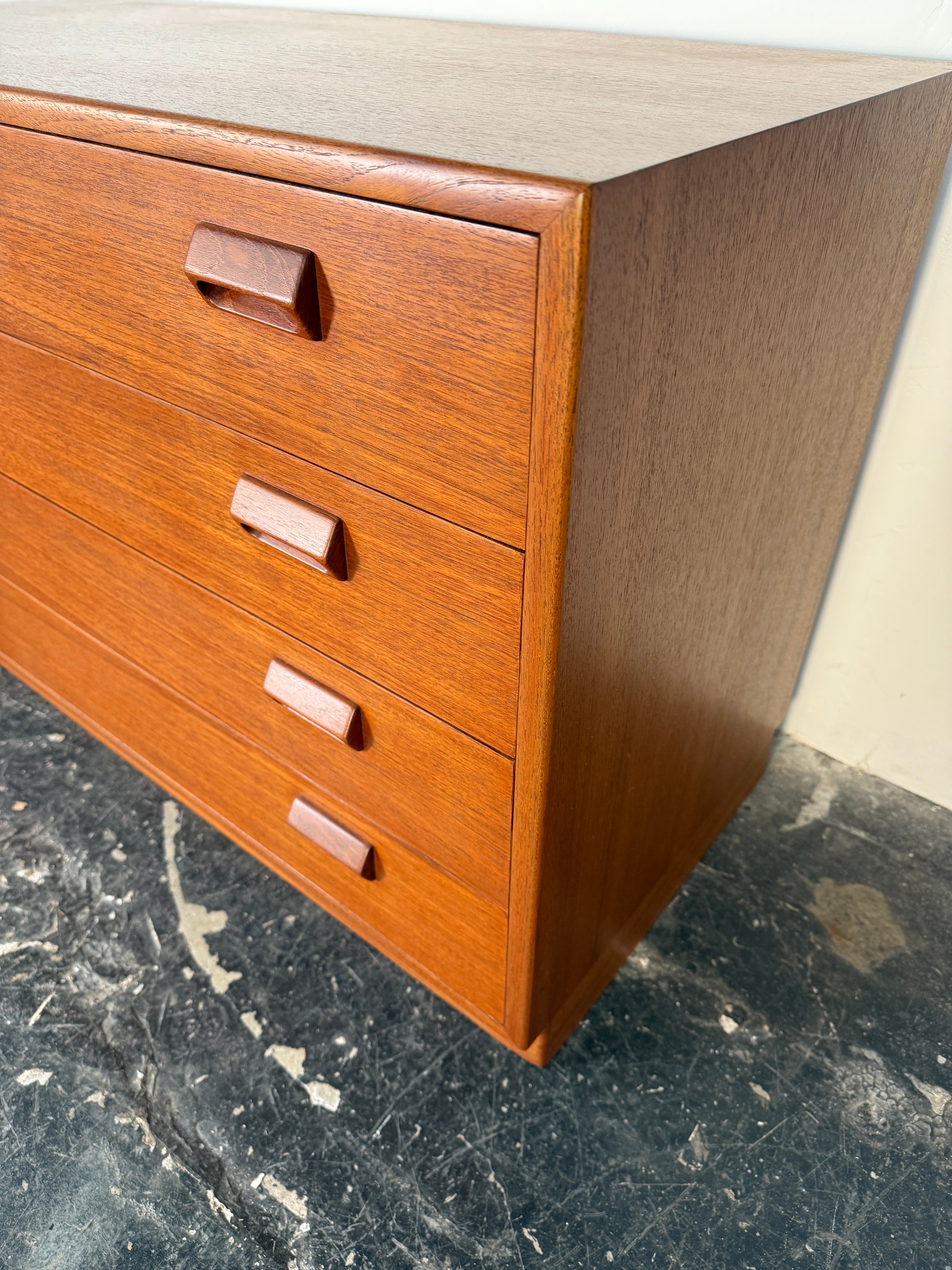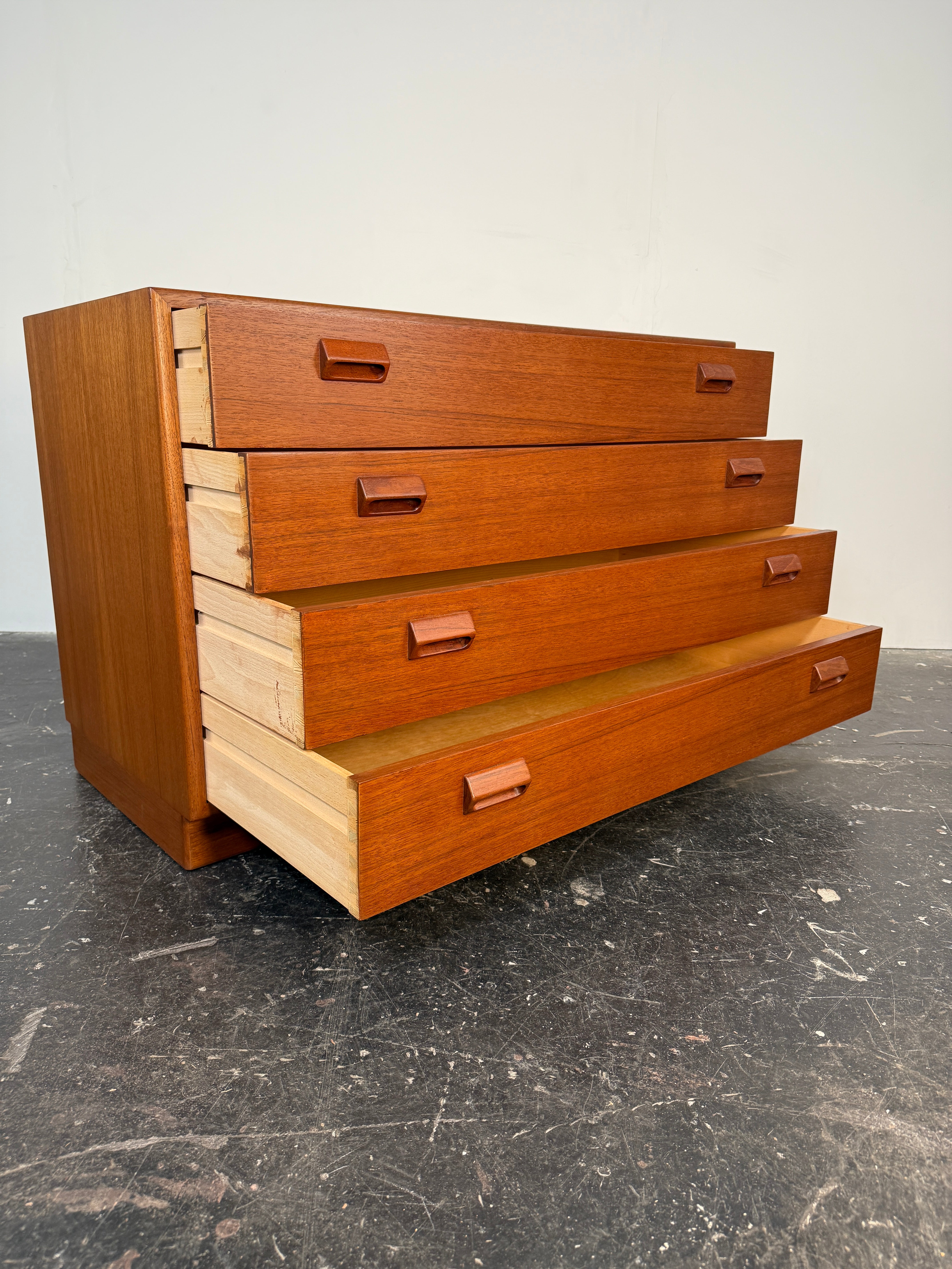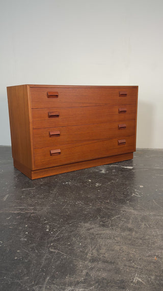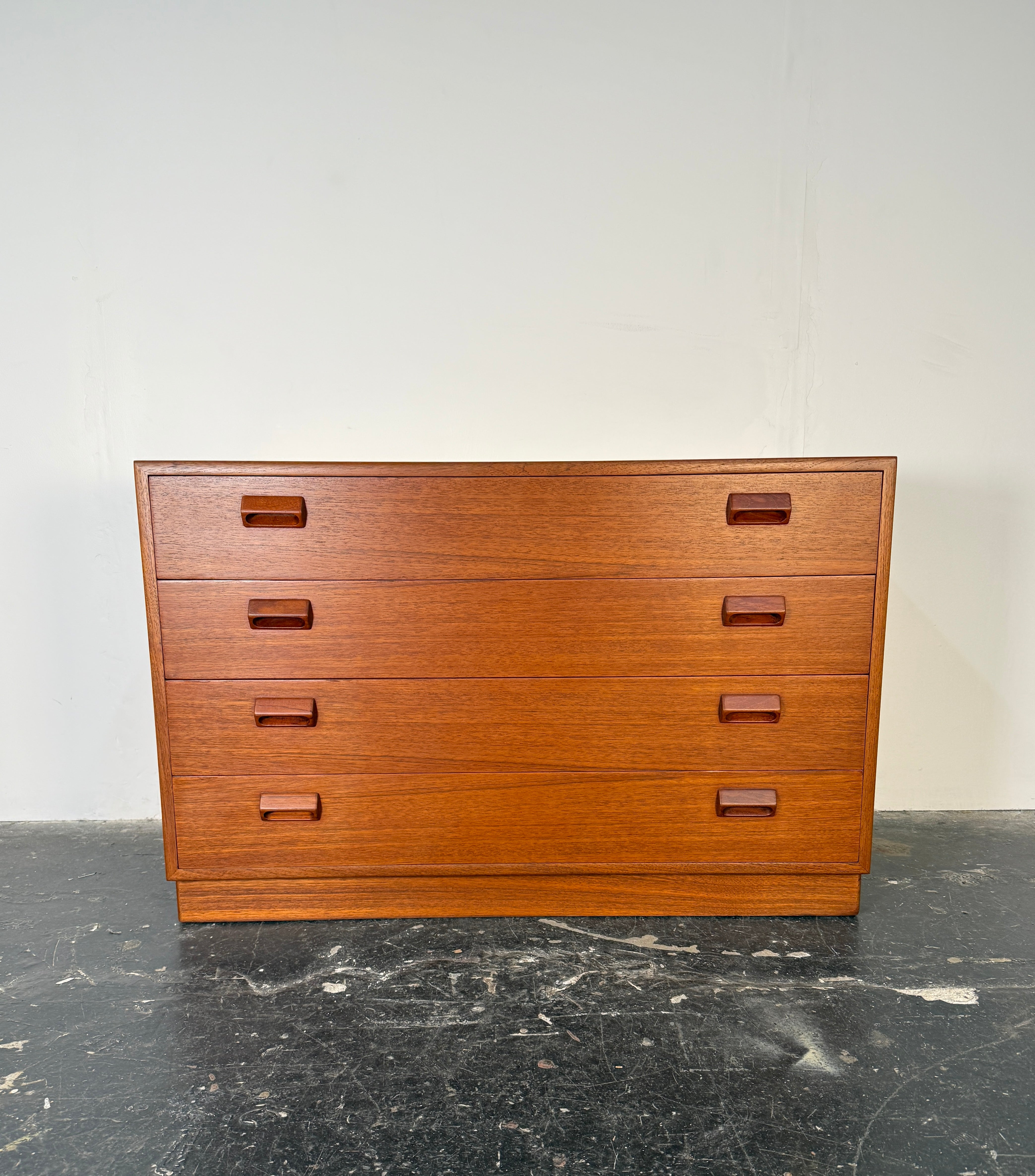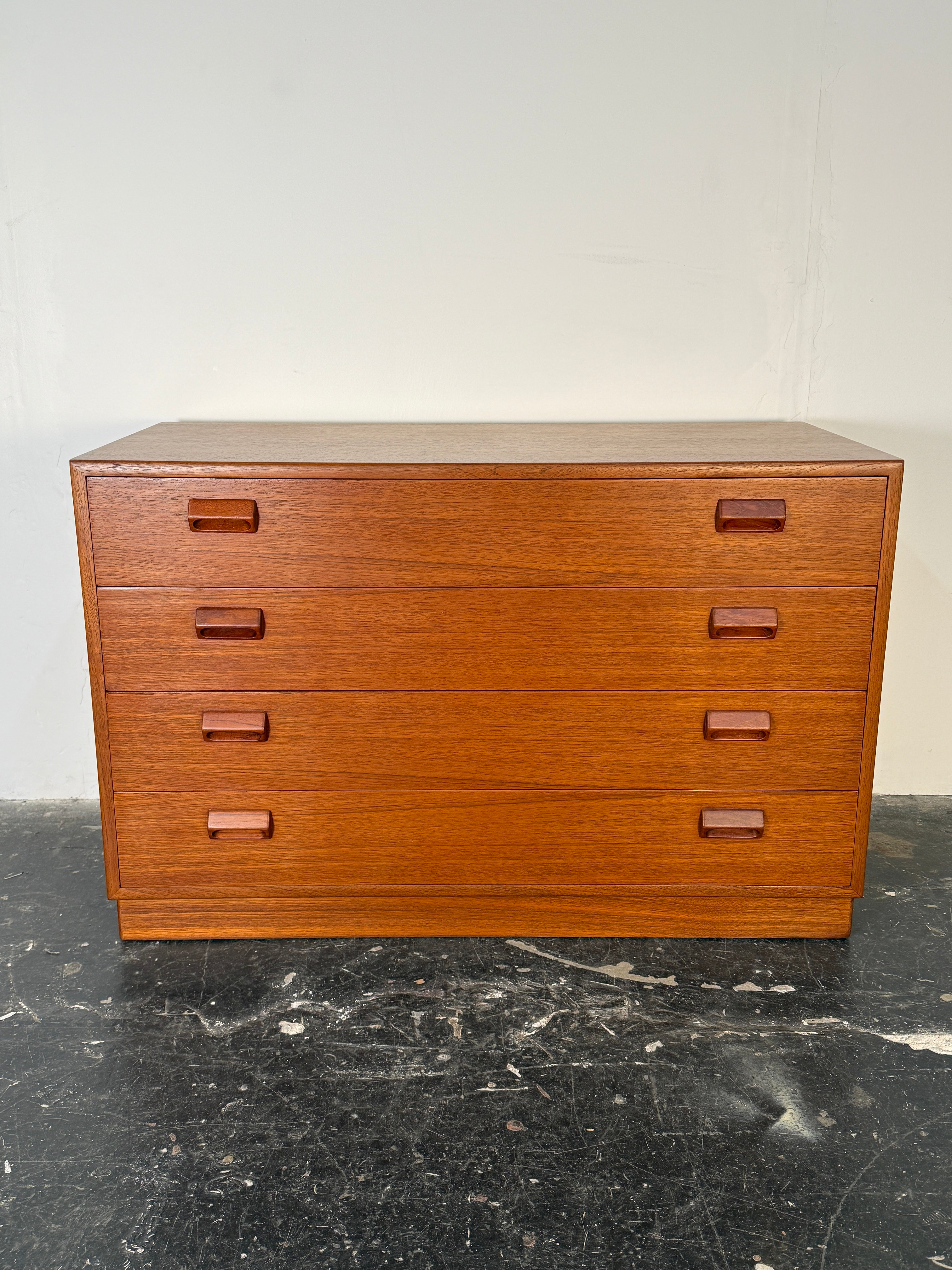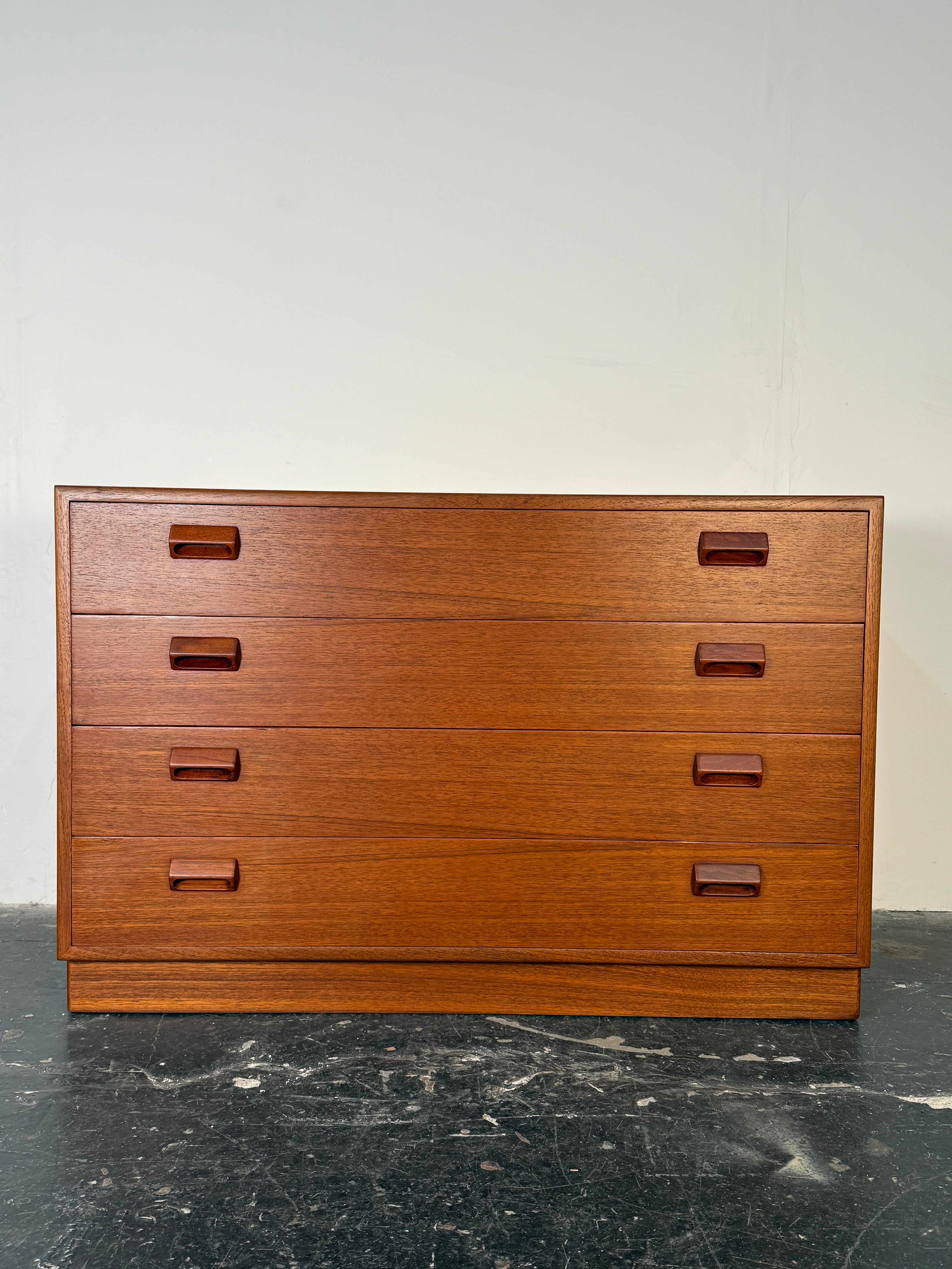 A study in refined utility, this 4-drawer dresser by Børge Mogensen showcases the designer’s iconic commitment to functional minimalism. Expertly crafted in richly grained teak, the piece exudes warmth and quiet sophistication. The clean-lined form is anchored by a solid plinth base, while sculpted inset drawer pulls offer a subtle but considered design detail.