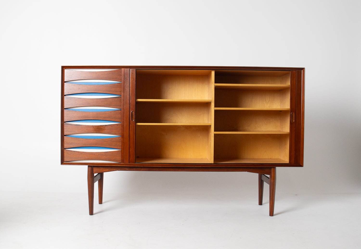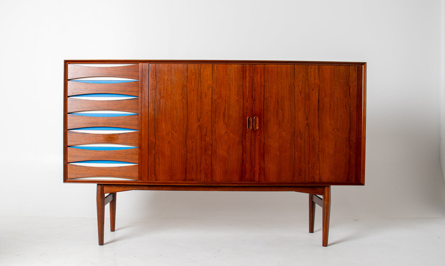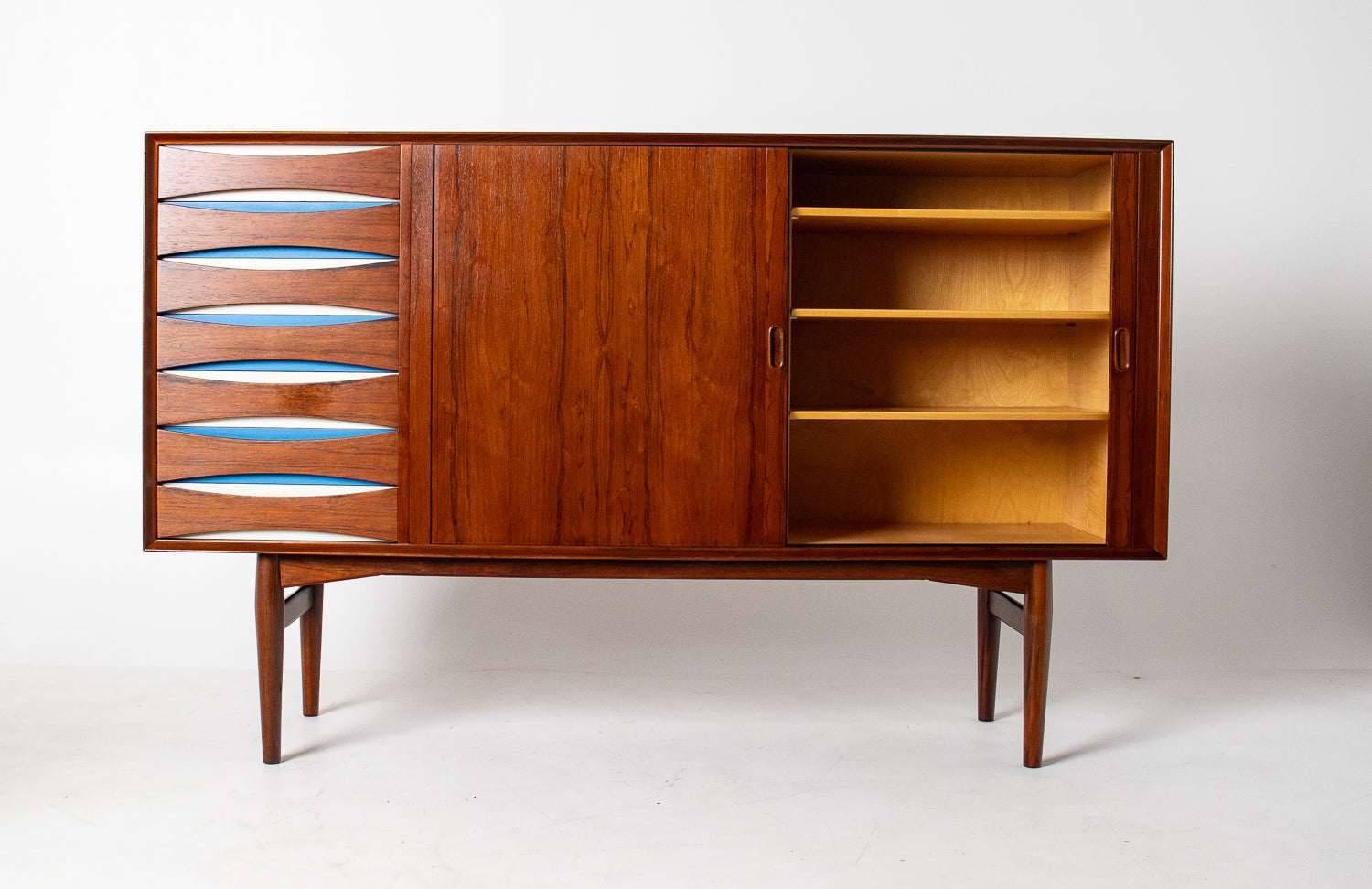 A rare and striking example of Arne Vodder’s celebrated cabinet designs, this credenza showcases his distinctive sculptural drawer fronts in a highly sought-after rosewood variant. Most known versions were produced in teak; finding one in richly figured Brazilian rosewood places this piece in a far more scarce tier of Vodder’s work. The wood grain displays deep warmth and a beautiful natural chatoyance, contrasted by the joyful interiors of the drawers in alternating blue and white.