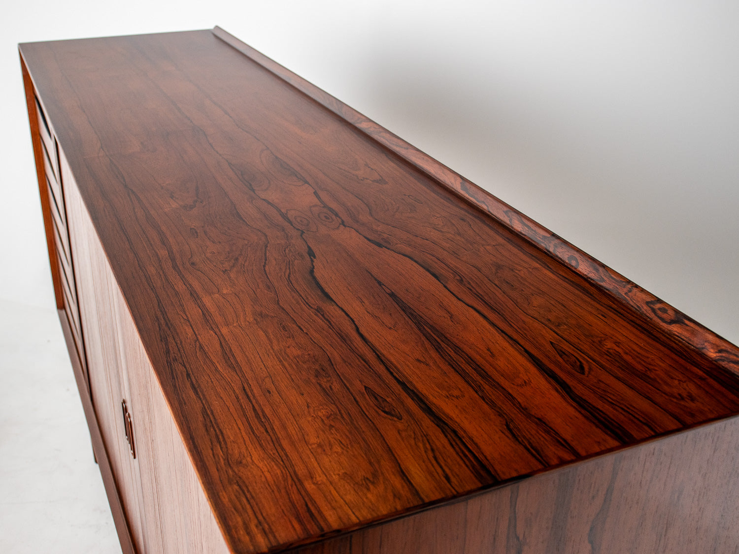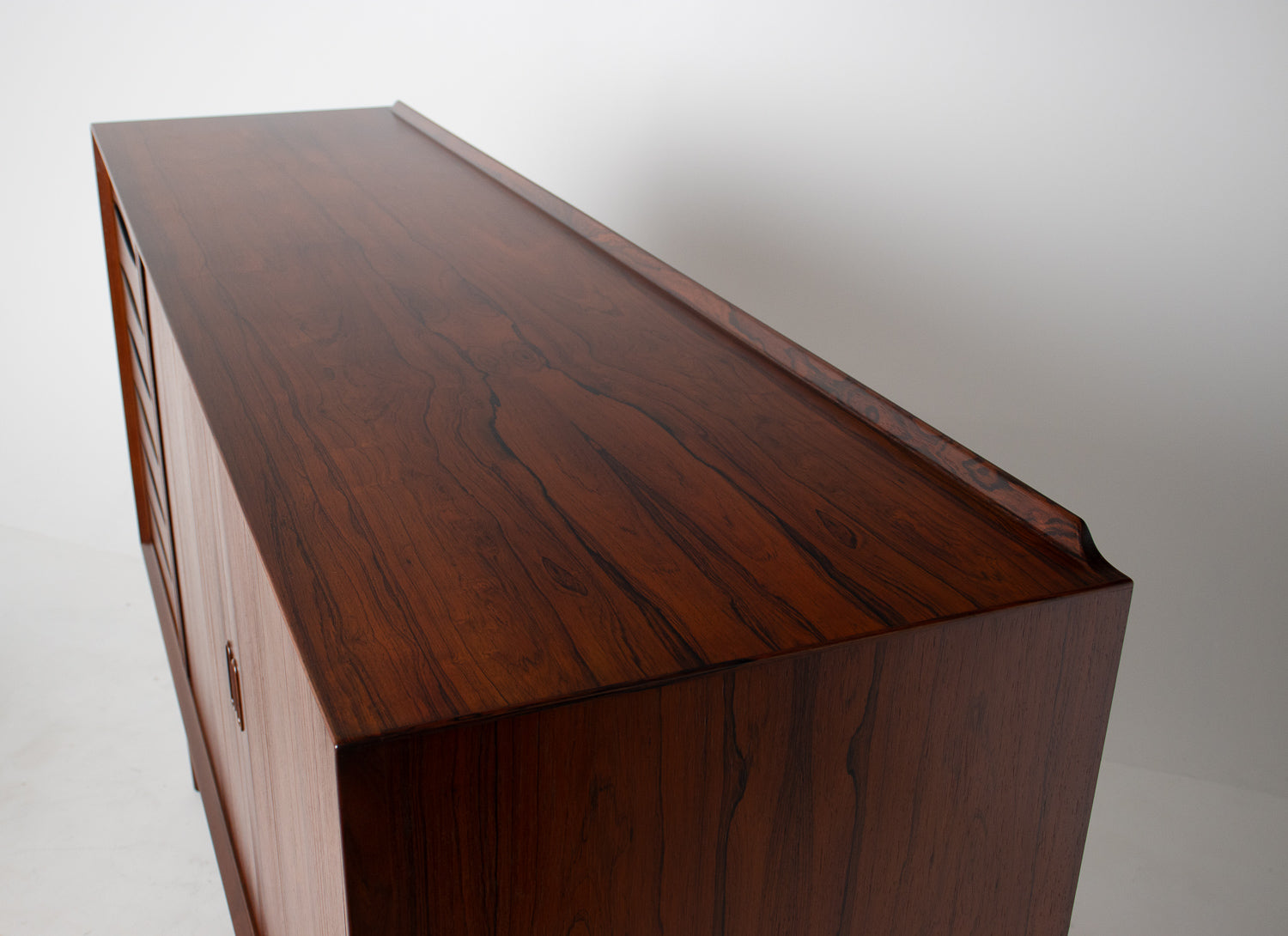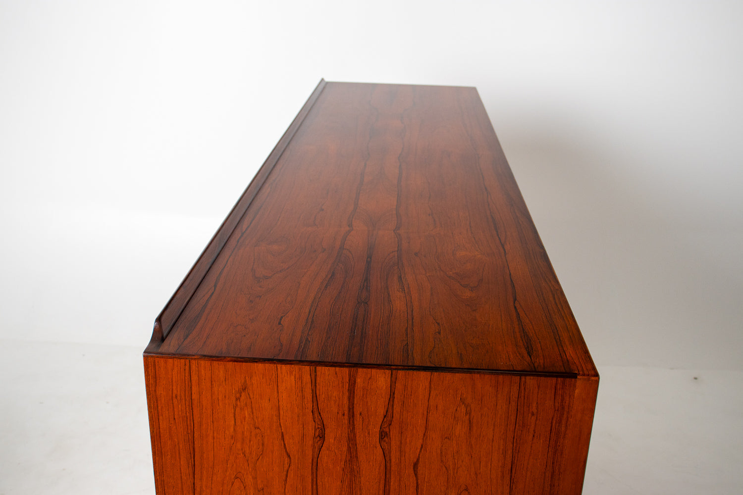 A rare and striking example of Arne Vodder’s celebrated cabinet designs, this credenza showcases his distinctive sculptural drawer fronts in a highly sought-after rosewood variant. Most known versions were produced in teak; finding one in richly figured Brazilian rosewood places this piece in a far more scarce tier of Vodder’s work. The wood grain displays deep warmth and a beautiful natural chatoyance, contrasted by the joyful interiors of the drawers in alternating blue and white.