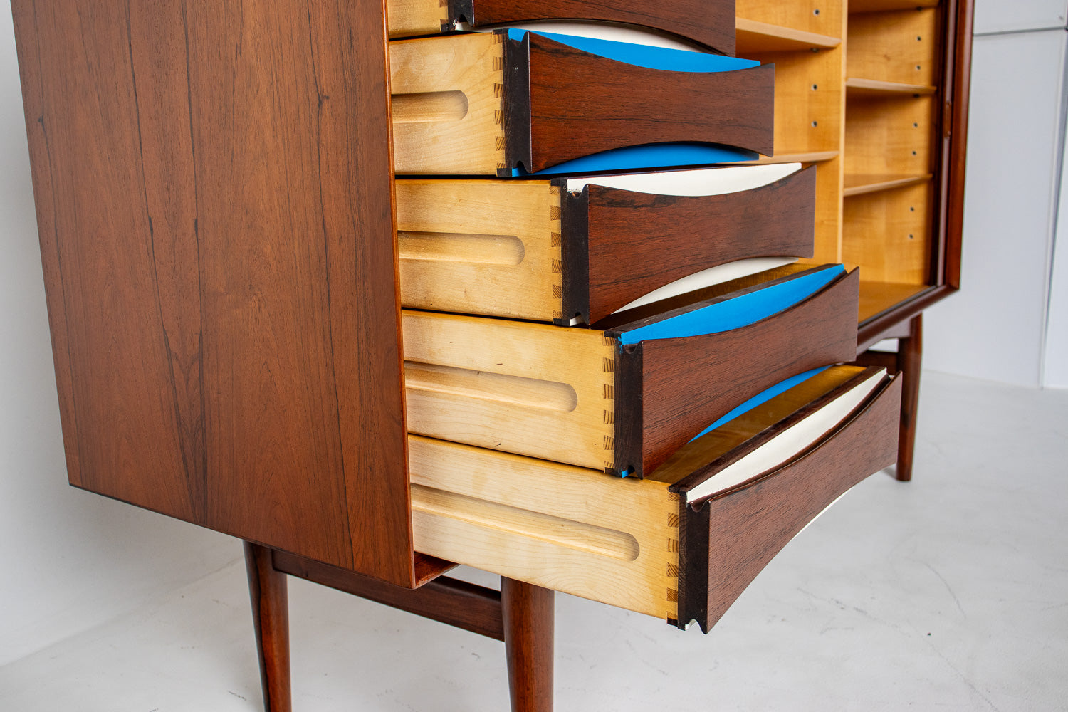 The painted drawer interiors were not merely decorative. Danish designers in the mid-century era intentionally used color to brighten interiors during the long, dim Scandinavian winters, bringing a sense of energy, optimism, and lightness into the home. Here, the soft blue and crisp white play off the organic rosewood, creating a visual rhythm that is both serene and sculptural.