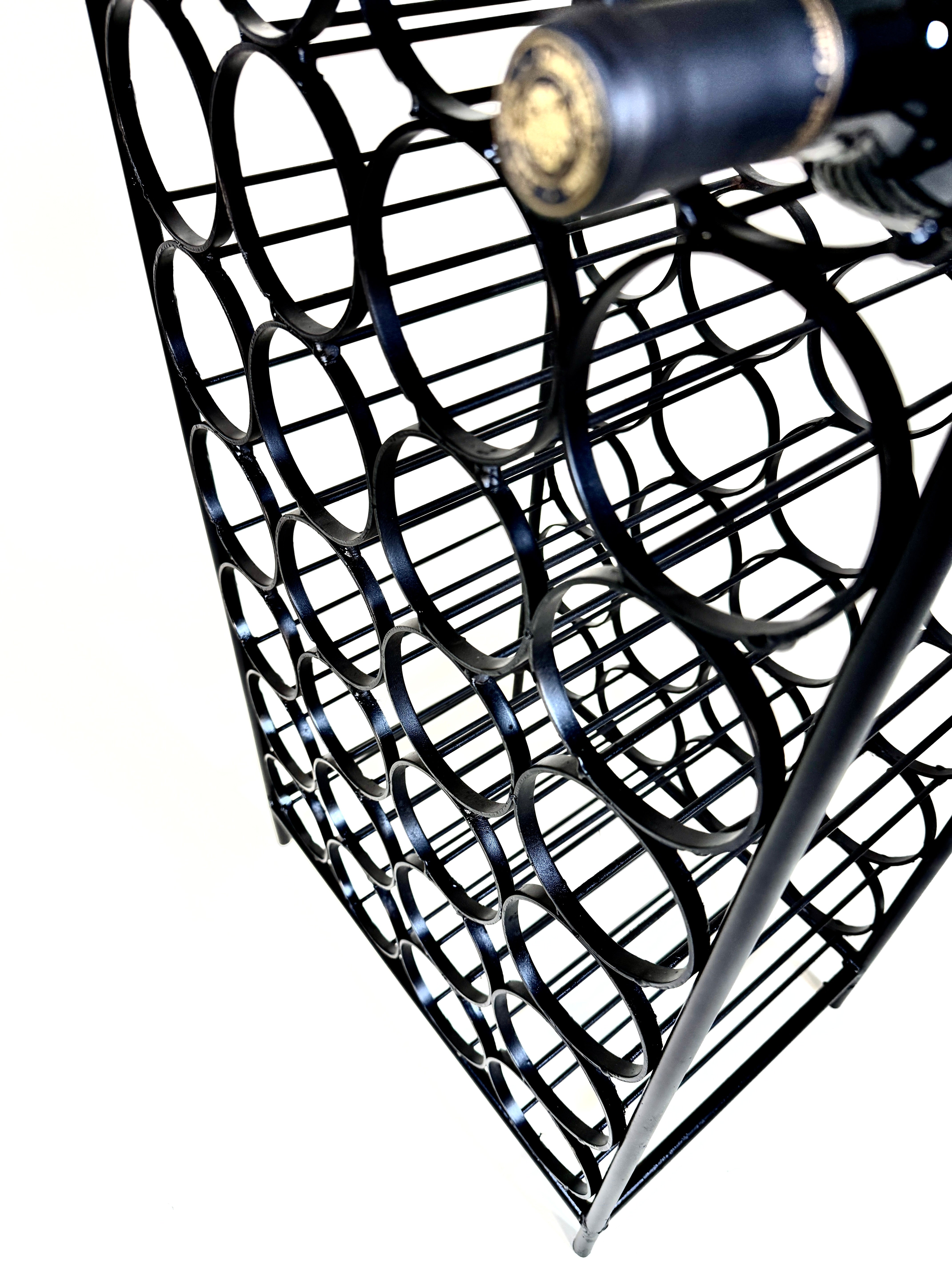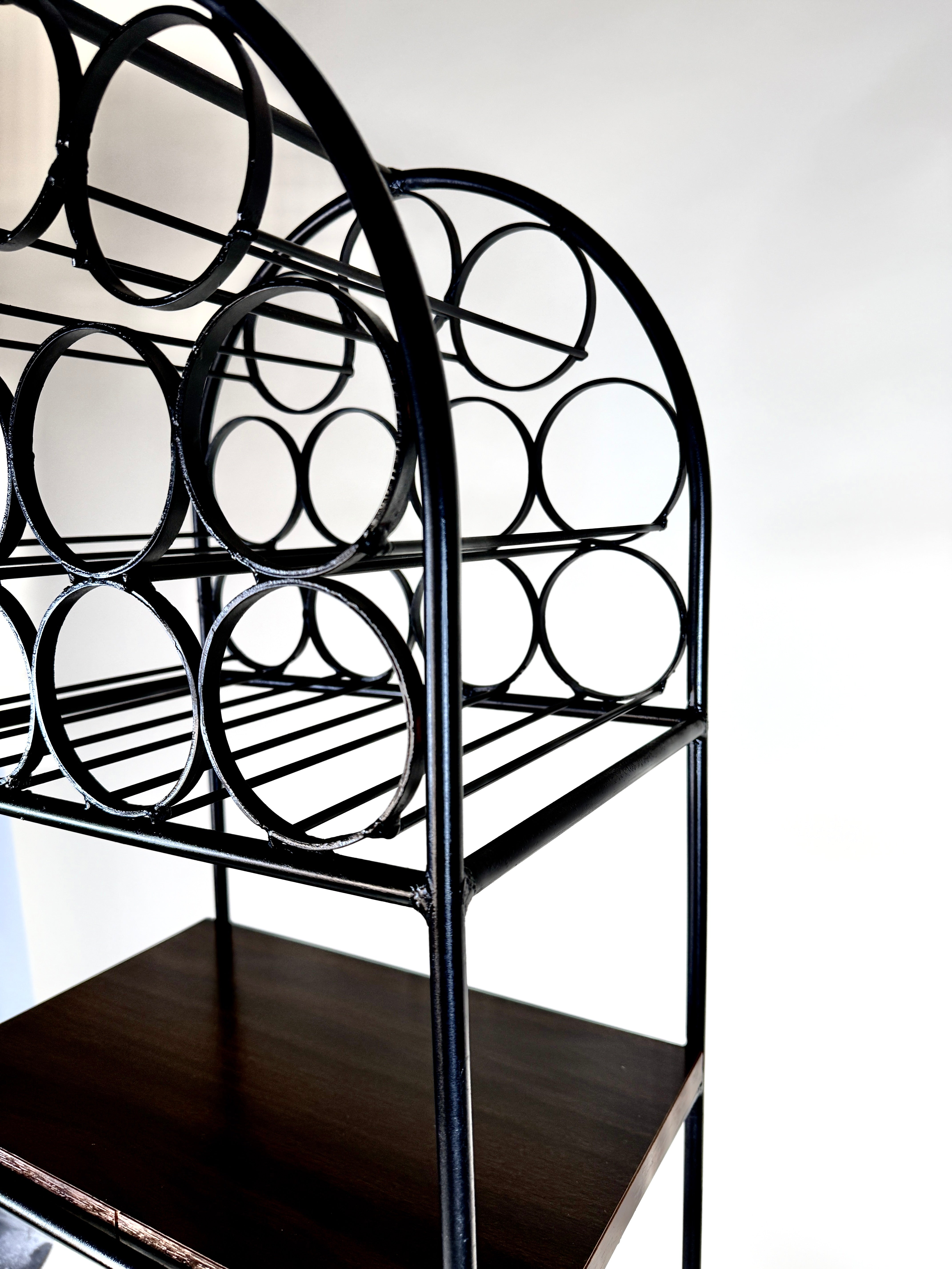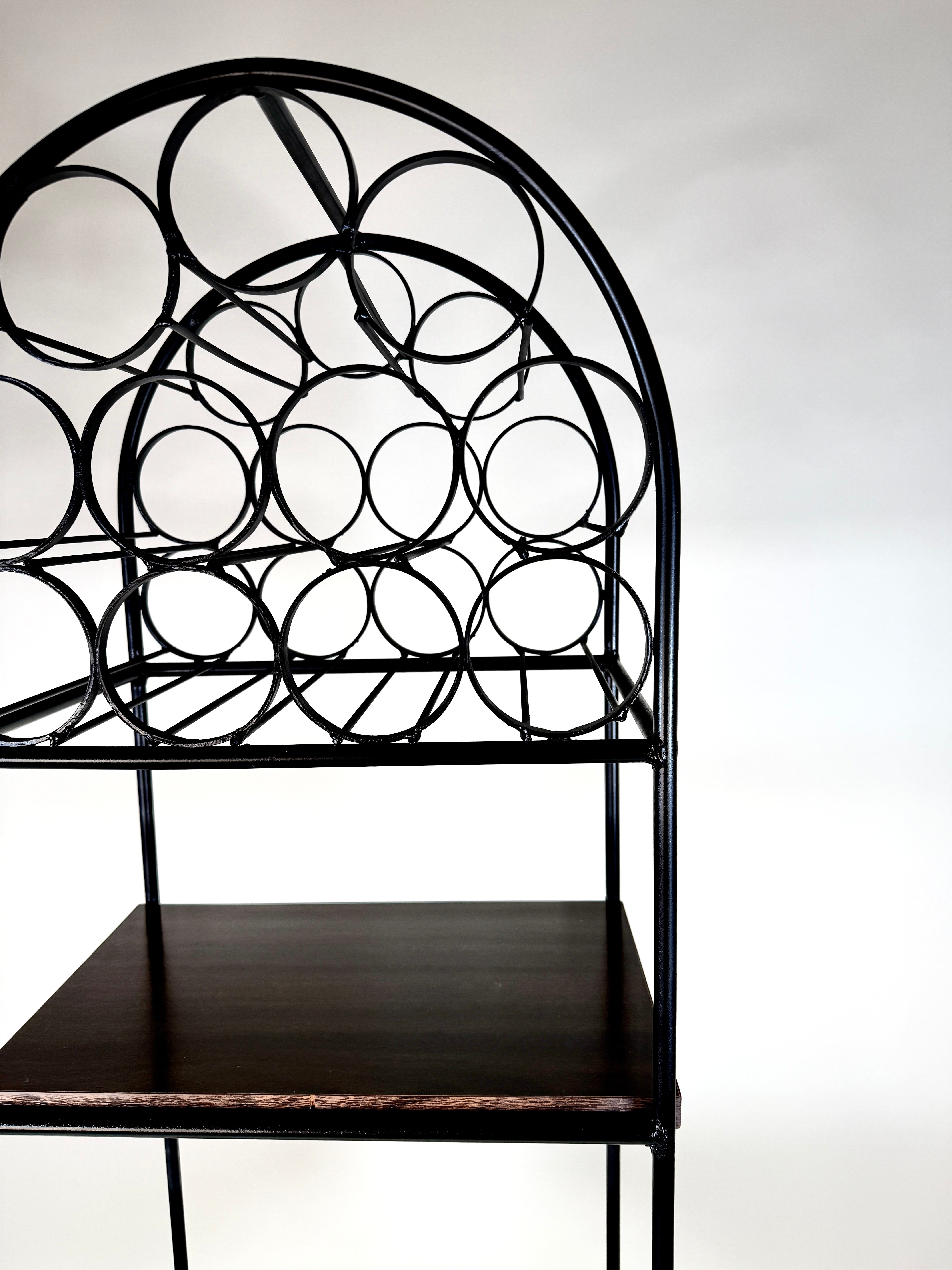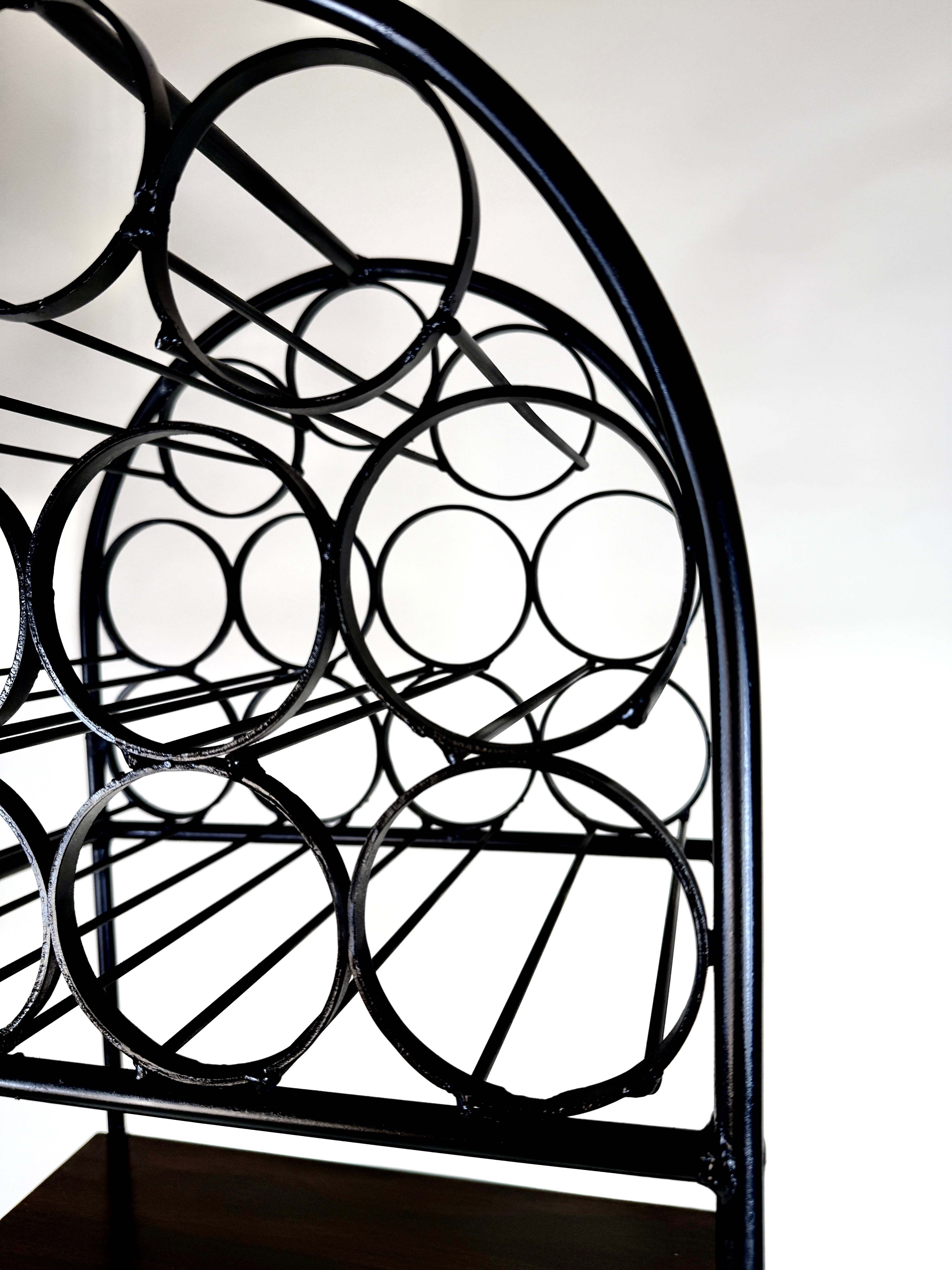 A sculptural and highly functional piece by celebrated American designer Arthur Umanoff, this vintage wine rack showcases his signature blend of modernist form and natural materials. Crafted from powder-coated wrought iron with circular wine bottle cradles, the piece holds both visual and structural presence.