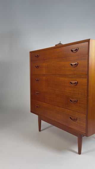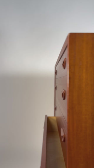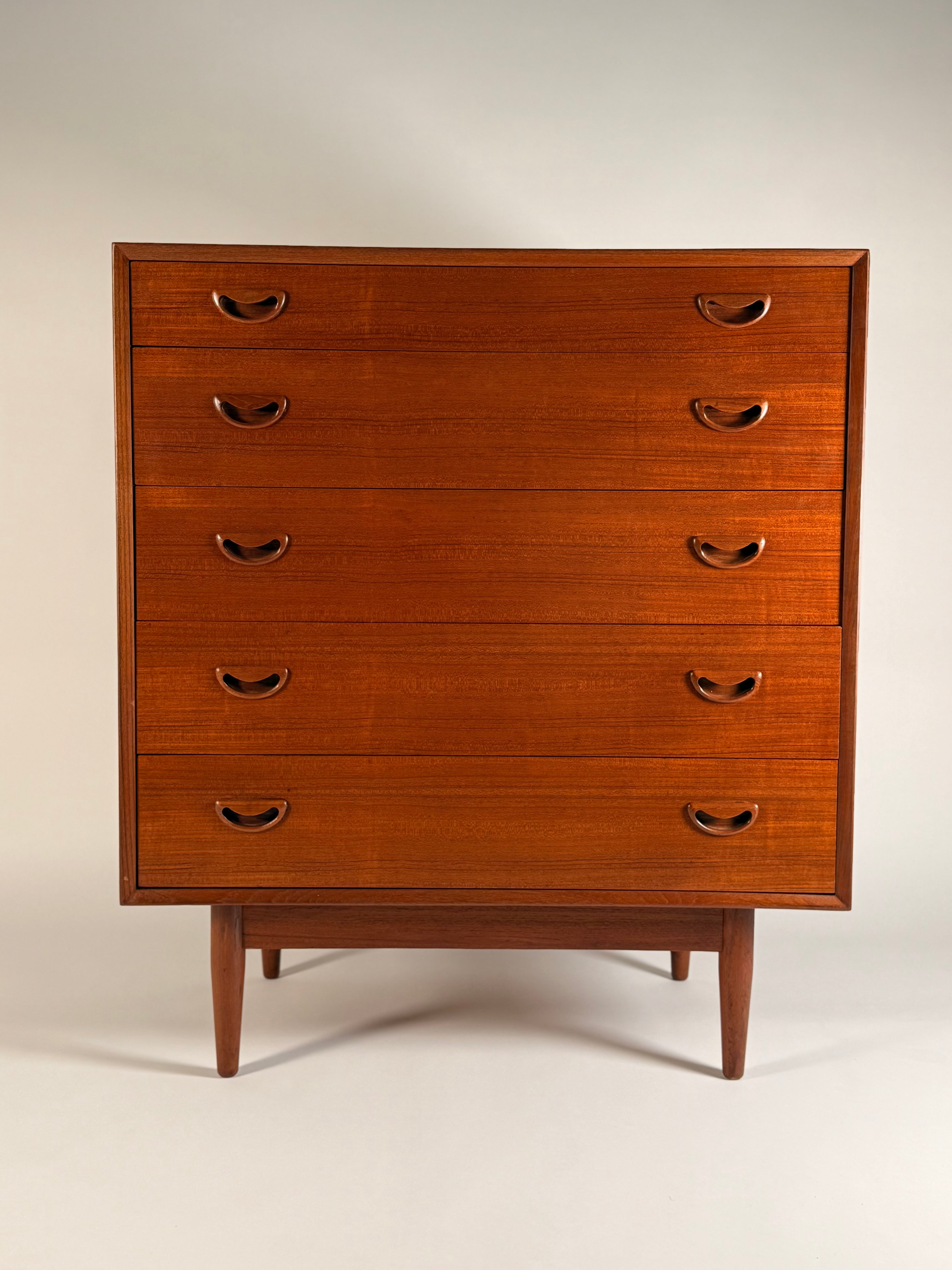 The dresser features a teak veneer case with solid wood edging, four spacious drawers with sculpted handles, and sits atop tapered solid teak legs. A timeless and functional addition to any modern interior, this piece offers generous storage while maintaining a light, elegant profile.
