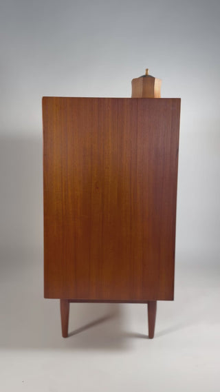 A beautifully constructed Danish Modern dresser evocative of Peter Hvidt’s refined aesthetic. Though the designer is unknown, the piece is stamped “Made in Denmark” and clearly reflects the hallmarks of mid-century Danish craftsmanship—clean lines, understated details, and superb joinery.