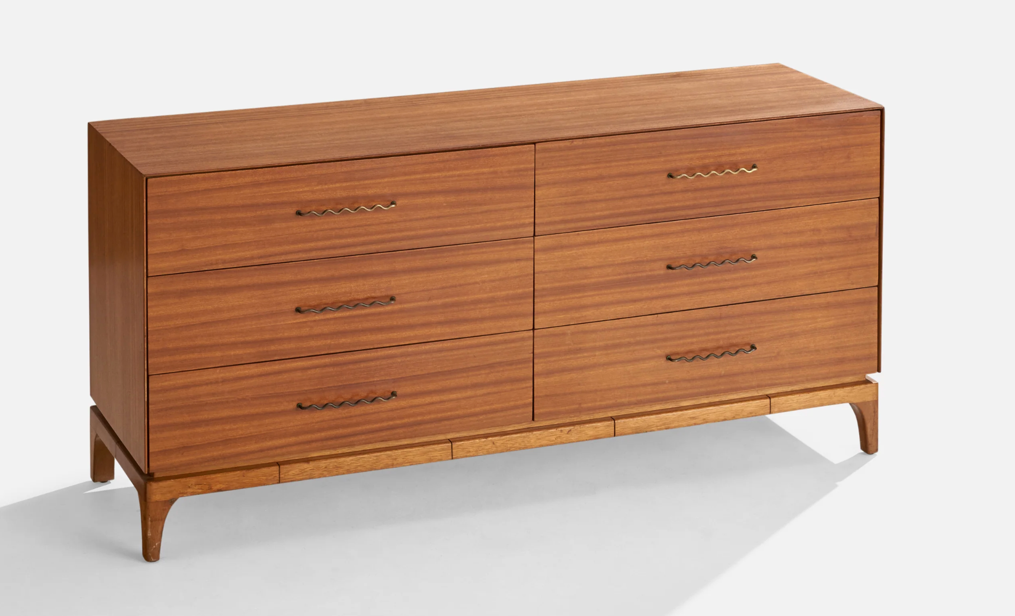 The dresser’s clean, rectilinear case floats lightly above its sculpted mahogany base, giving the cabinet a sense of lift and elegance. Across the drawer fronts runs one of the most distinctive details of the design: a set of unusual, zig-zag cast brass pulls. These pulls create a rhythmic visual line across the dresser, adding texture, movement, and a subtle touch of whimsy to the otherwise minimalist form. They read as jewelry against the warm mahogany — a signature Keal detail that collectors instantly recognize.