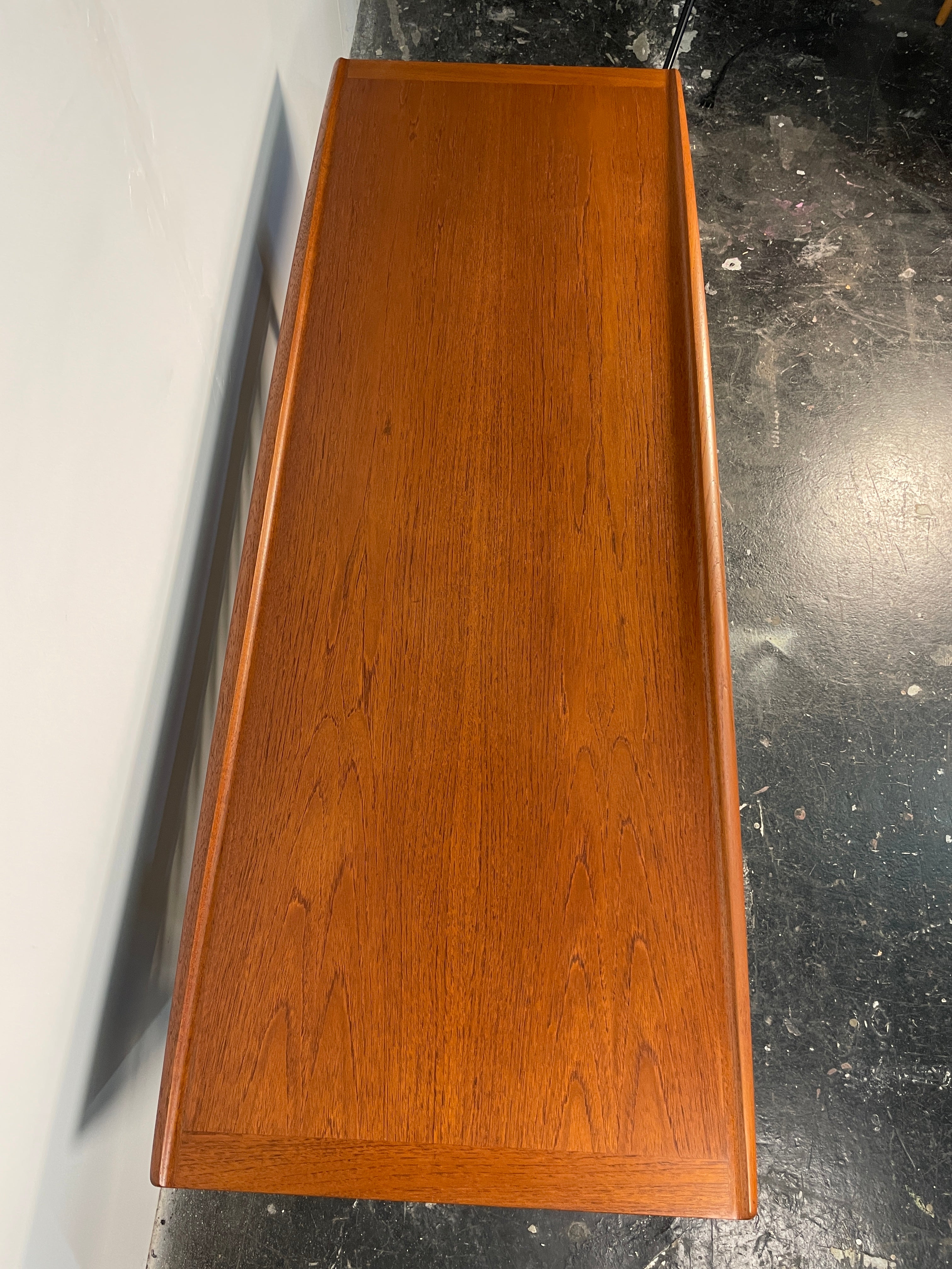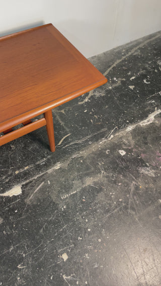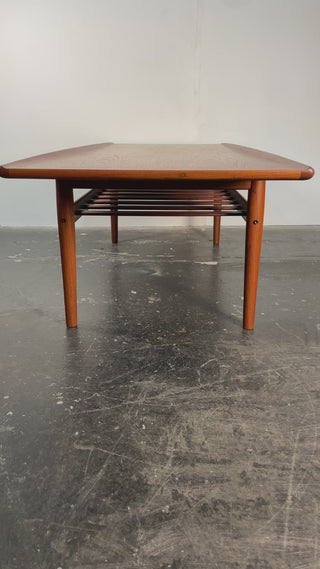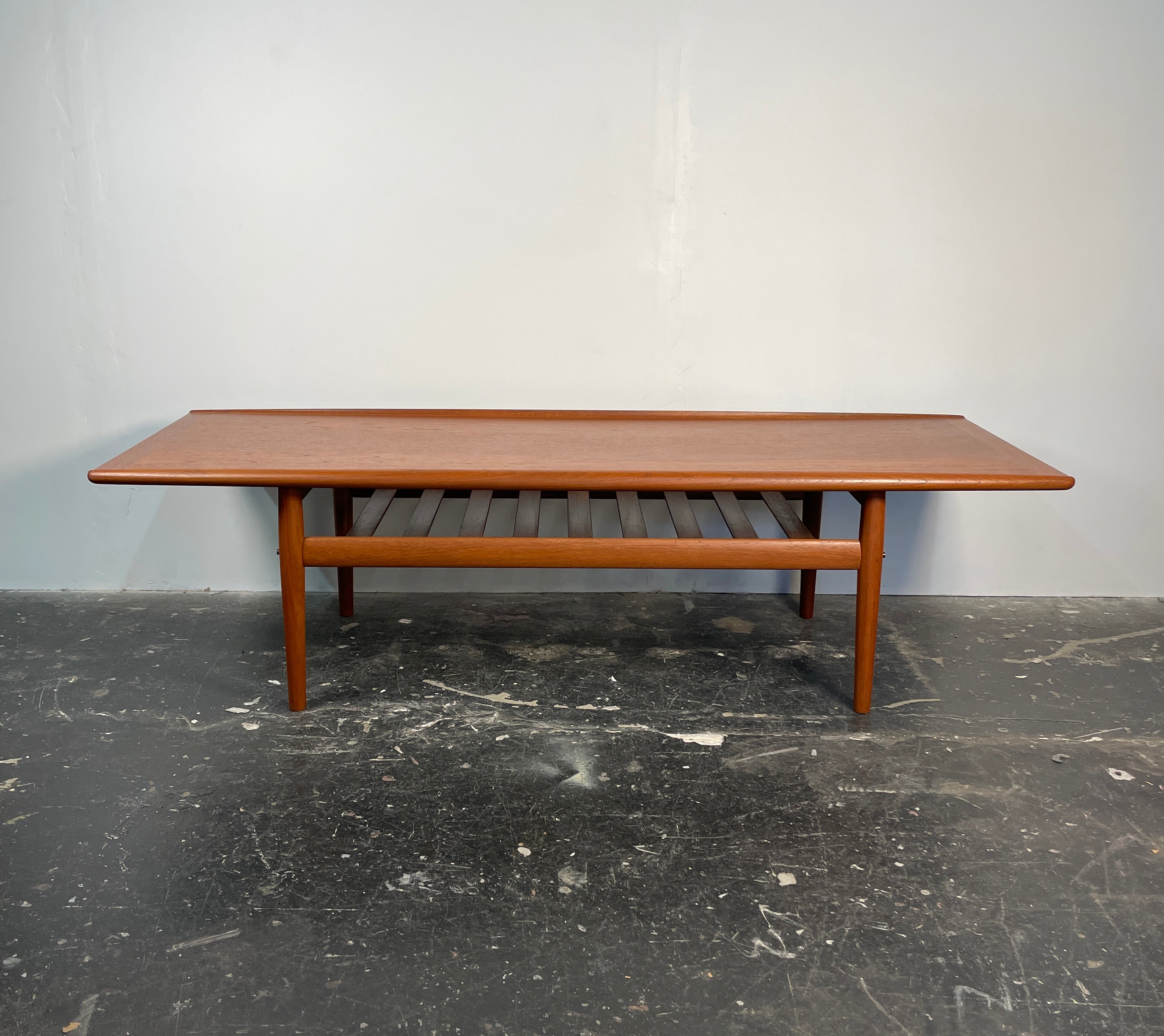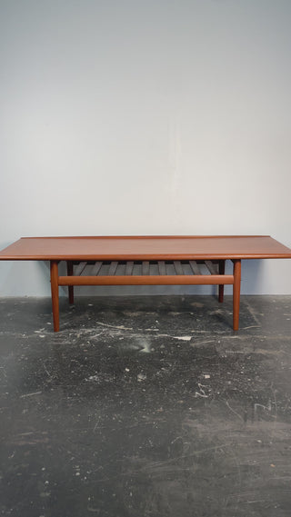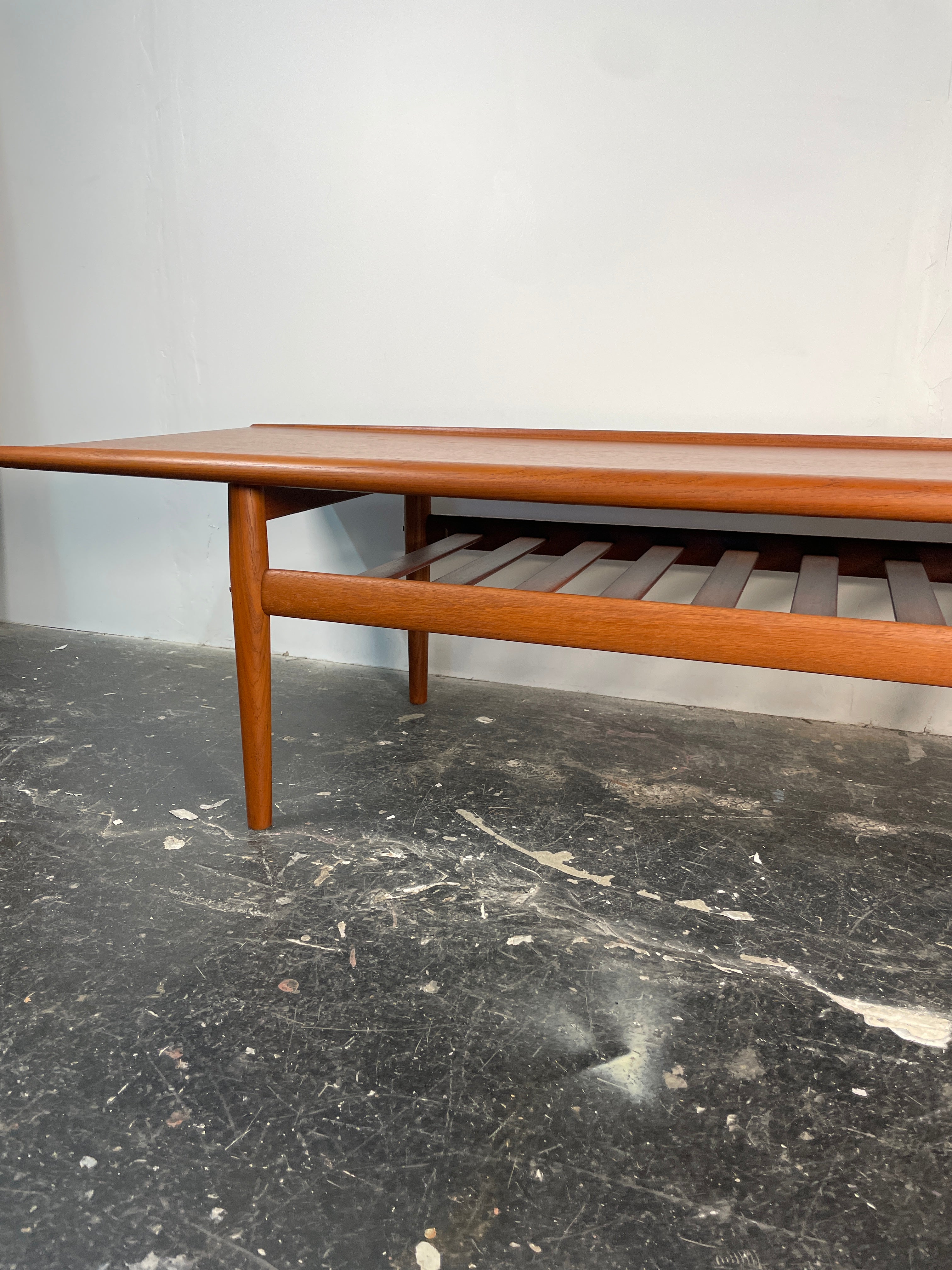 Grete Jalk for Glostrup Teak Coffee Table in teak. Beautiful wood grain with raise edge in solid teak. Slatted second self is perfect for holding design books or magazines.