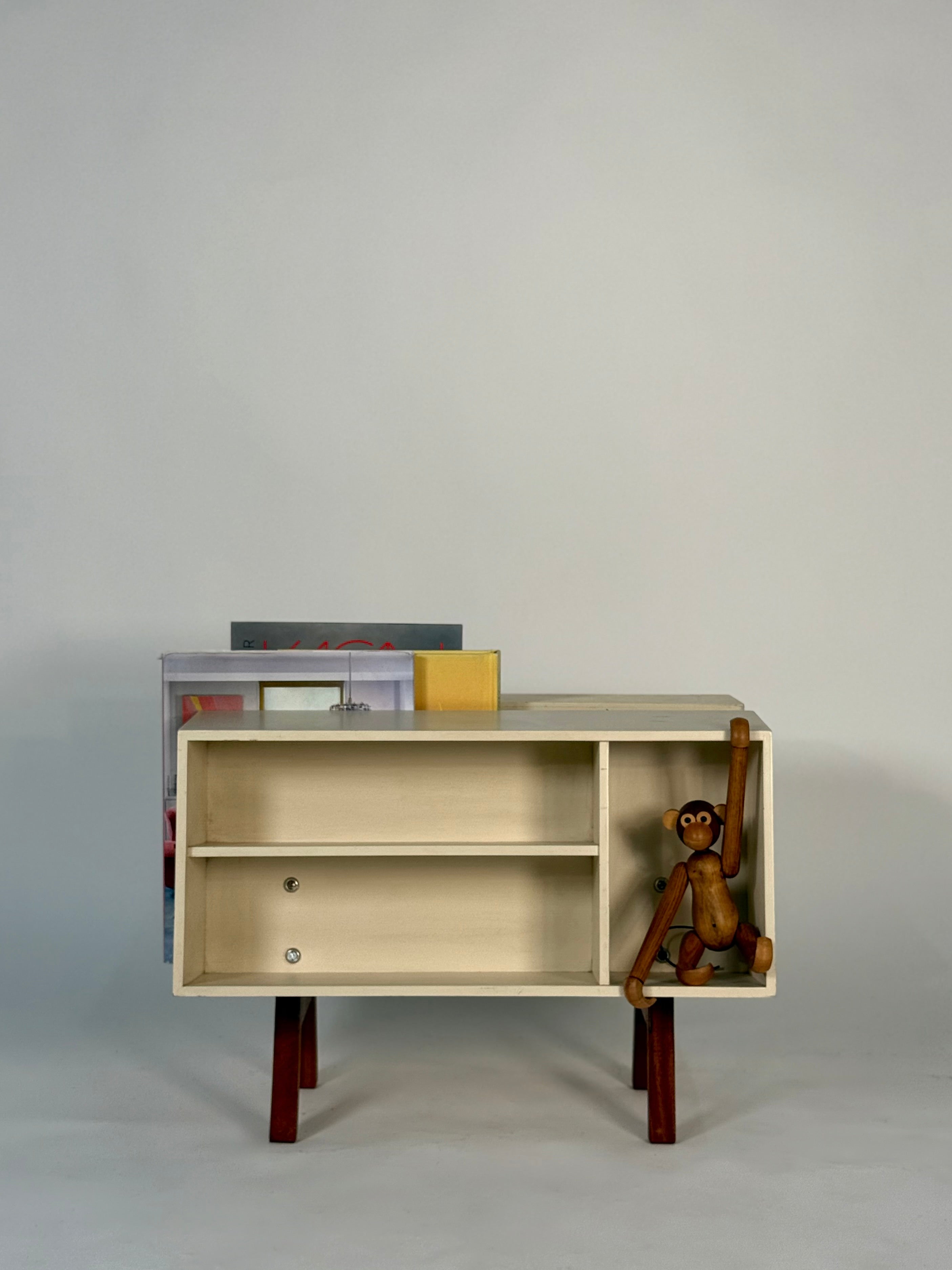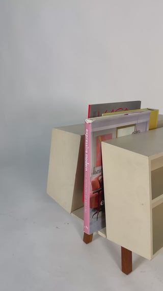 Scarce petite Penguin Donkey Mark 2 bookcase by Ernest Race for Isokon, 1963, England. Originally designed in the late 1930s by Egon Riss and called "The Donkey" because it looked like the saddle panniers that hang on the animals, production was stopped after only 100 or so were made before the war. This version is called the Penguin Donkey Mark 2 and was reimagined by Ernest Race in 1963 for Penguin Books because the small bookcase stored the orange Penguin paperback books nicely. Penguin offered them for sale to their readers via mail order. Not many vintage models surface - especially in the United States. This is an original example from 1960 in very nice vintage condition.ย