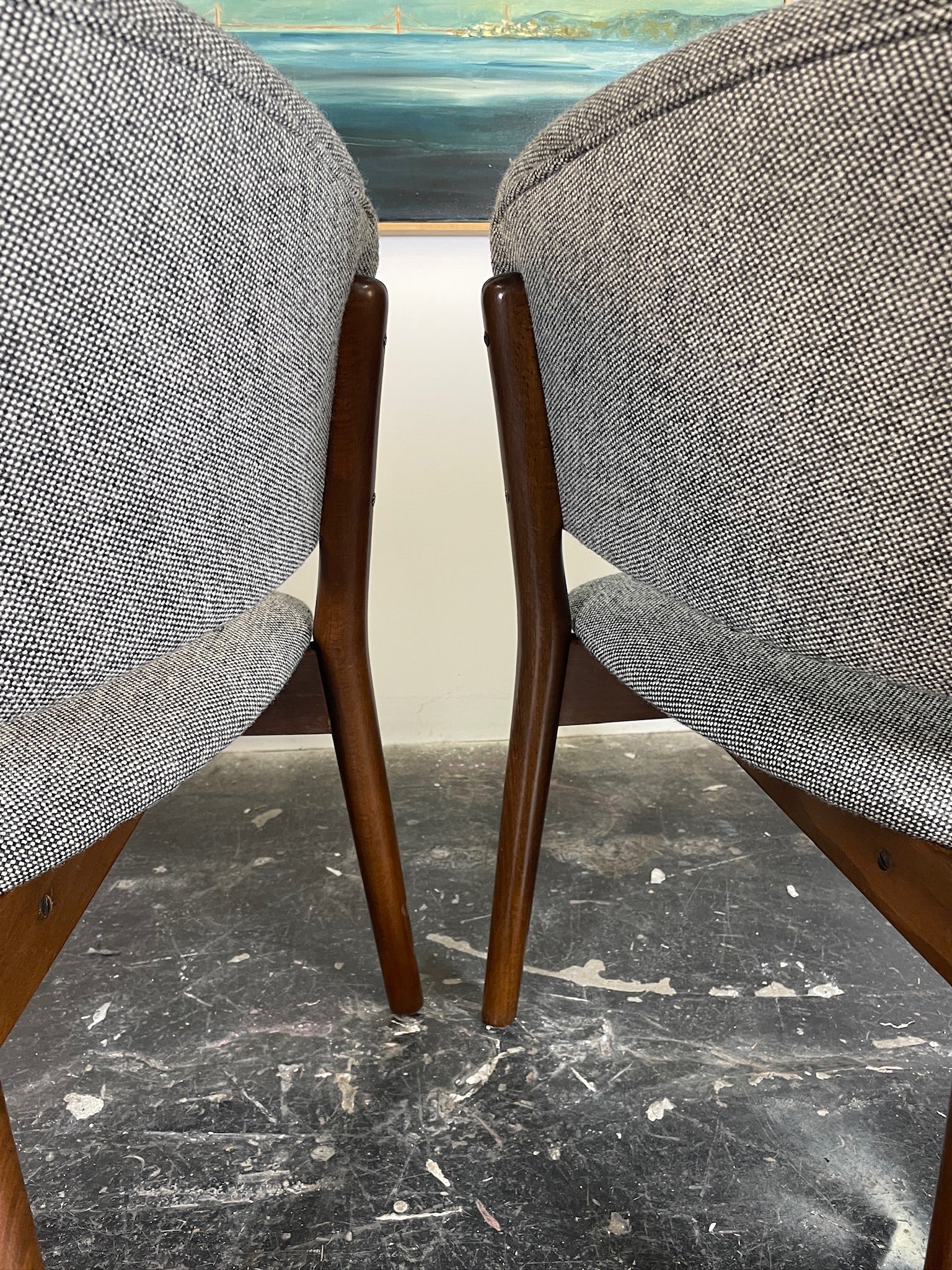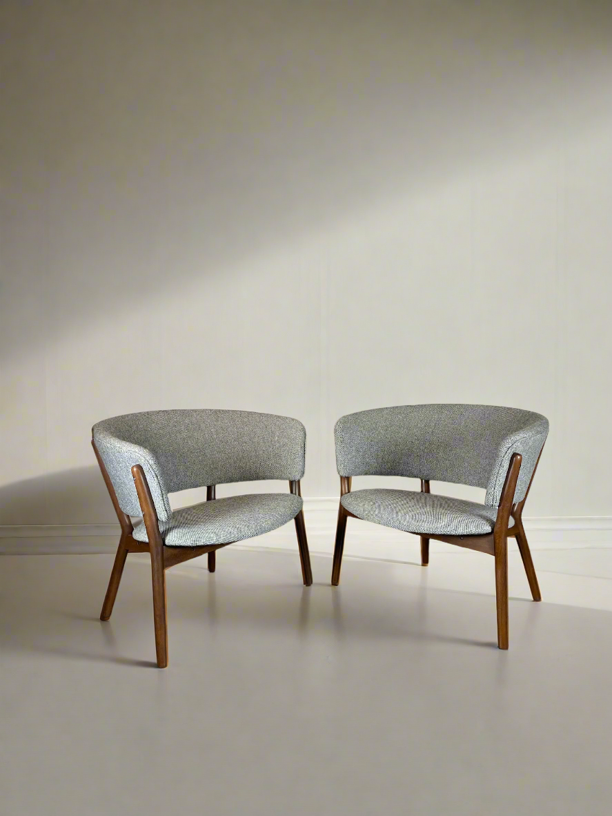 Beautiful Nana Ditzel Pair of Chairs (model ND83) by Selig in new classic Hallingdal 65 (color way 126) Danish wool (fabric Designed by Nana Ditzel) for Kvadrat. Frames have been restored to excellent vintage condition. Both Chairs retain their Selig badge. Both Chairs are in Excellent like new condition. These chairs would work great as a pair of accent chairs in just about any environment.ย Chairs are made of walnut stained beechwood.ย