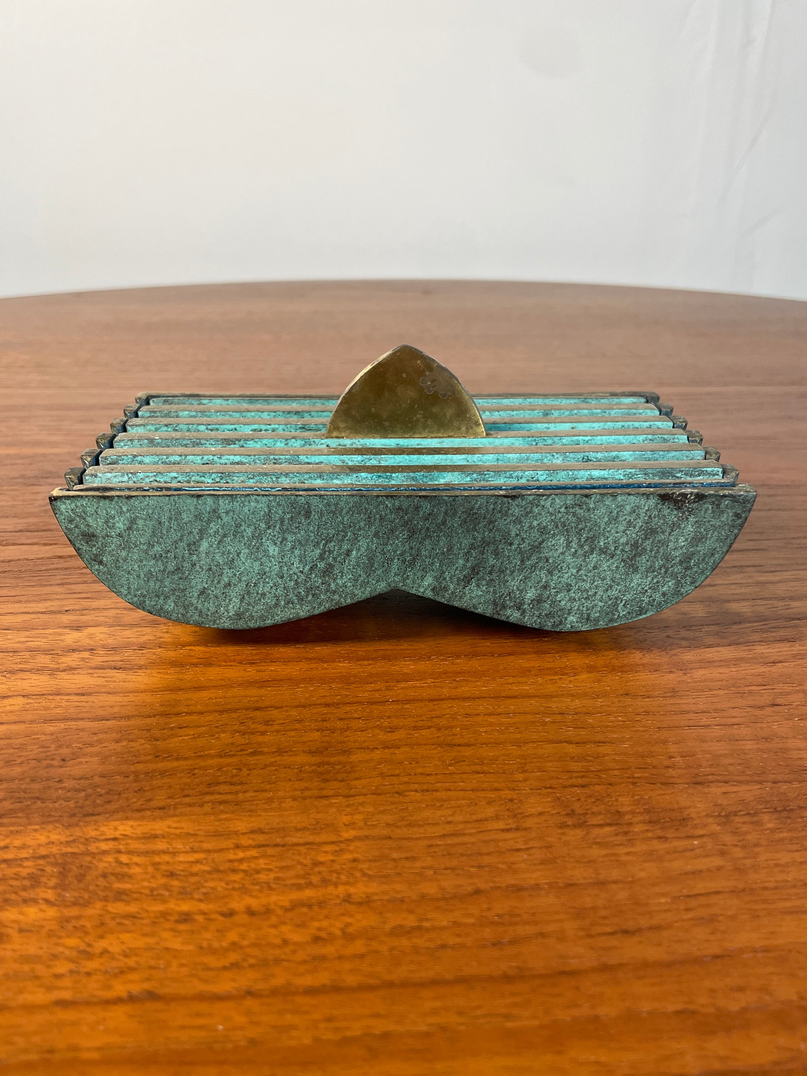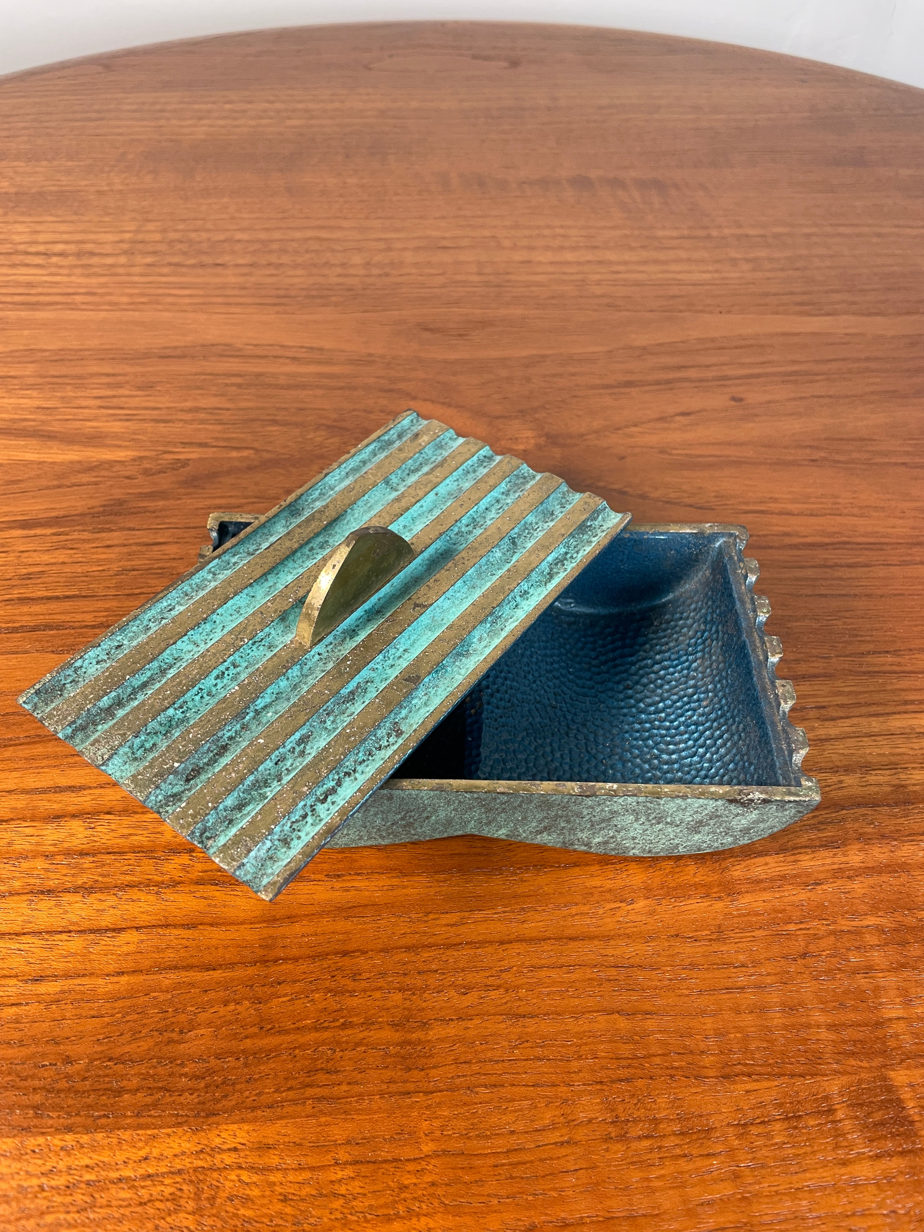 The verdigris patina on the bronze brass creates a beautiful antique finish, adding depth and character to the piece. PAL-BELL is known for its high-quality and distinctive designs, and this storage box is an excellent example of their craftsmanship. It can be used for storing small items and will bring a touch of vintage elegance and history to any room. In great vintage condition.Dimensions: 6.5" Width x 3.75" Depth x 3" Height