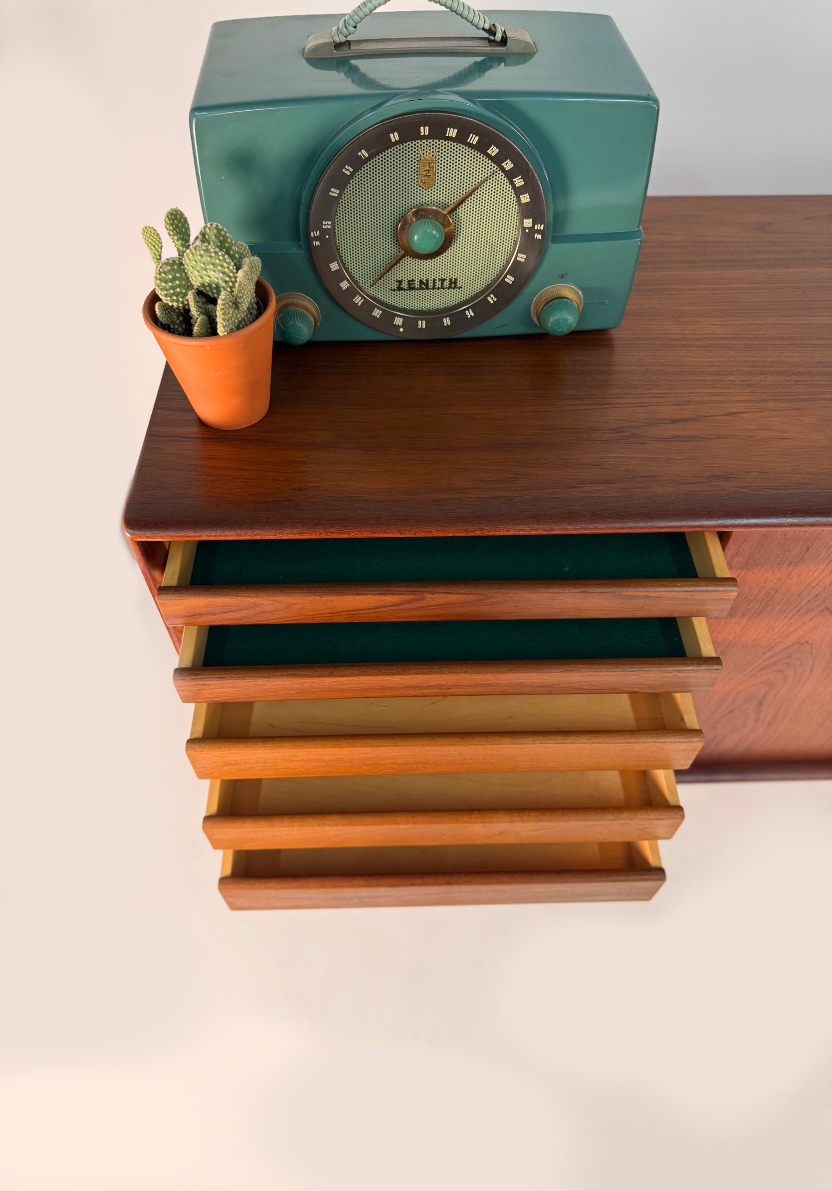 The elevated stance, resting on tapered teak legs, gives the cabinet a light, architectural presence — equally at home in a modern dining room, office, or living space. Every line and surface reflects the designer’s commitment to utility wrapped in timeless form.