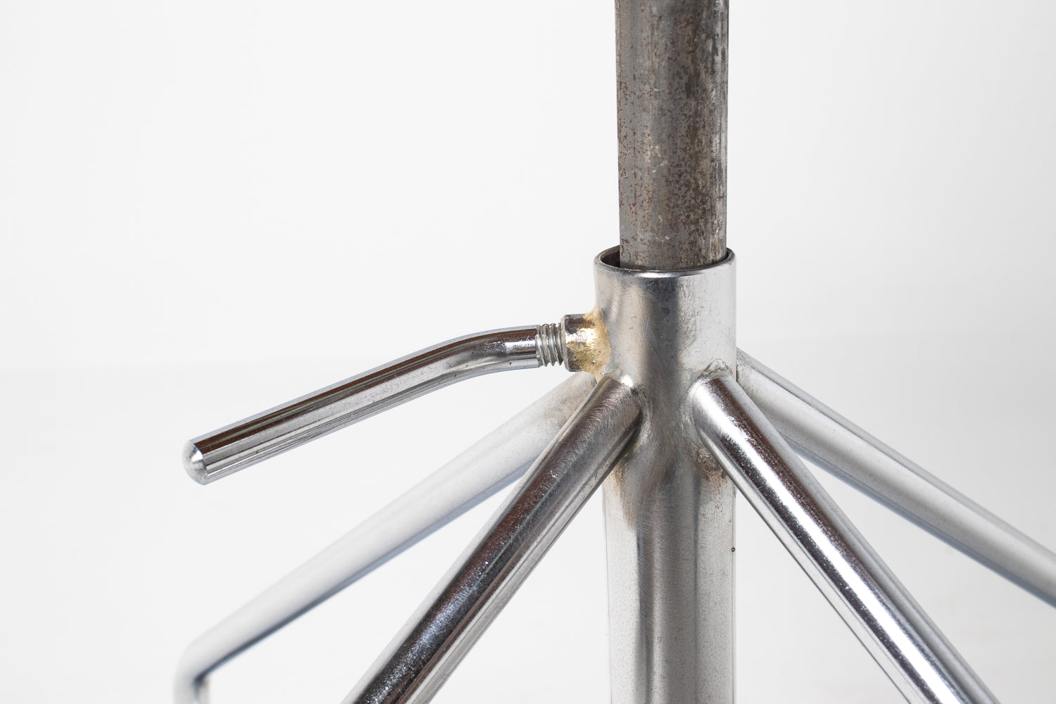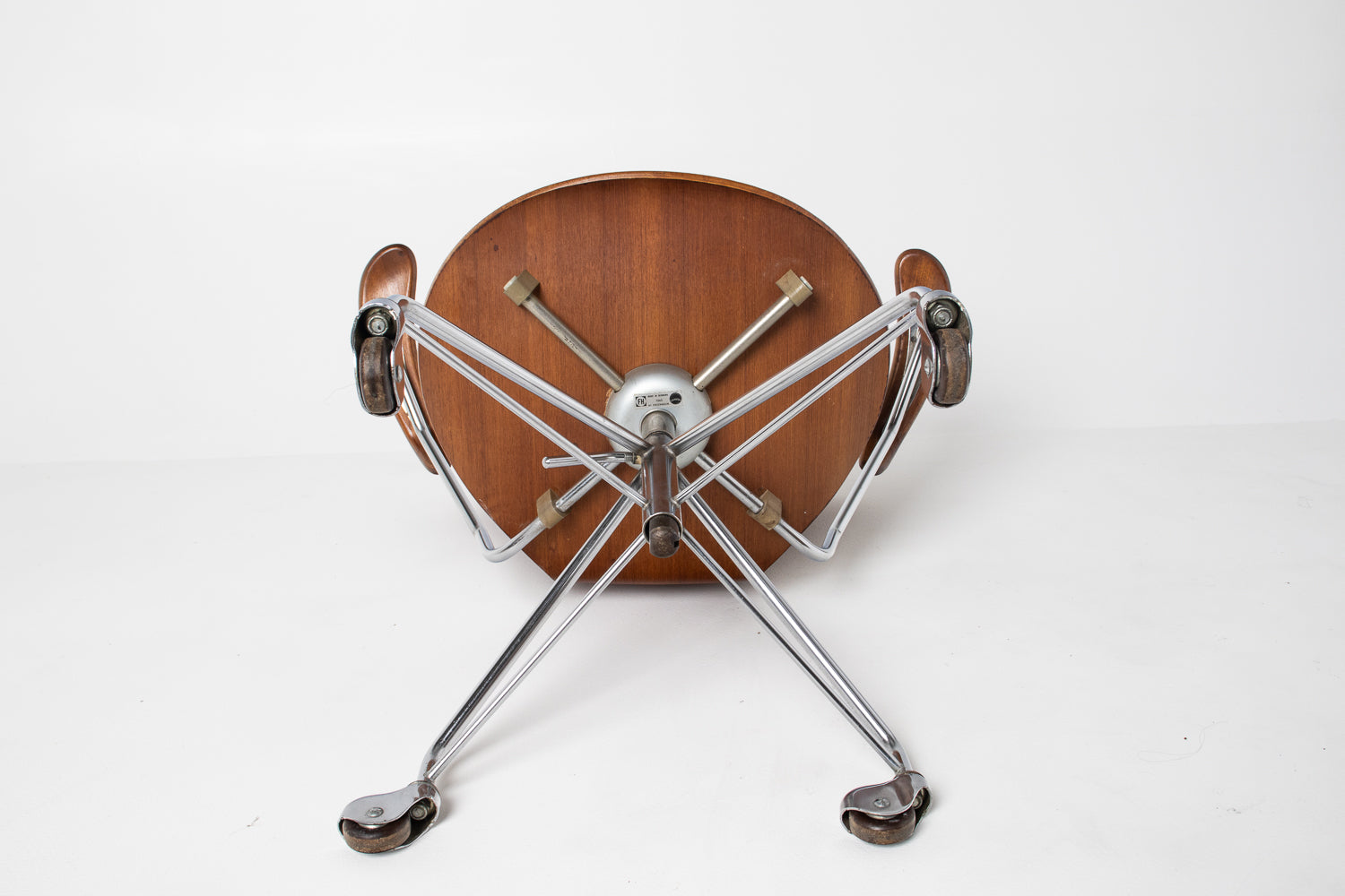 Mounted on its original chrome-plated swivel base with casters, this Model 3217 was designed for modern offices and studios, where form and function were equally valued. The warm patina of the plywood contrasts beautifully with the crisp industrial base, resulting in a chair that feels both architectural and inviting.