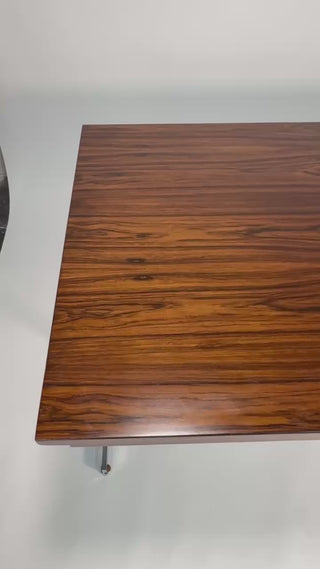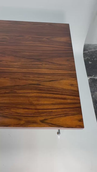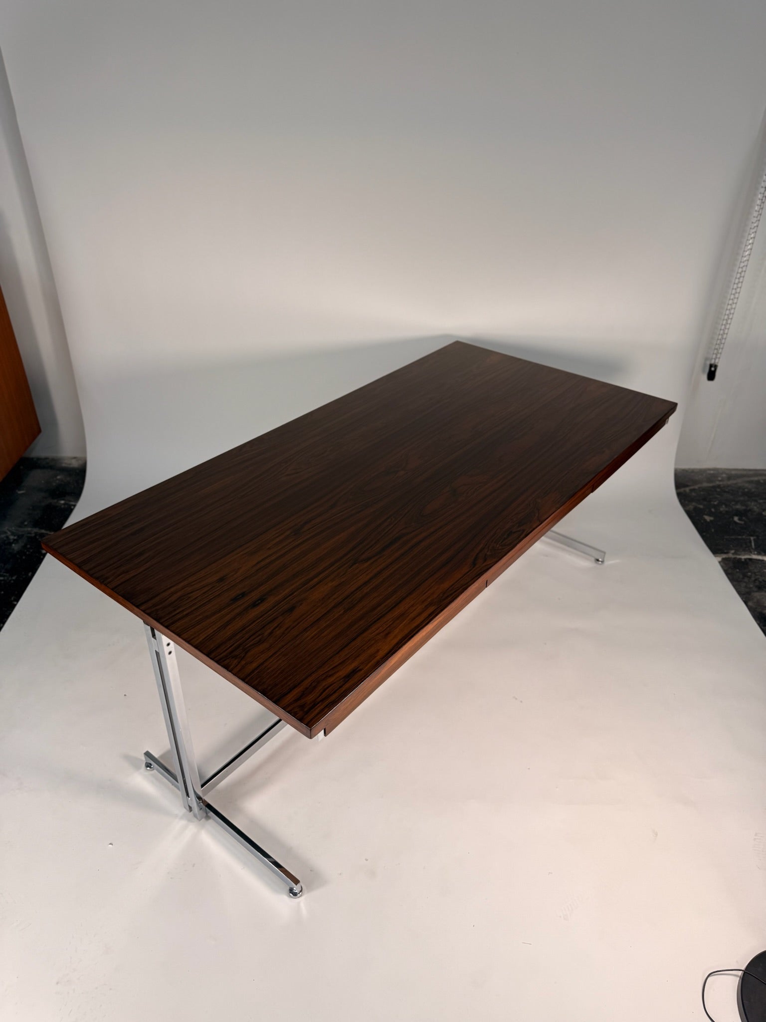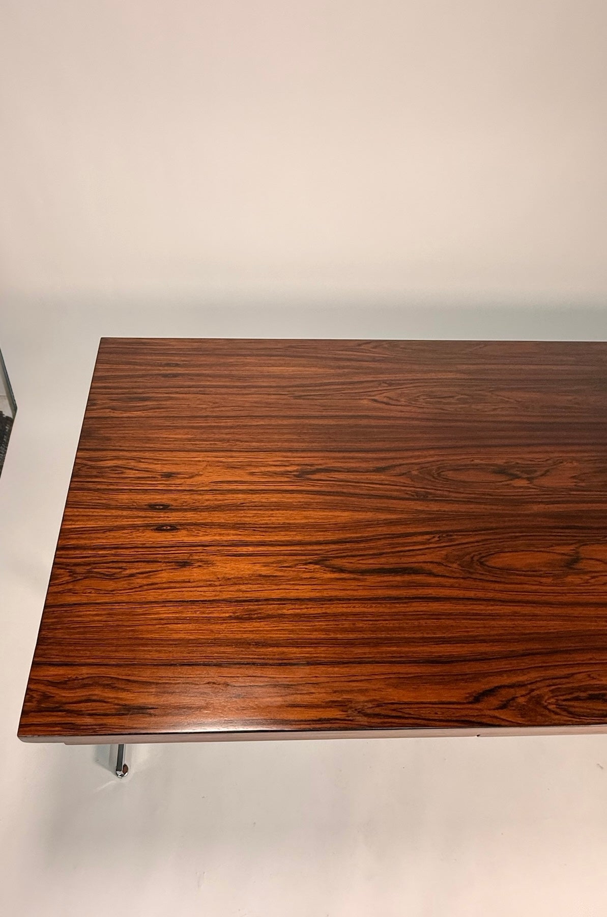 Exceedingly rare configuration: rosewood top, chrome trestle base, and three slim, concealed drawers that preserve the thin-edge profile.