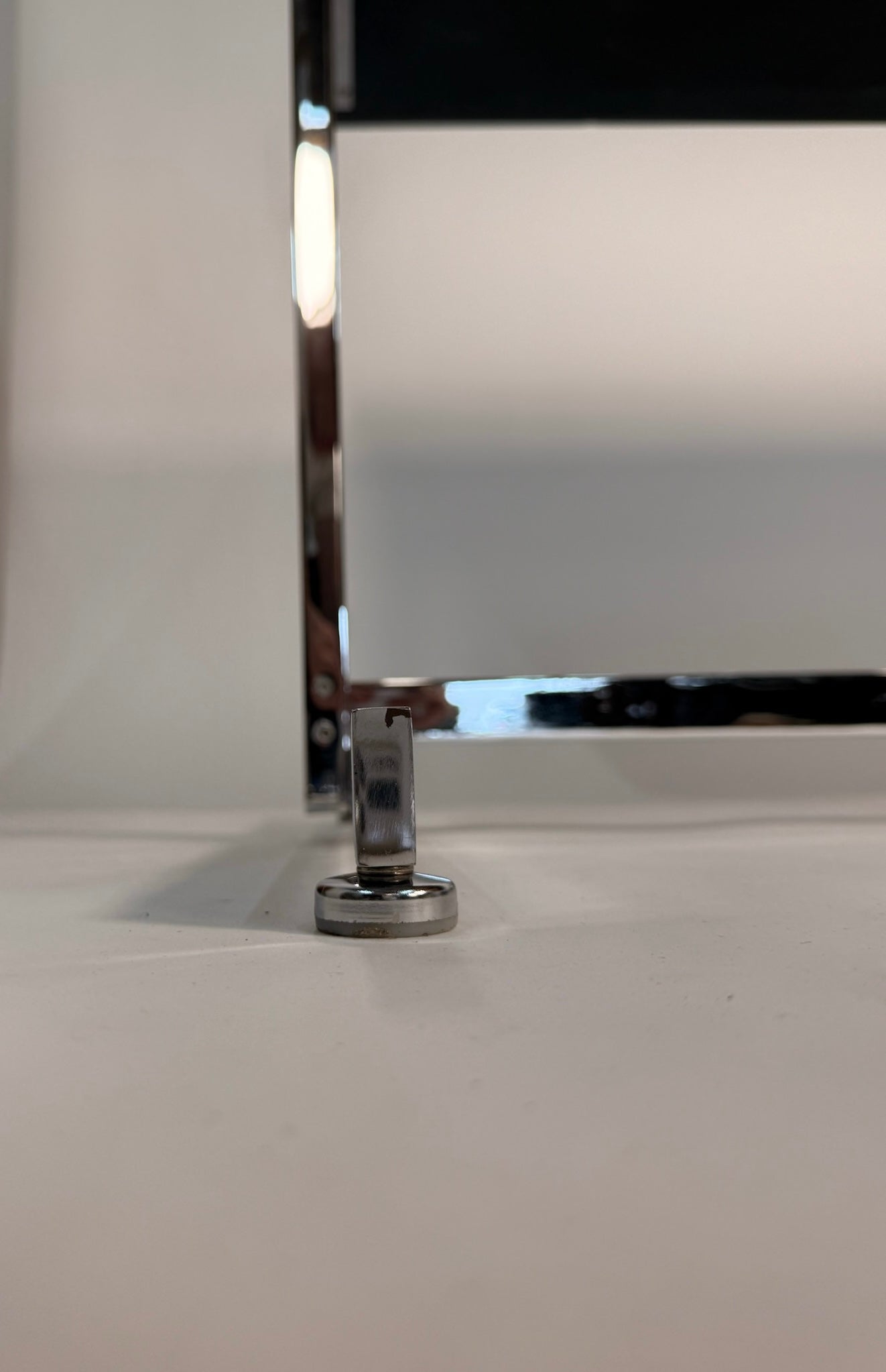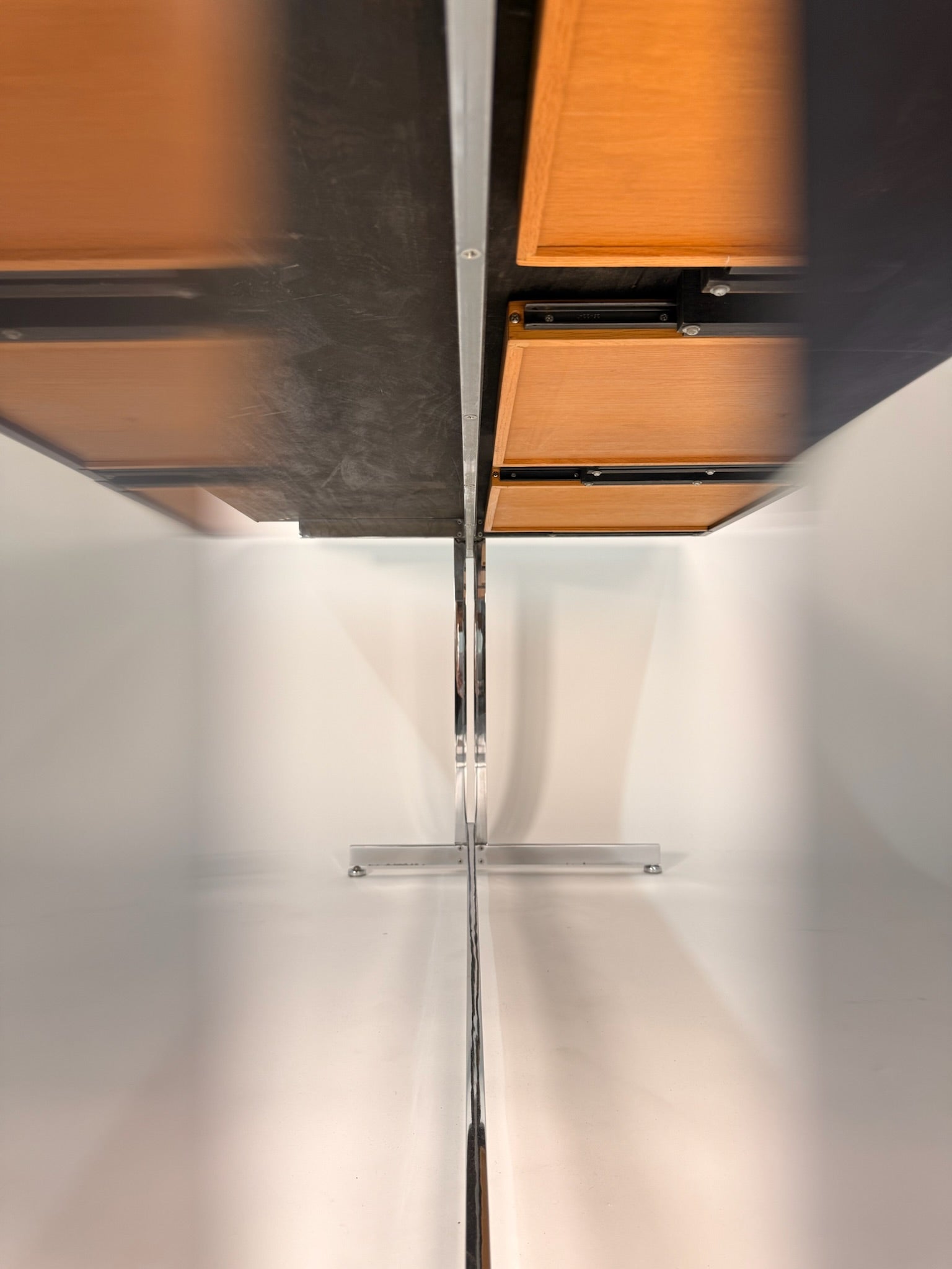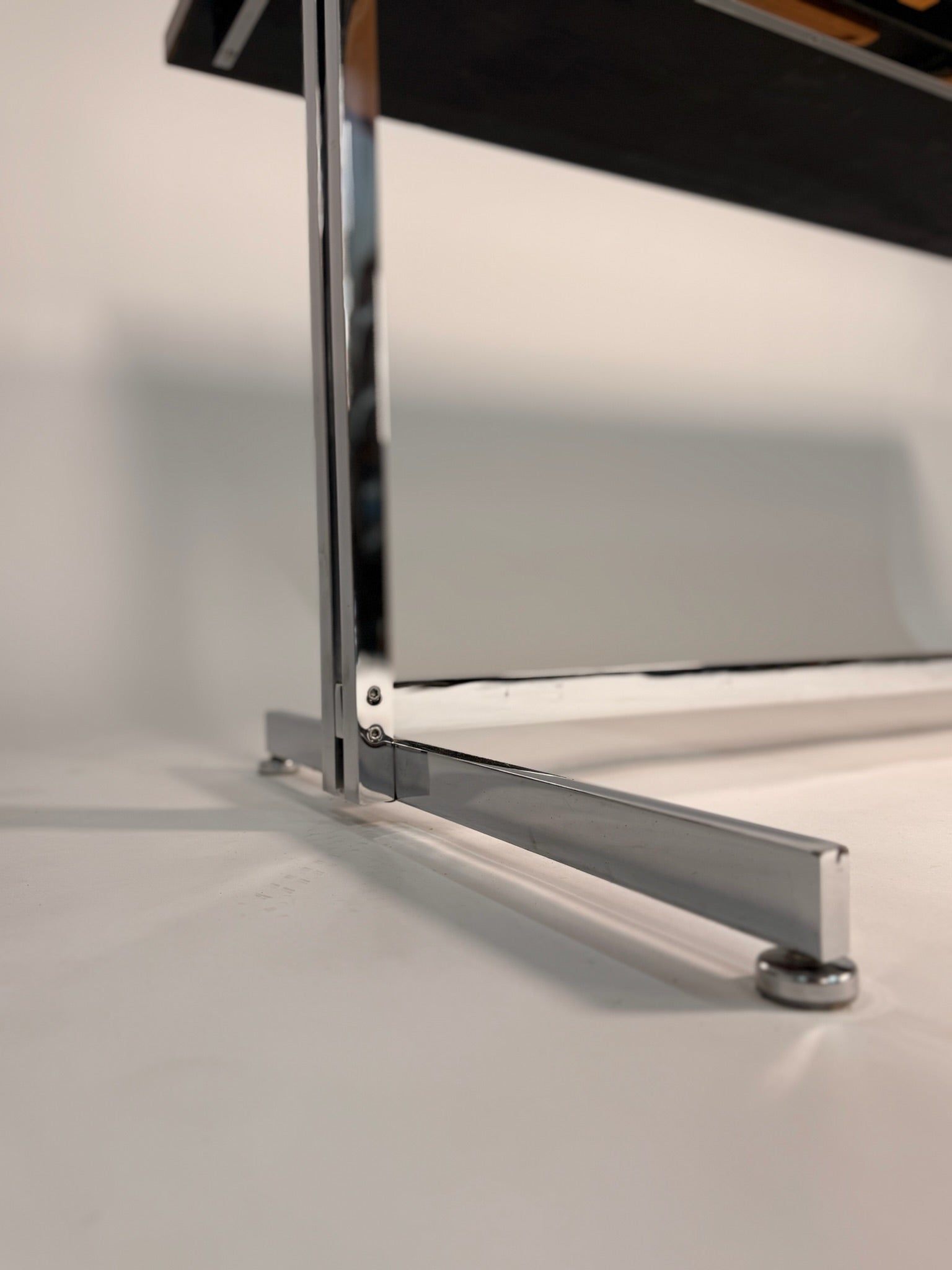 Exceedingly rare configuration: rosewood top, chrome trestle base, and three slim, concealed drawers that preserve the thin-edge profile.