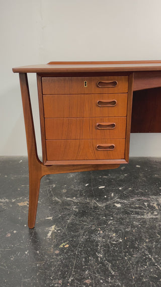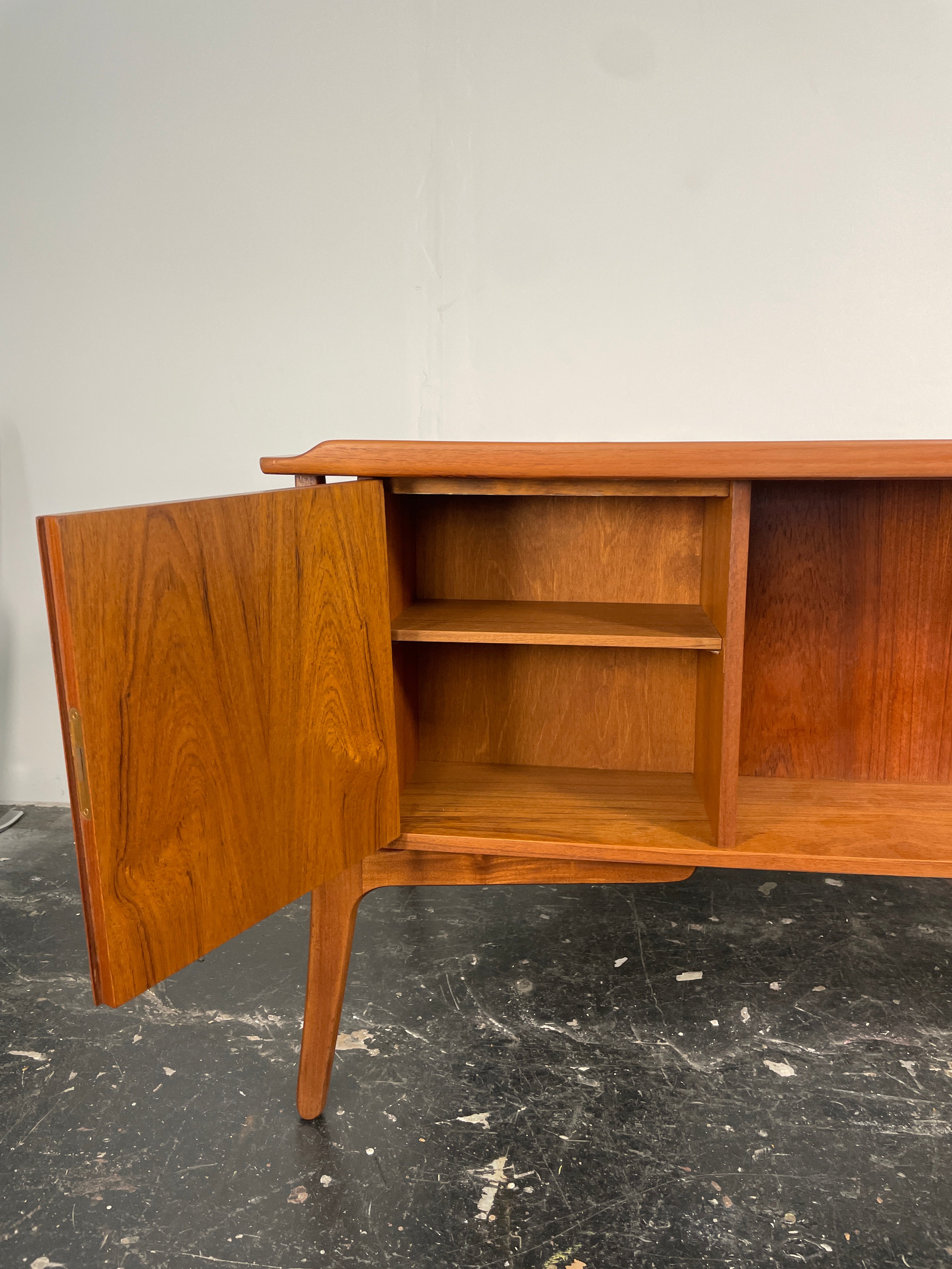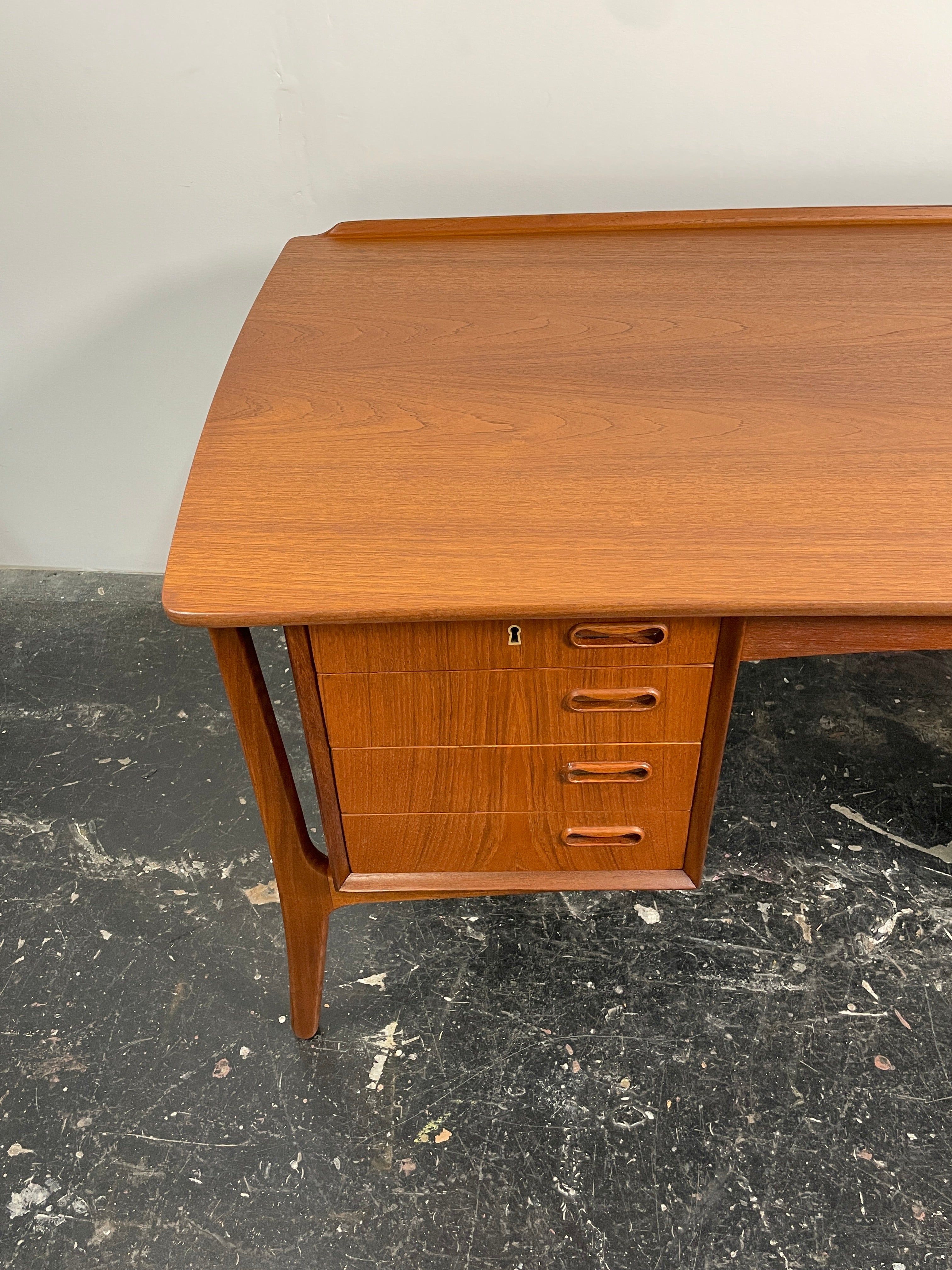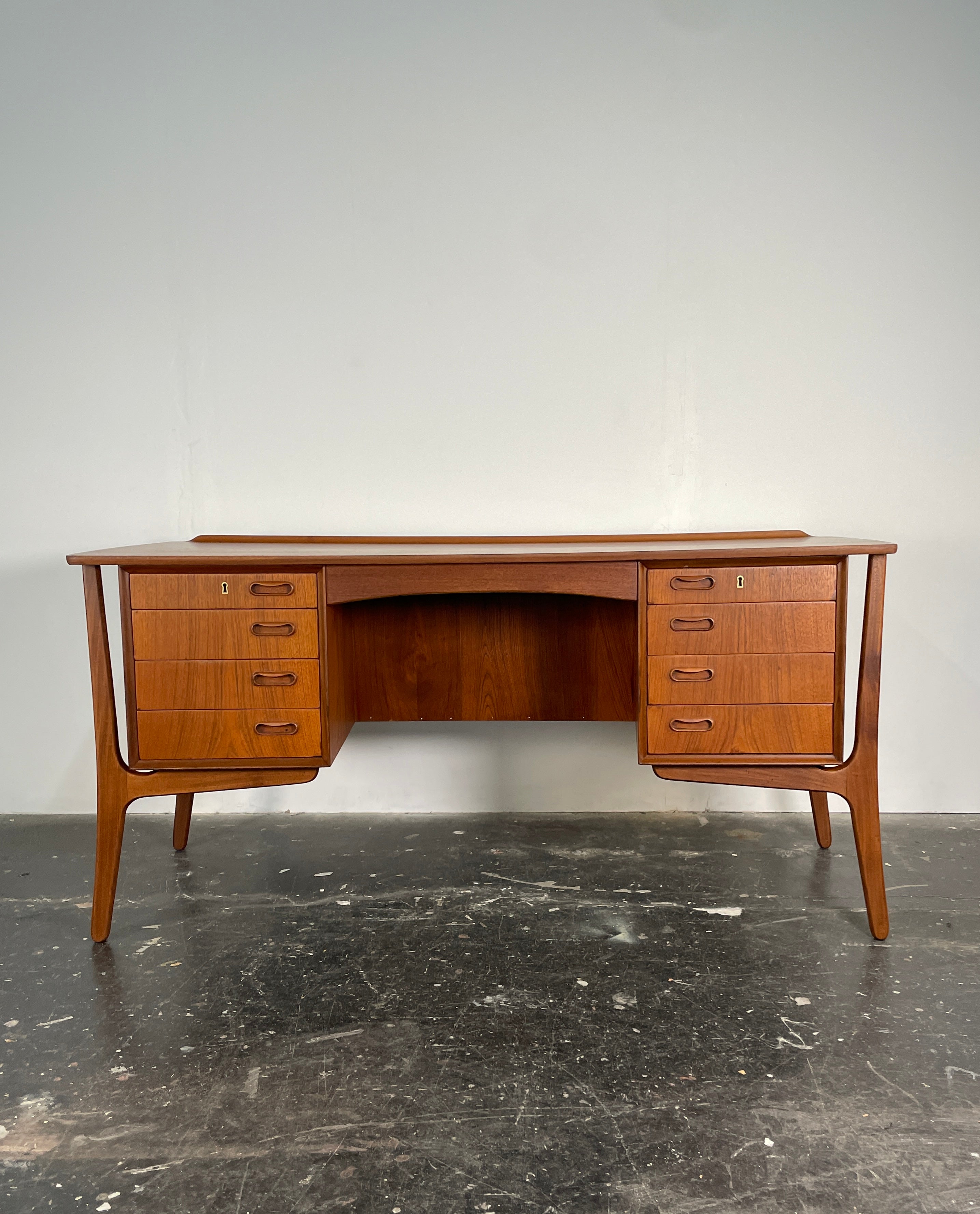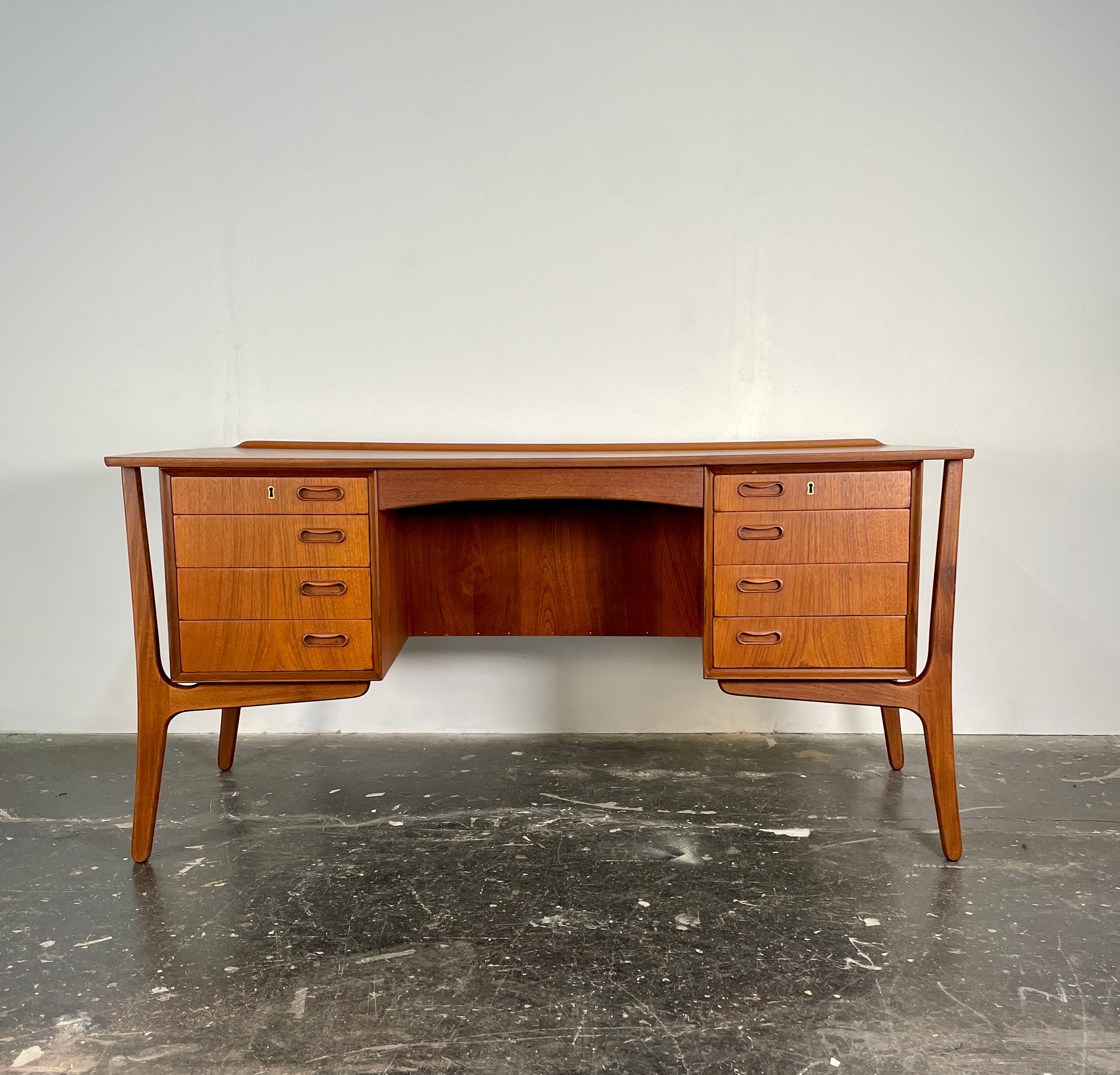 Beautiful curved front teak desk designed by Sven Aage Madsen. Incredibly elegant, this desk features beautiful tapered exoskeleton legs in Afromosia (African teak). Drawers on both sides offer plenty of storage. On the back side a box with interior shelf which closes with a key with an interior shelf. Original key included.ย