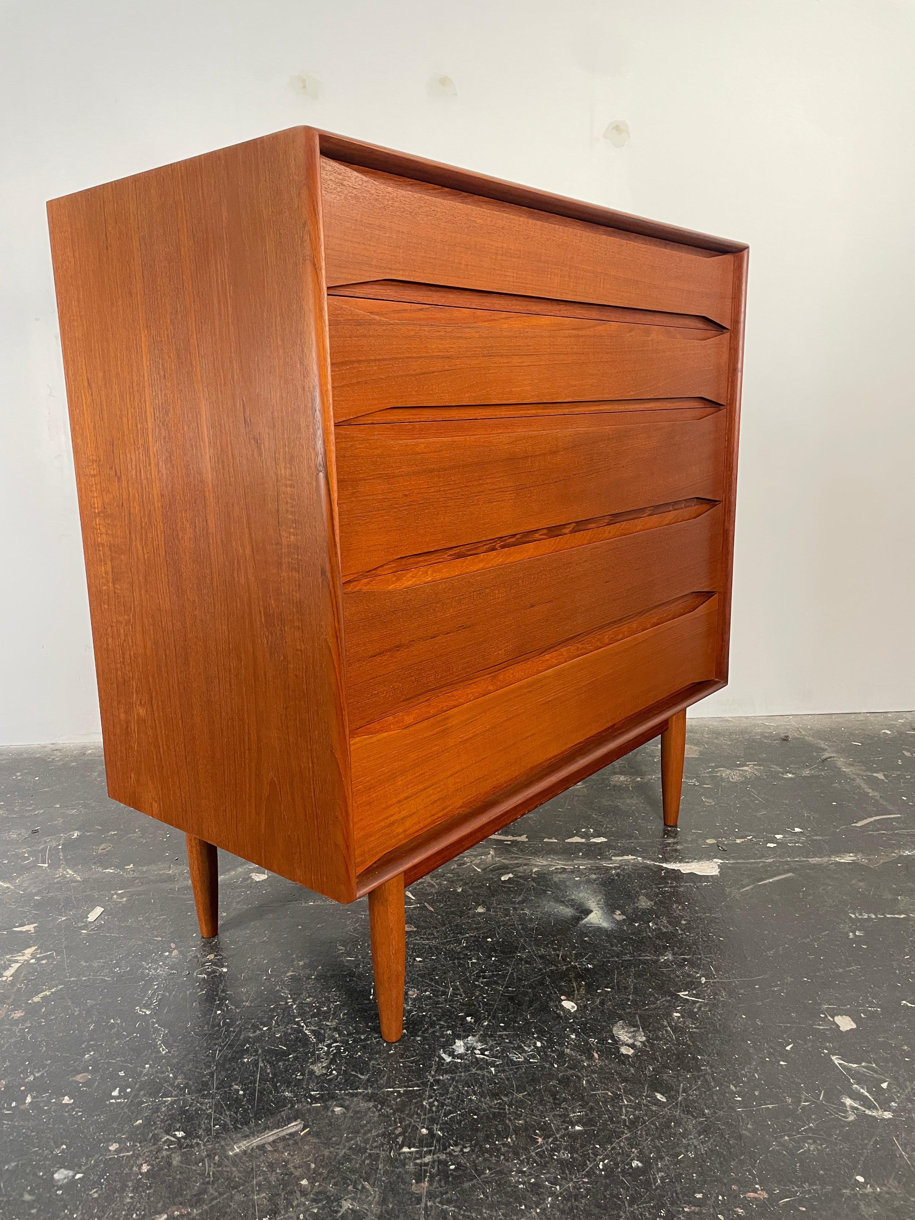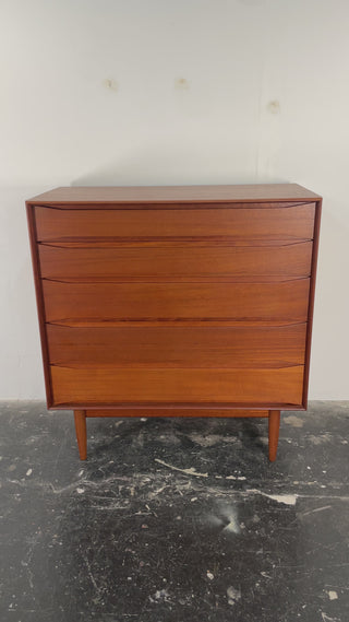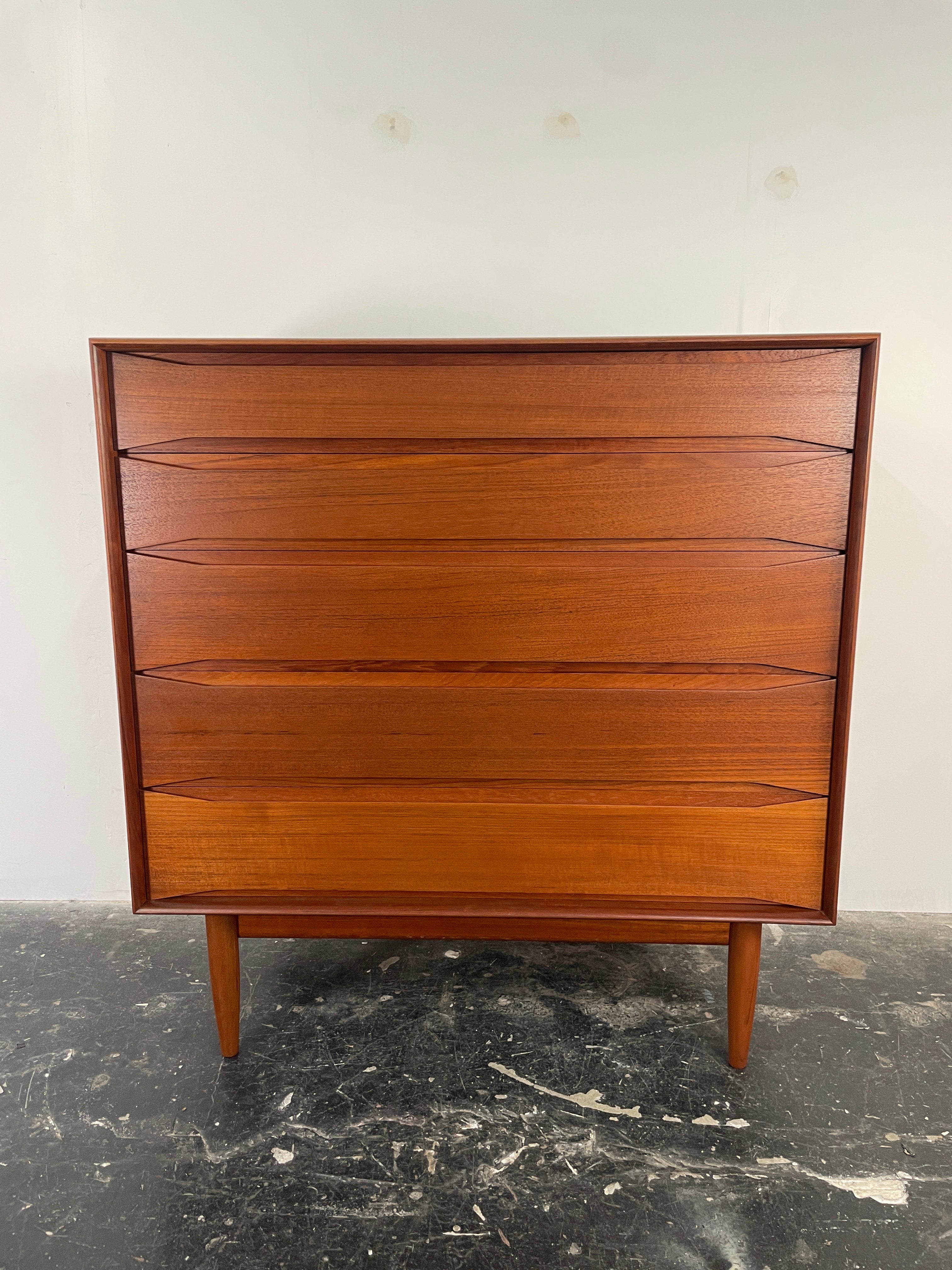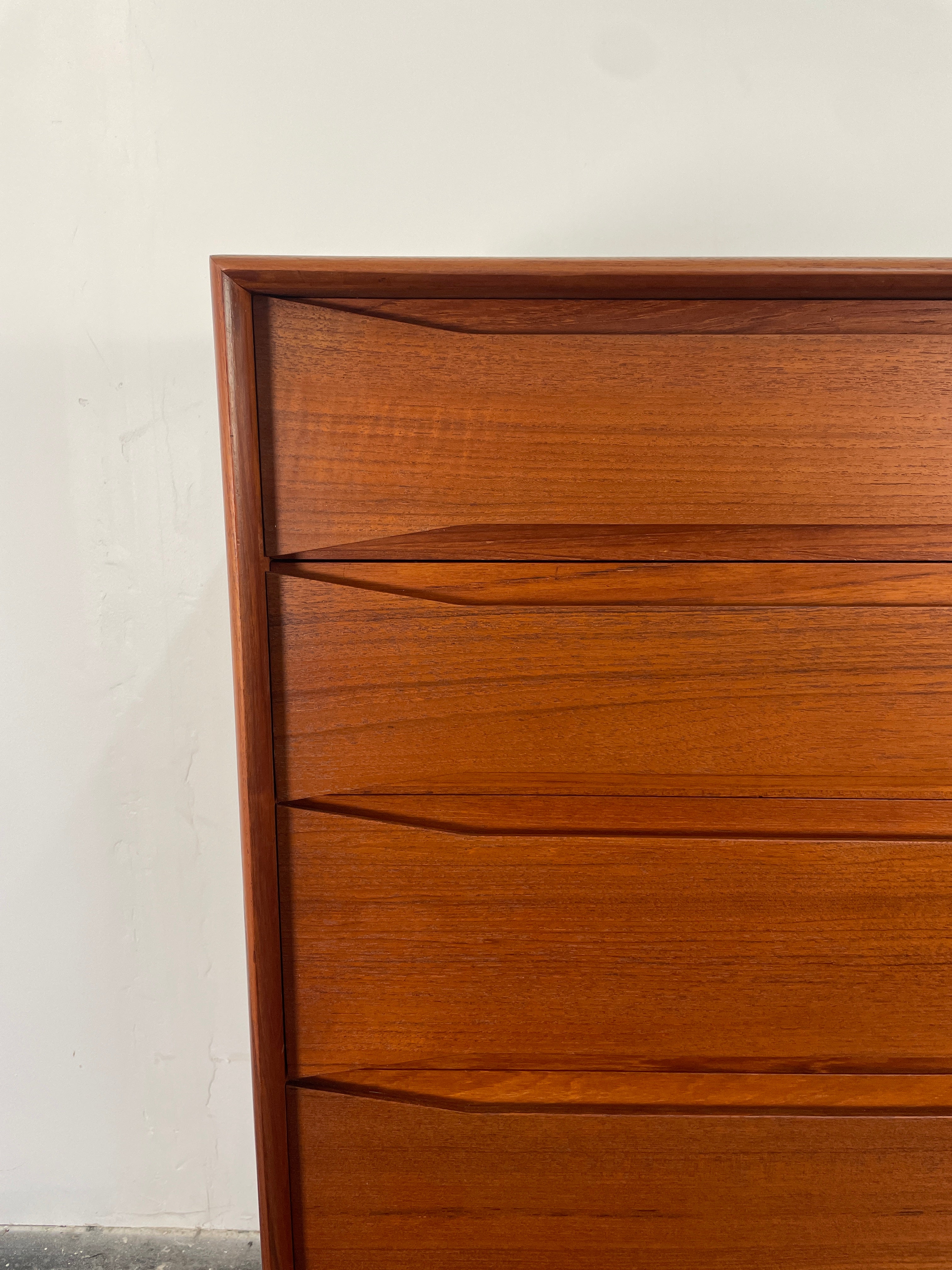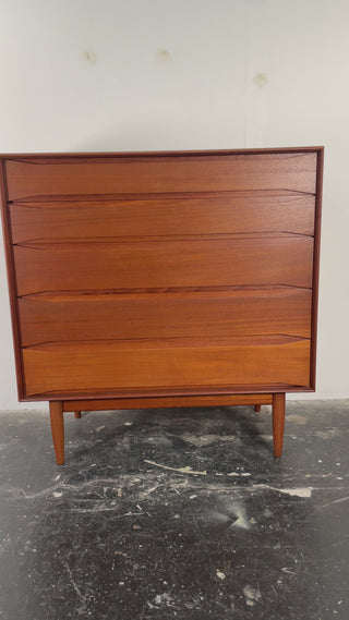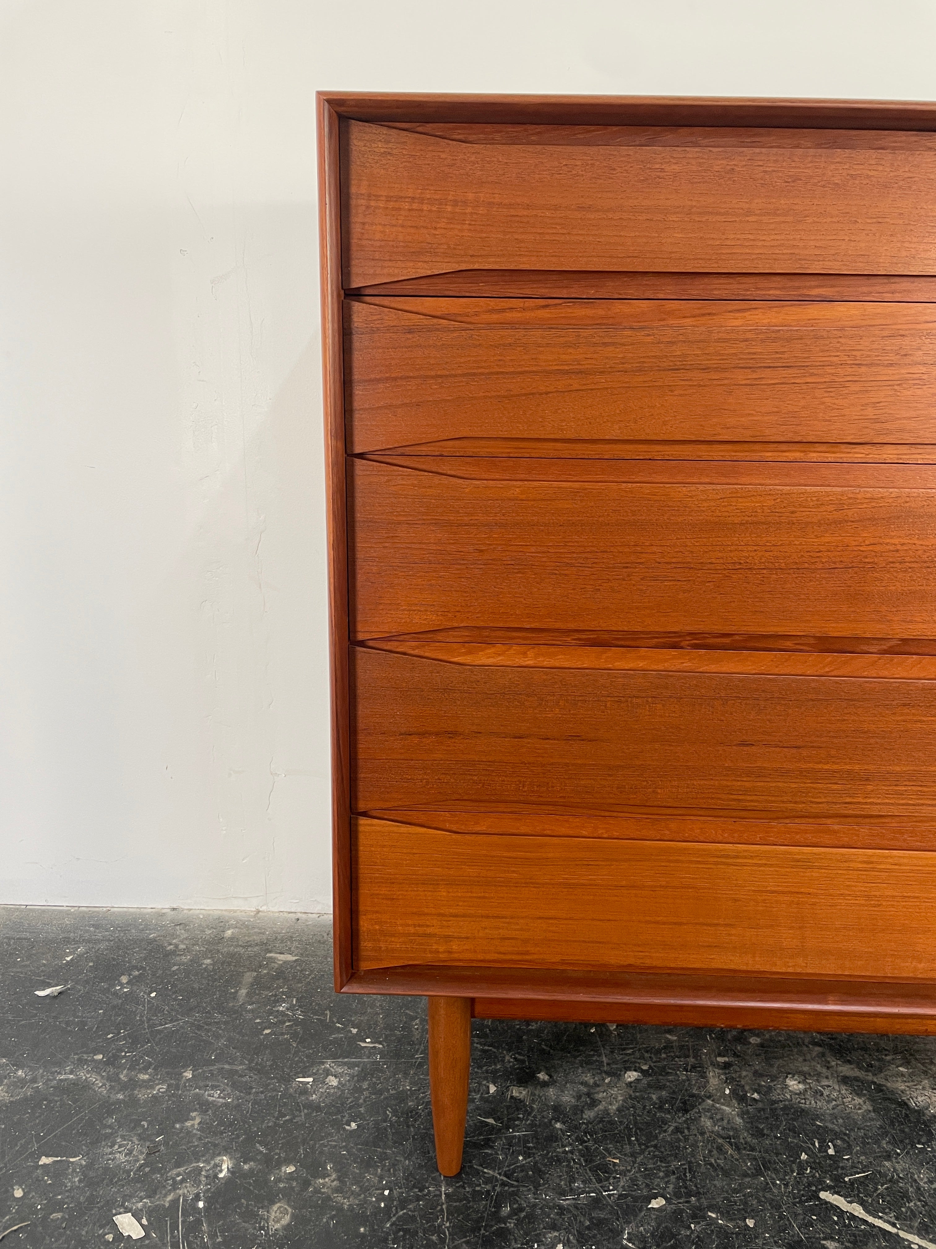 Rare Johannes Aasbjerg Dresser Circa 1960's Denmark. This Dresser features beautiful sculpted drawer fronts and solid teak drawers. This is a high quality dresser with beautiful old-growth teak. Finished on the back so that the dresser can float in a room. 6th picture, you can see the solid wood grain travel across from the front to the side on the picture of the drawer.