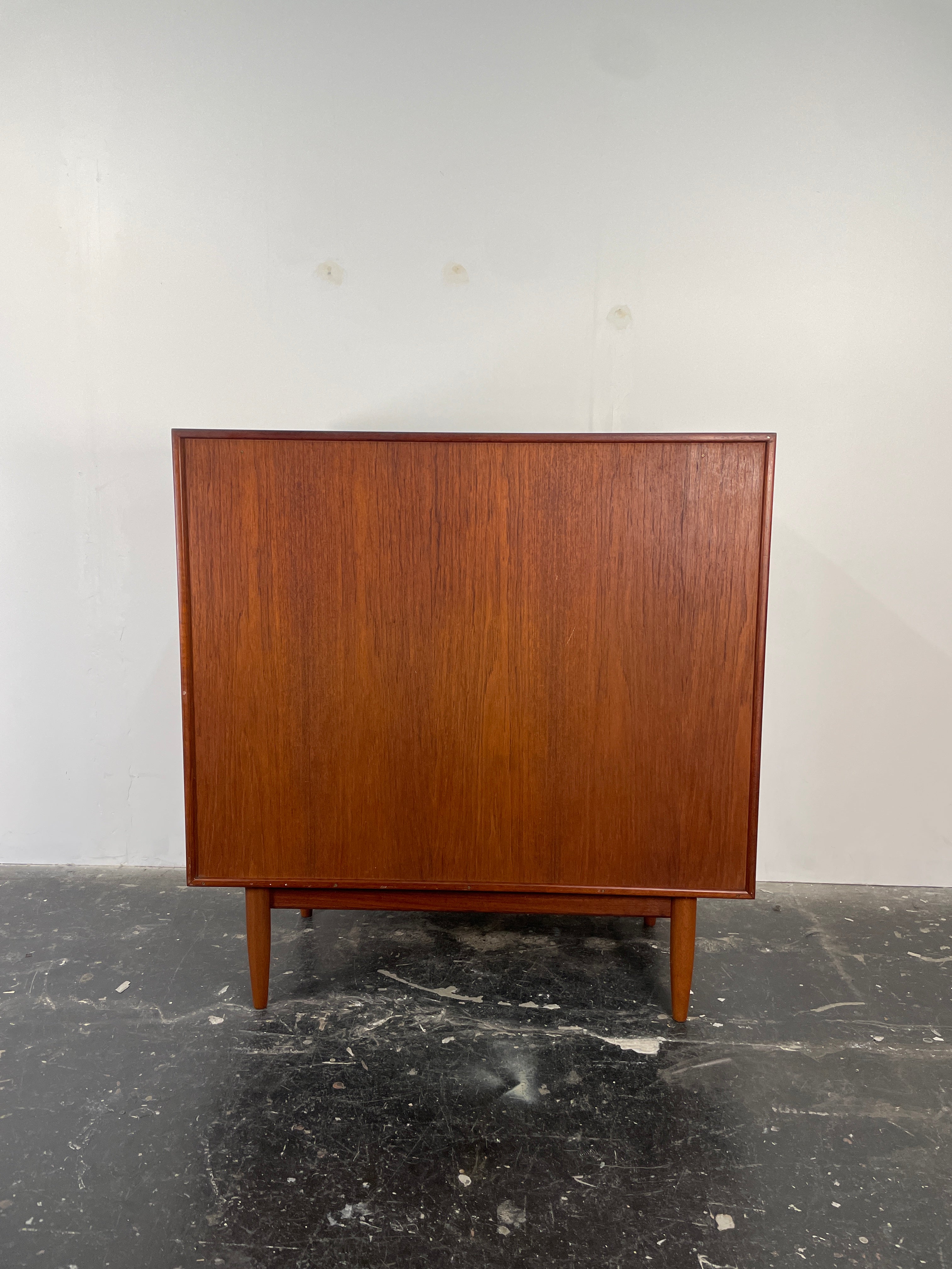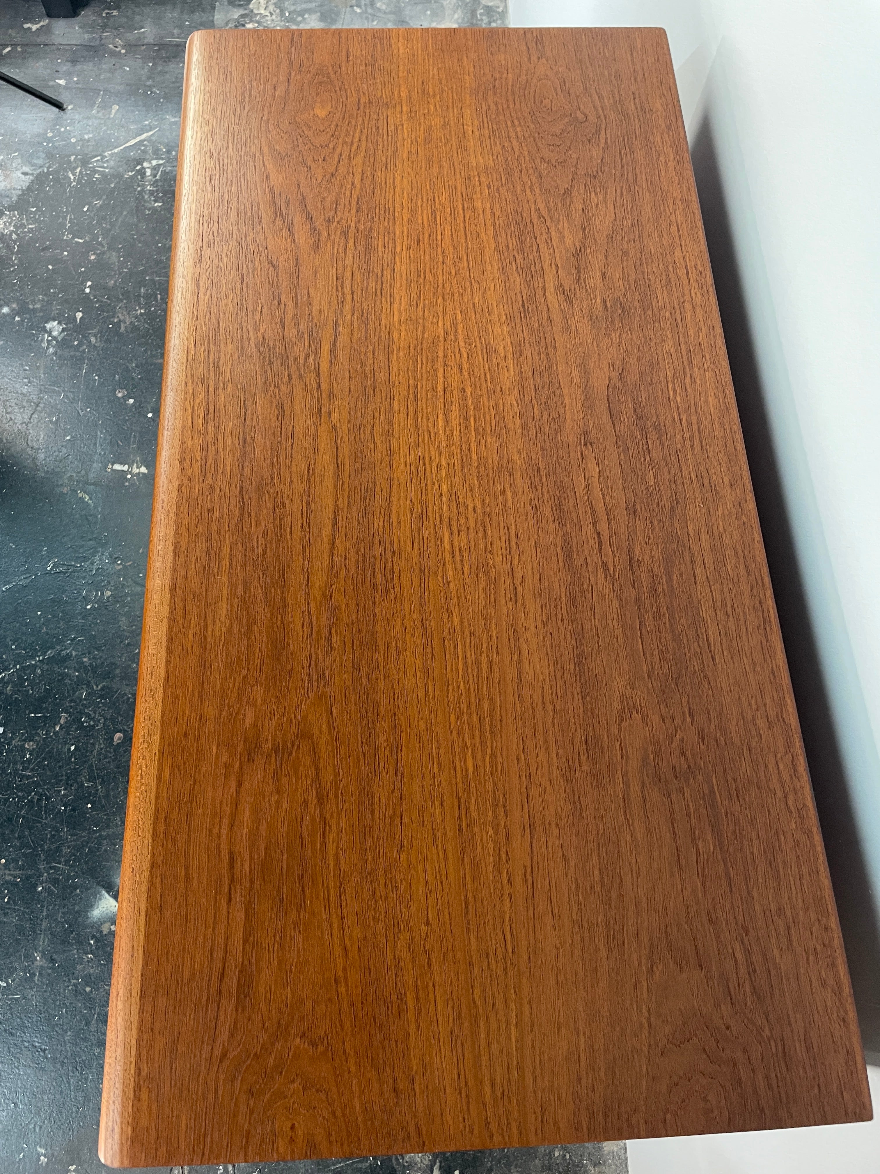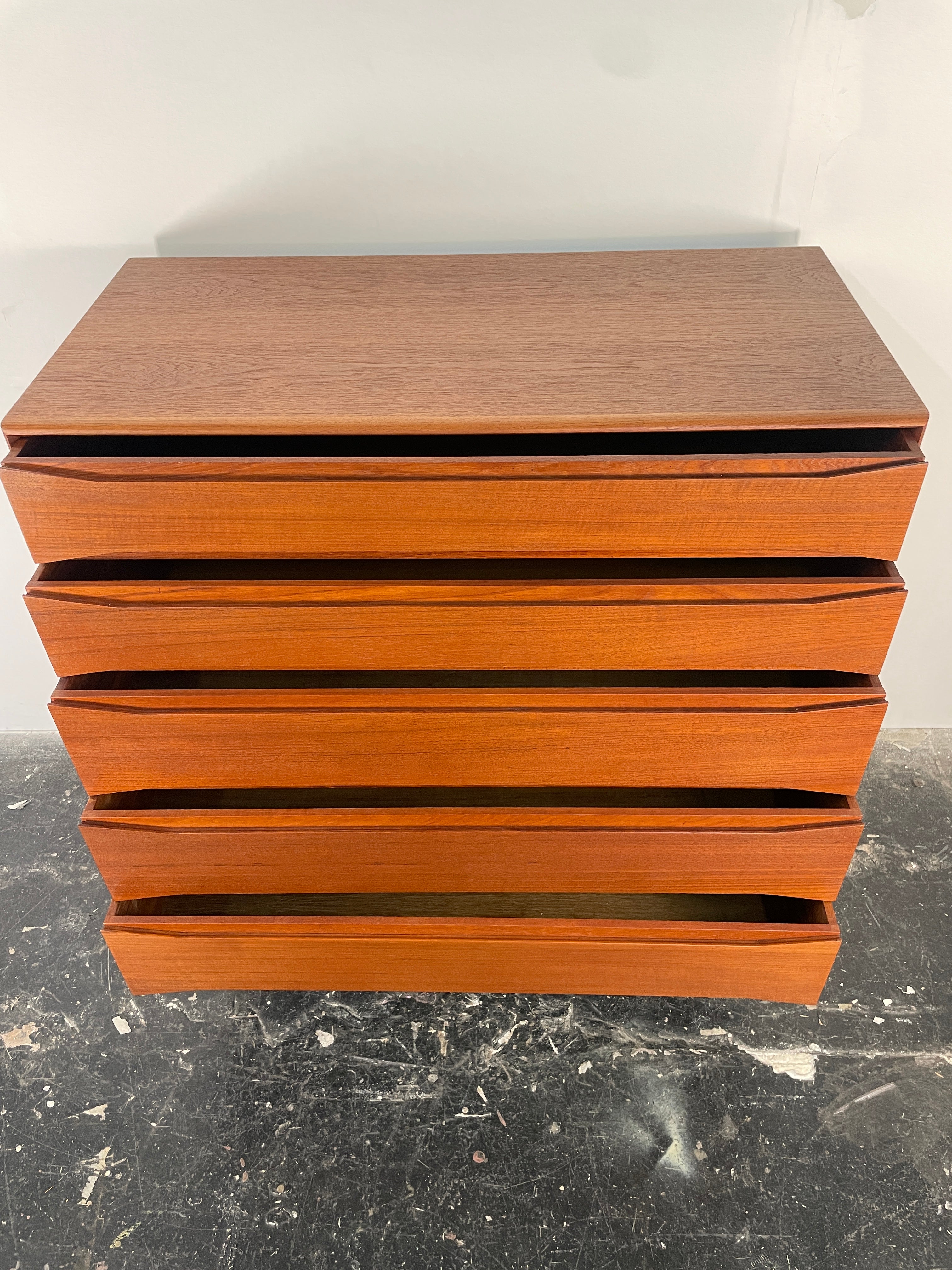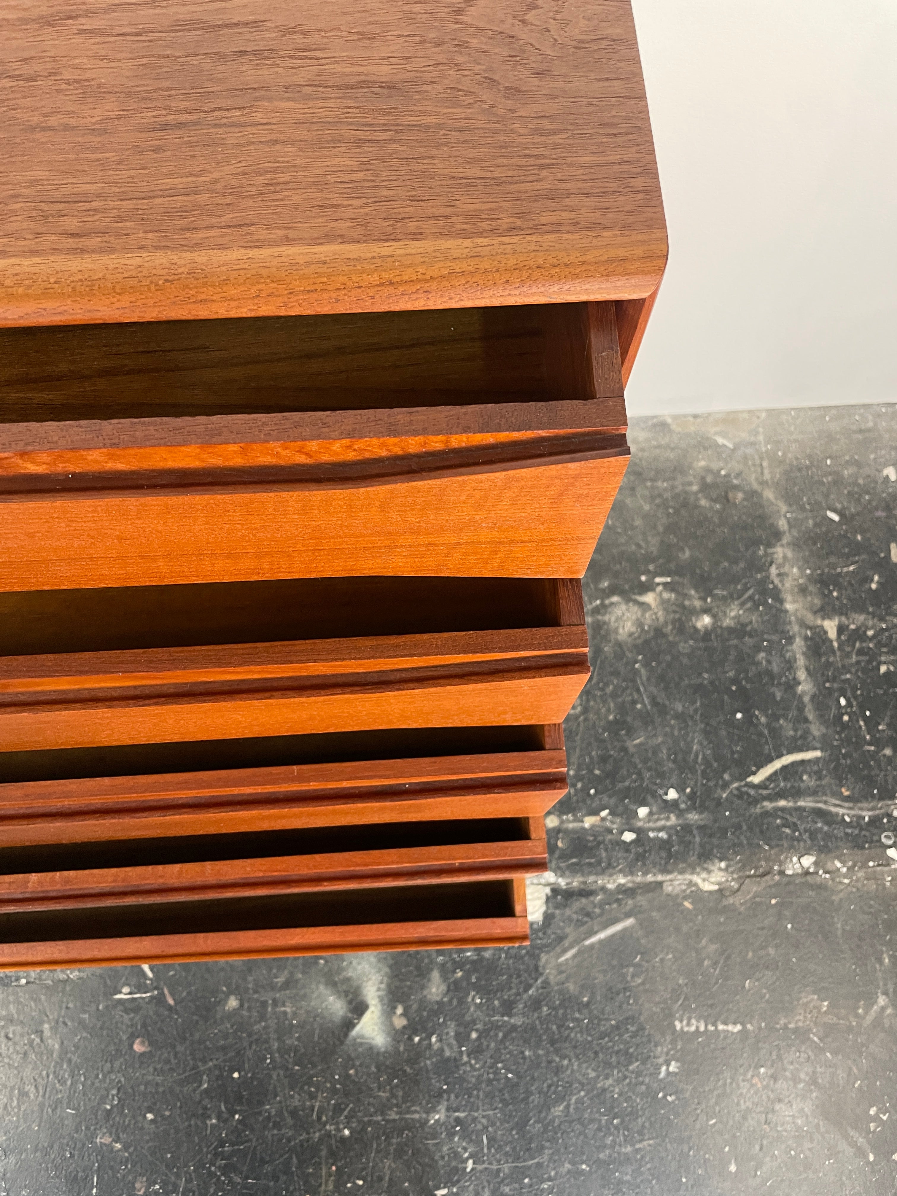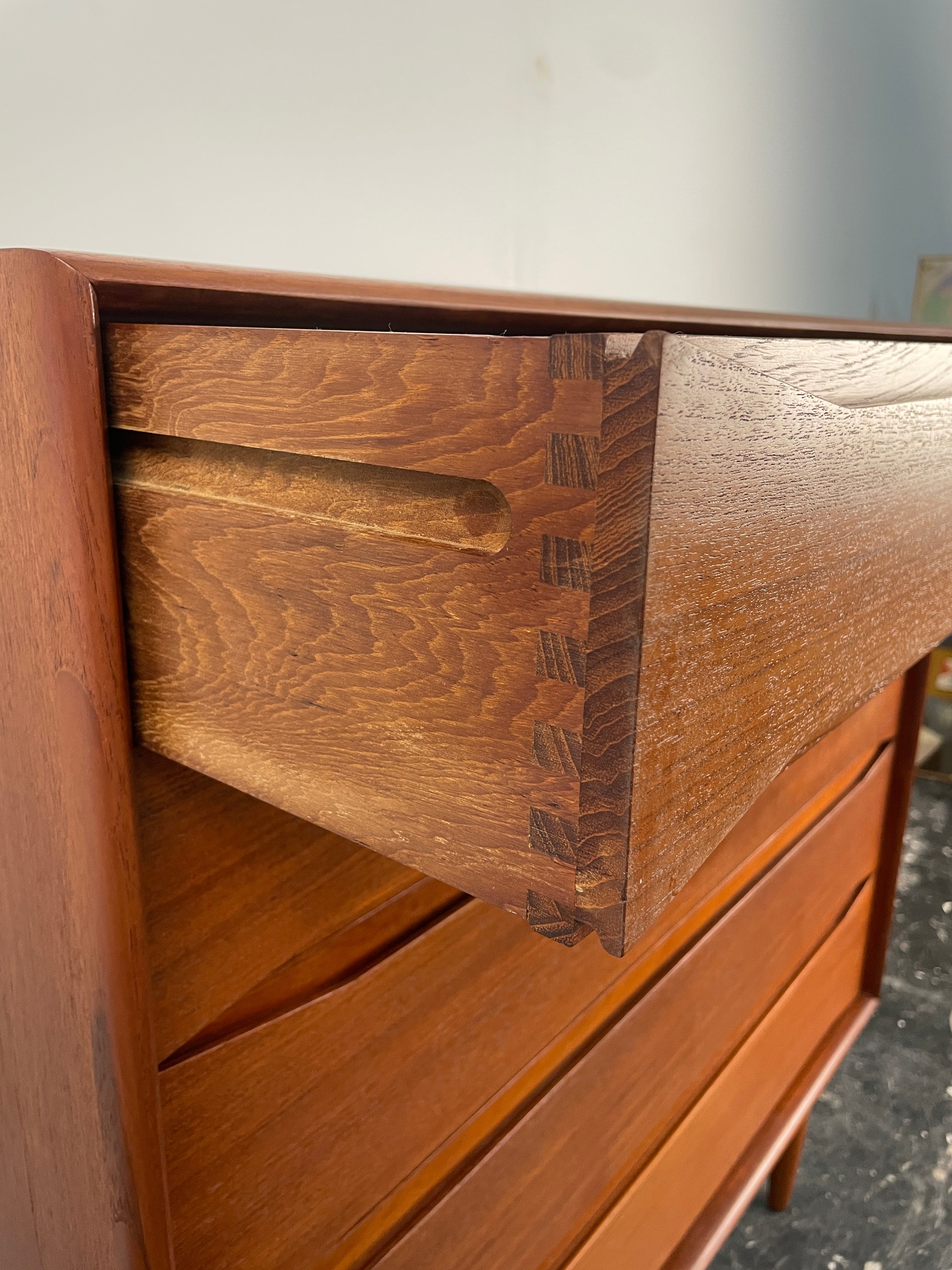 Rare Johannes Aasbjerg Dresser Circa 1960's Denmark. This Dresser features beautiful sculpted drawer fronts and solid teak drawers. This is a high quality dresser with beautiful old-growth teak. Finished on the back so that the dresser can float in a room. 6th picture, you can see the solid wood grain travel across from the front to the side on the picture of the drawer.