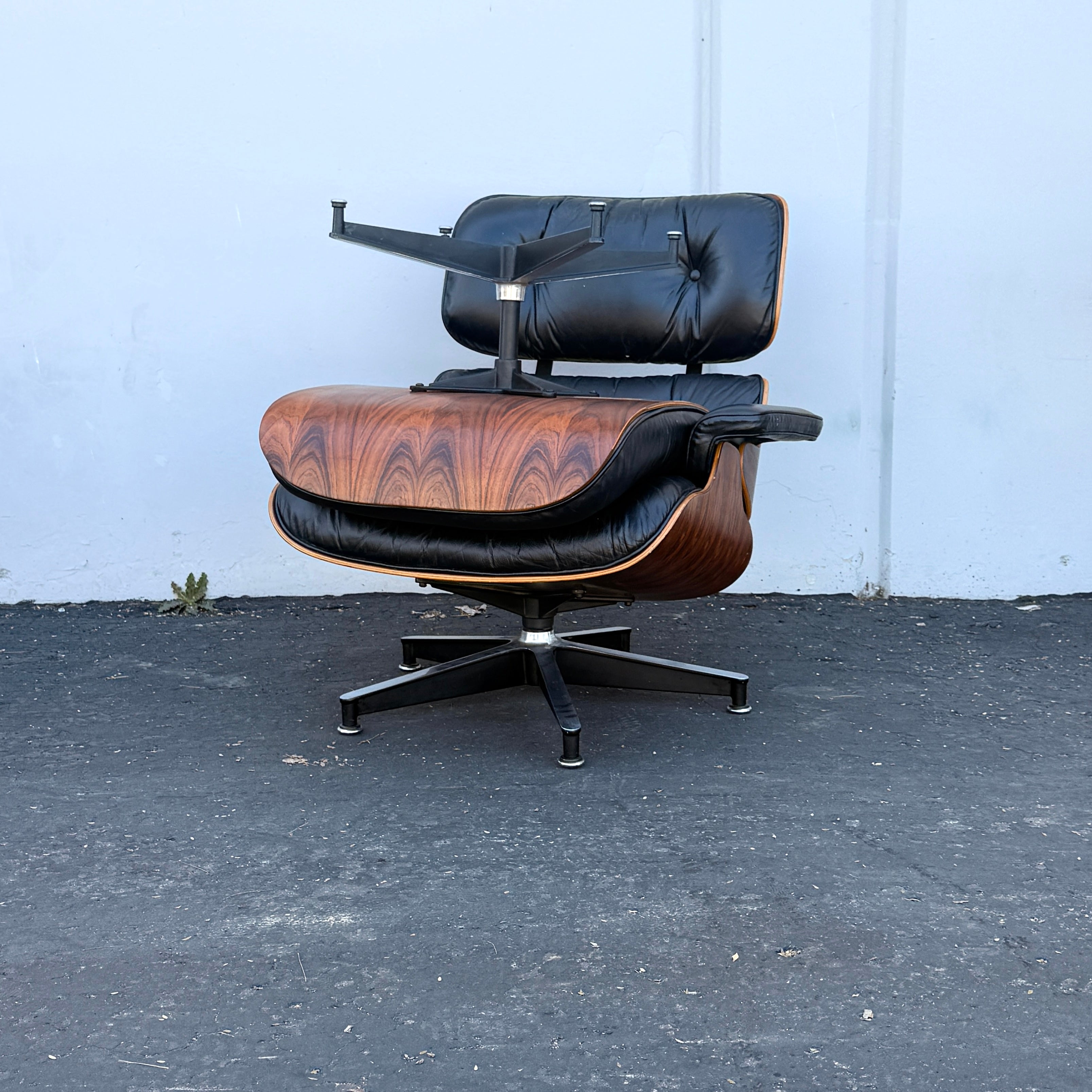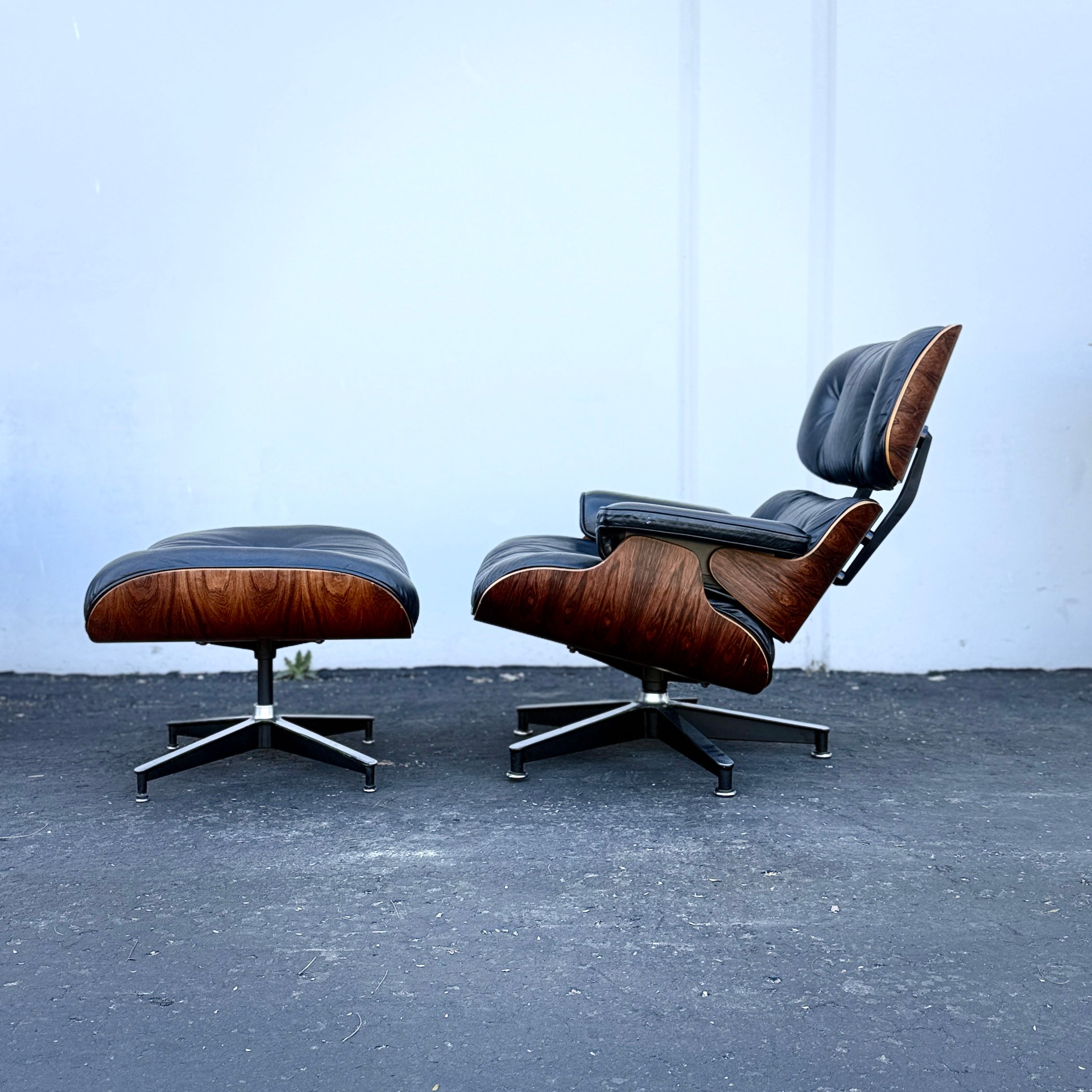 As a result, authentic vintage examples of Eames Lounge Chairs with Brazilian rosewood shells have become increasingly rare and highly sought after by collectors. Modern production chairs now use walnut or other species, making the rosewood versions a true artifact of the original era of Mid-Century Modern design.