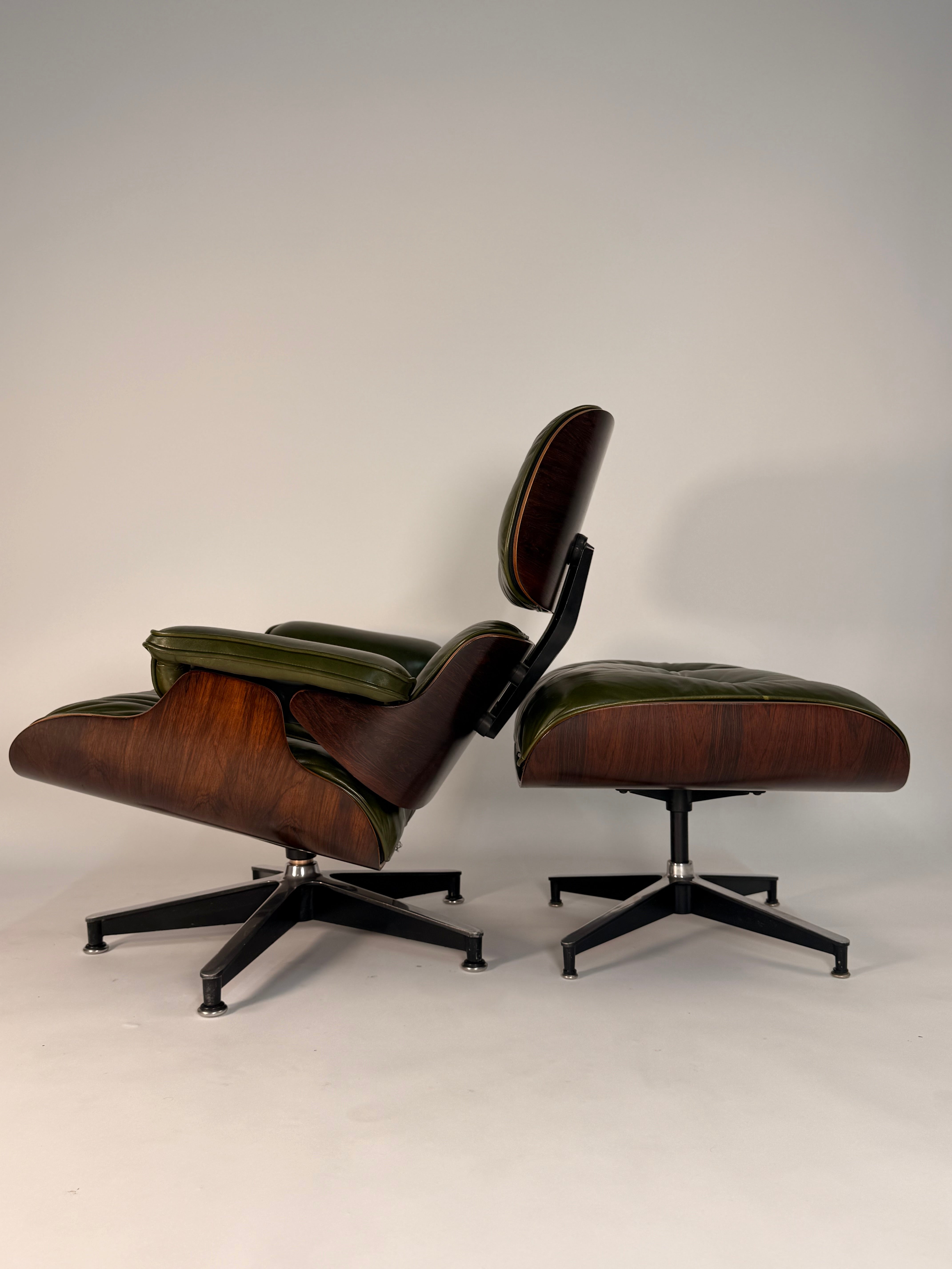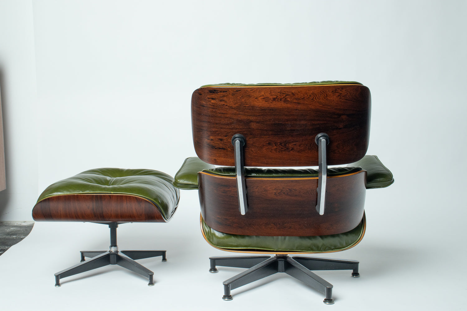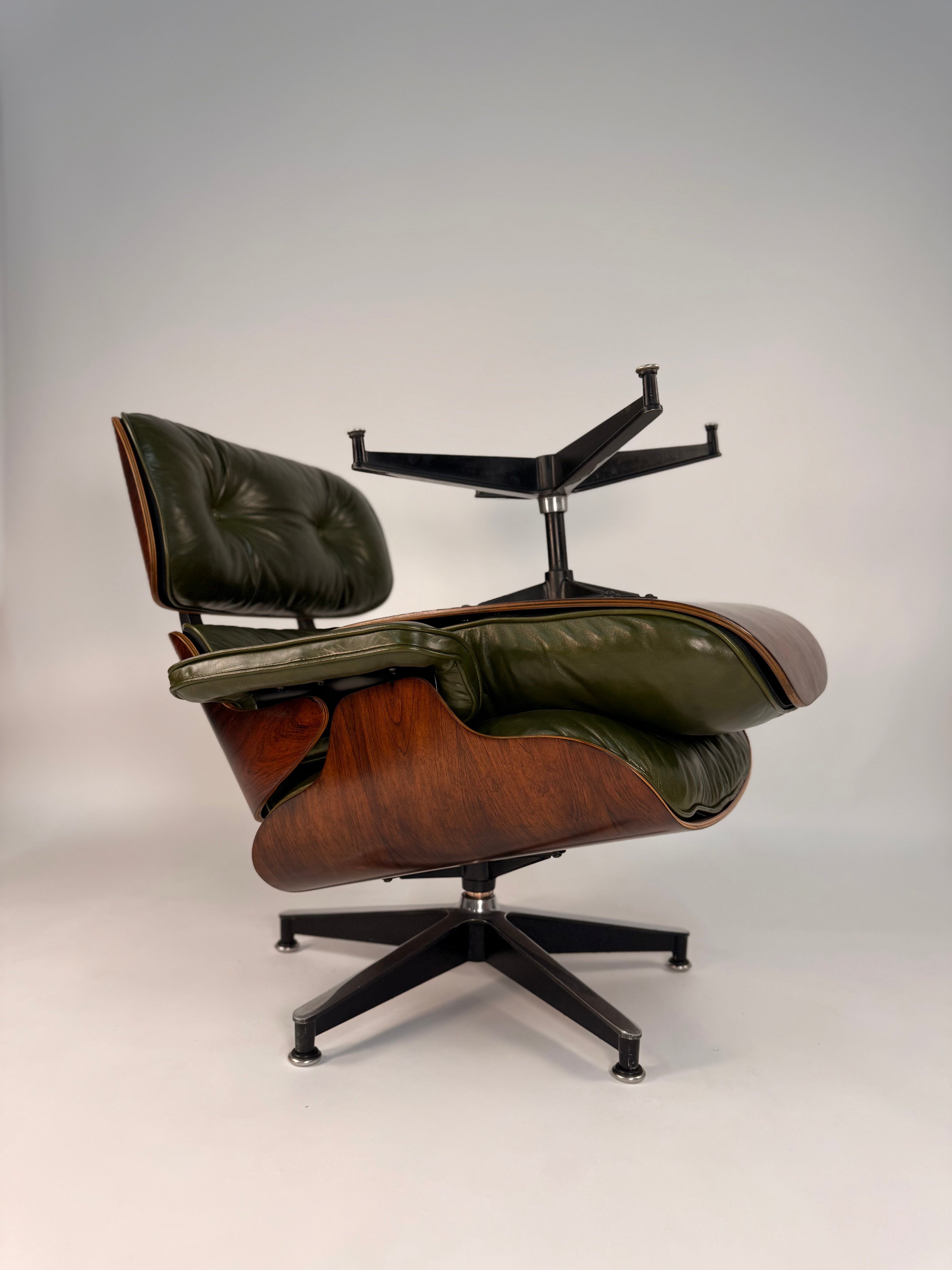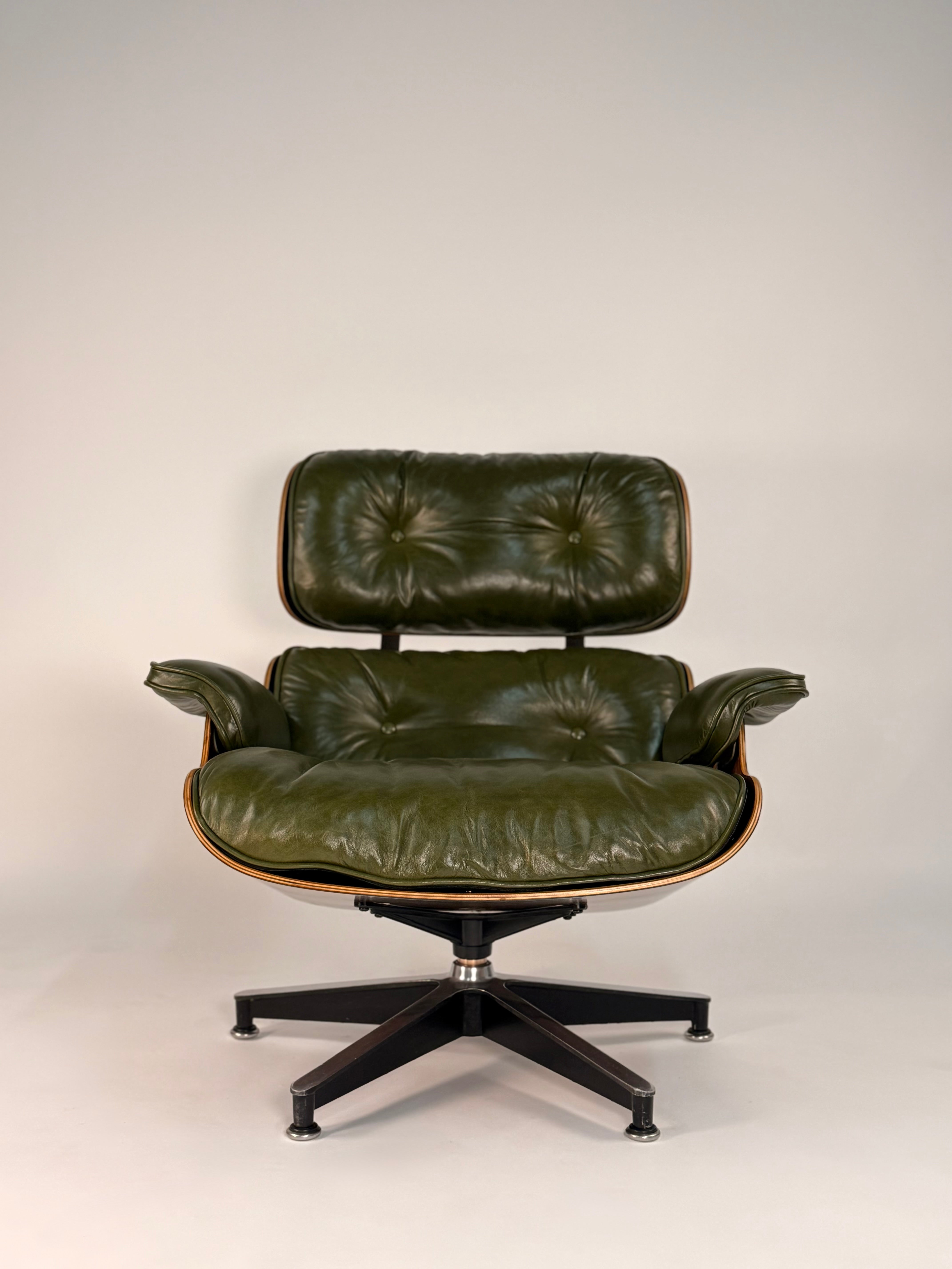 Fully restored for both beauty and comfort, this authentic later first-generation Eames Lounge Chair in rosewood has been meticulously refinished and has been reupholstered in supple new moss green Italian leather. The rosewood shells have been expertly restored to reveal their rich, fiery grain and deep natural warmth. Four newly replaced shock mounts beneath the arms ensure proper support and longevity while preserving the chair’s original design integrity. The accompanying ottoman, perfectly complements the chair in both proportion and finish—offering a seamless pairing that reflects the enduring craftsmanship of Charles and Ray Eames’ iconic design.
