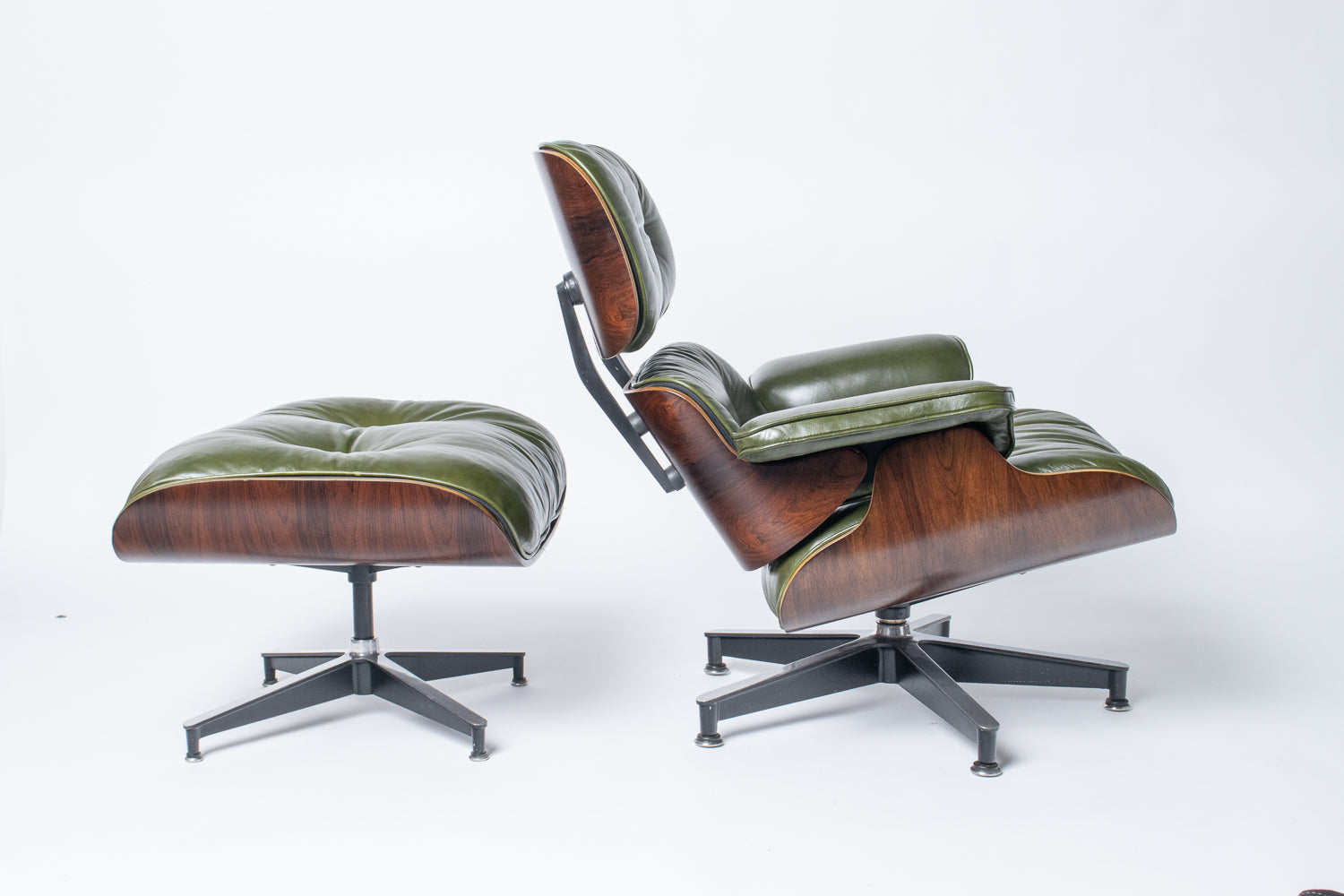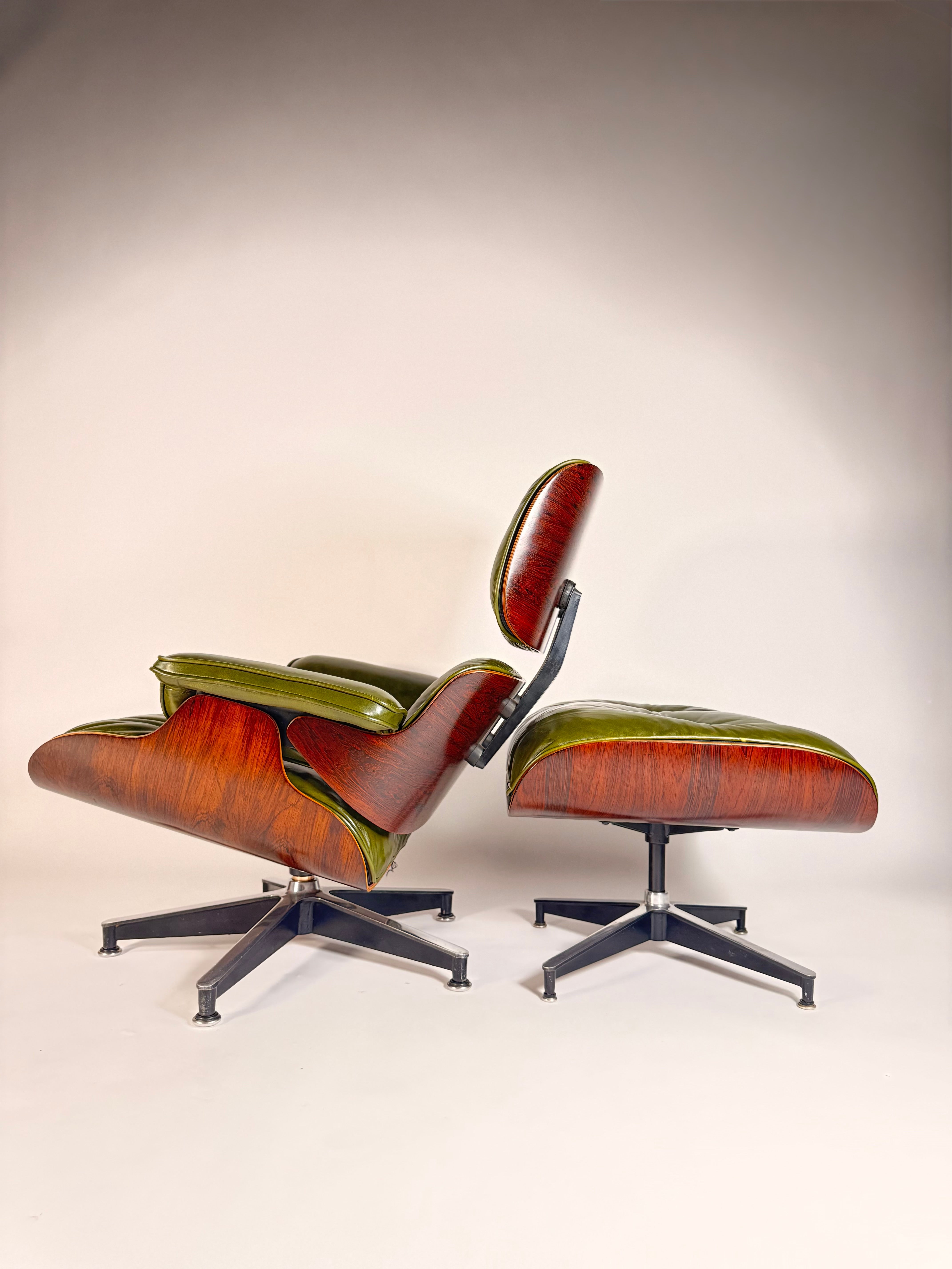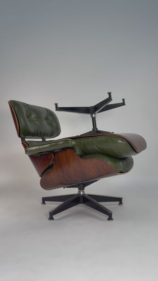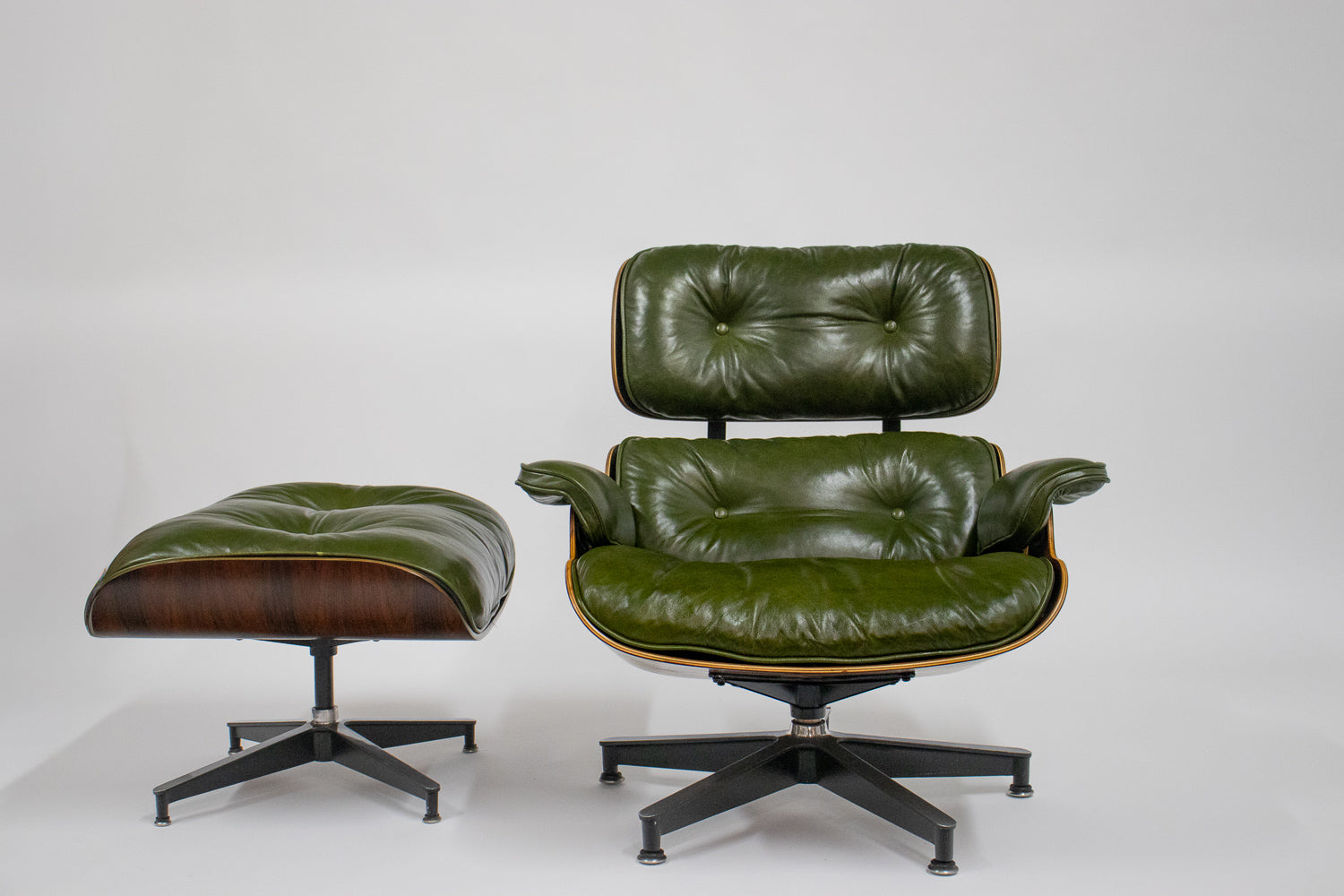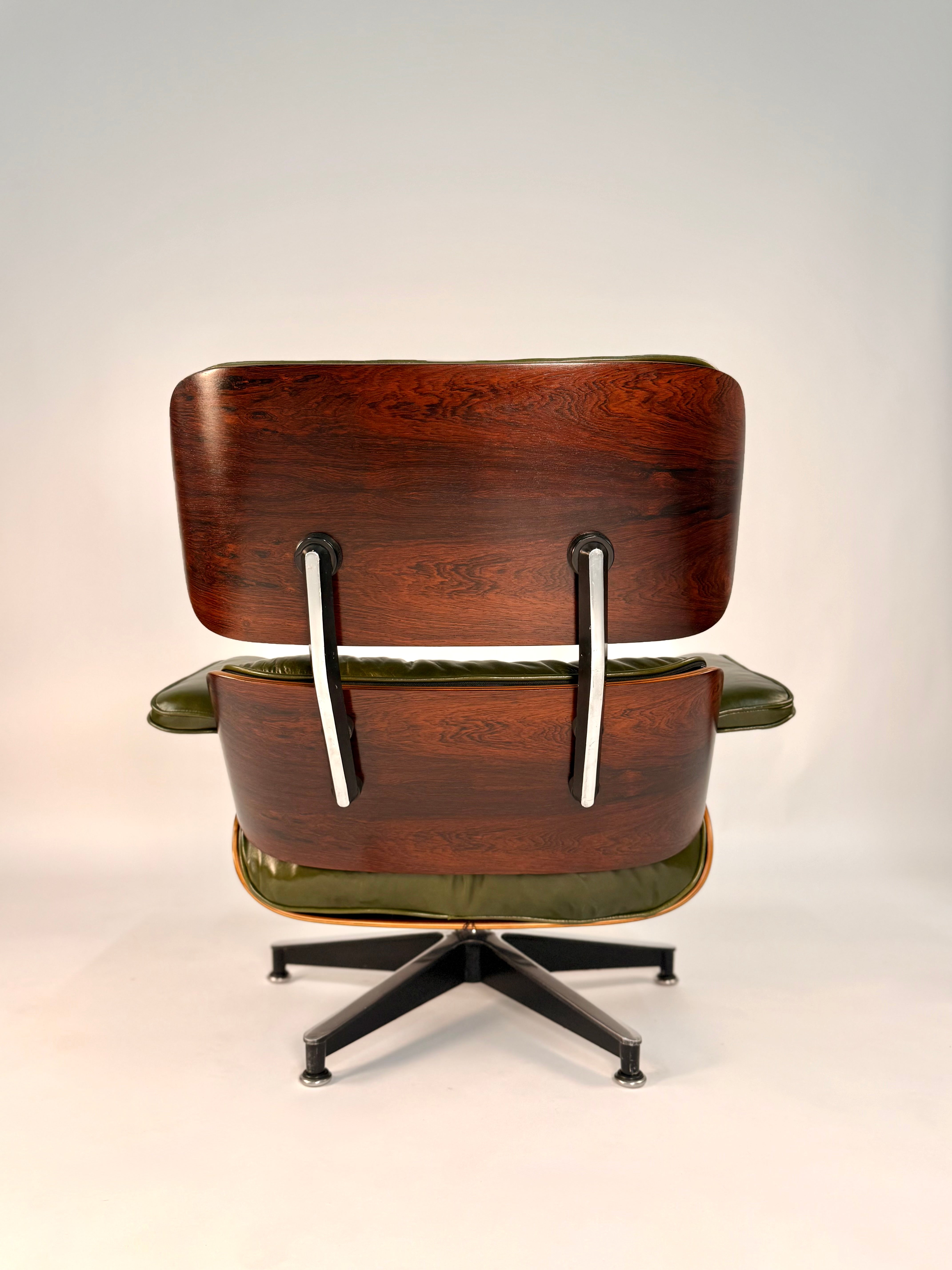 Fully restored for both beauty and comfort, this authentic later first-generation Eames Lounge Chair in rosewood has been meticulously refinished and has been reupholstered in supple new moss green Italian leather. The rosewood shells have been expertly restored to reveal their rich, fiery grain and deep natural warmth. Four newly replaced shock mounts beneath the arms ensure proper support and longevity while preserving the chair’s original design integrity. The accompanying ottoman, perfectly complements the chair in both proportion and finish—offering a seamless pairing that reflects the enduring craftsmanship of Charles and Ray Eames’ iconic design.