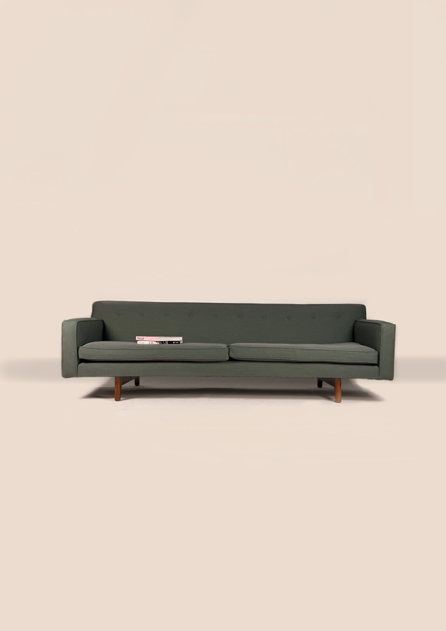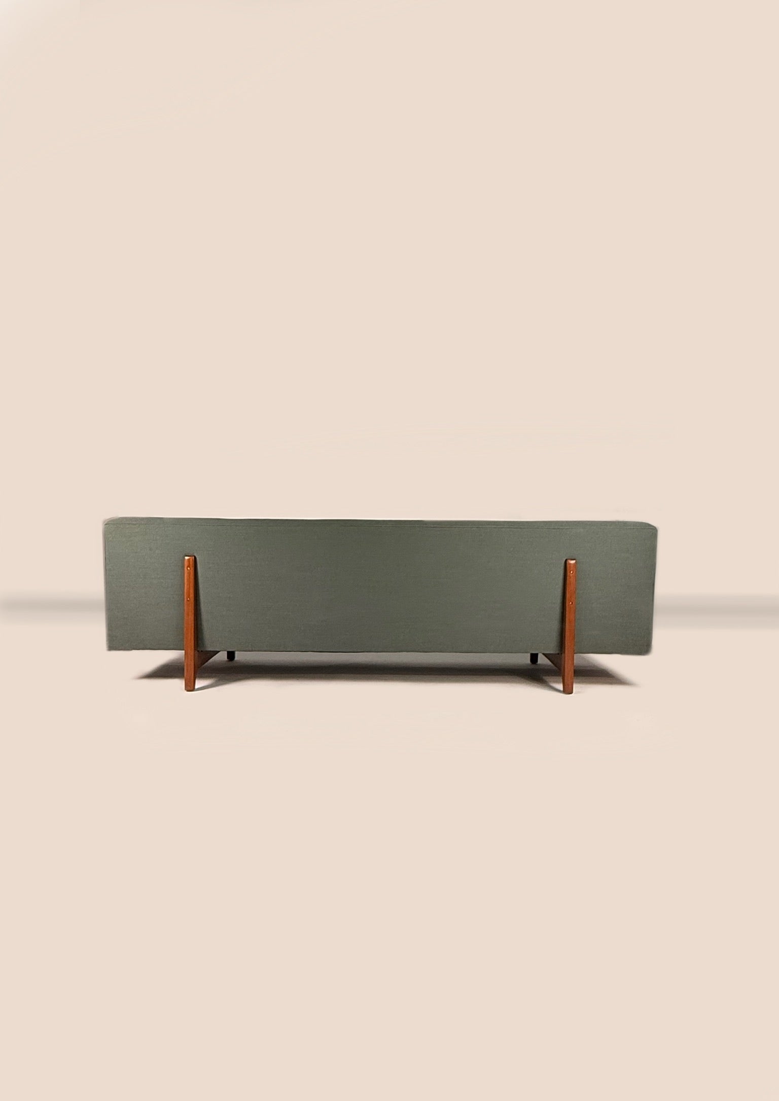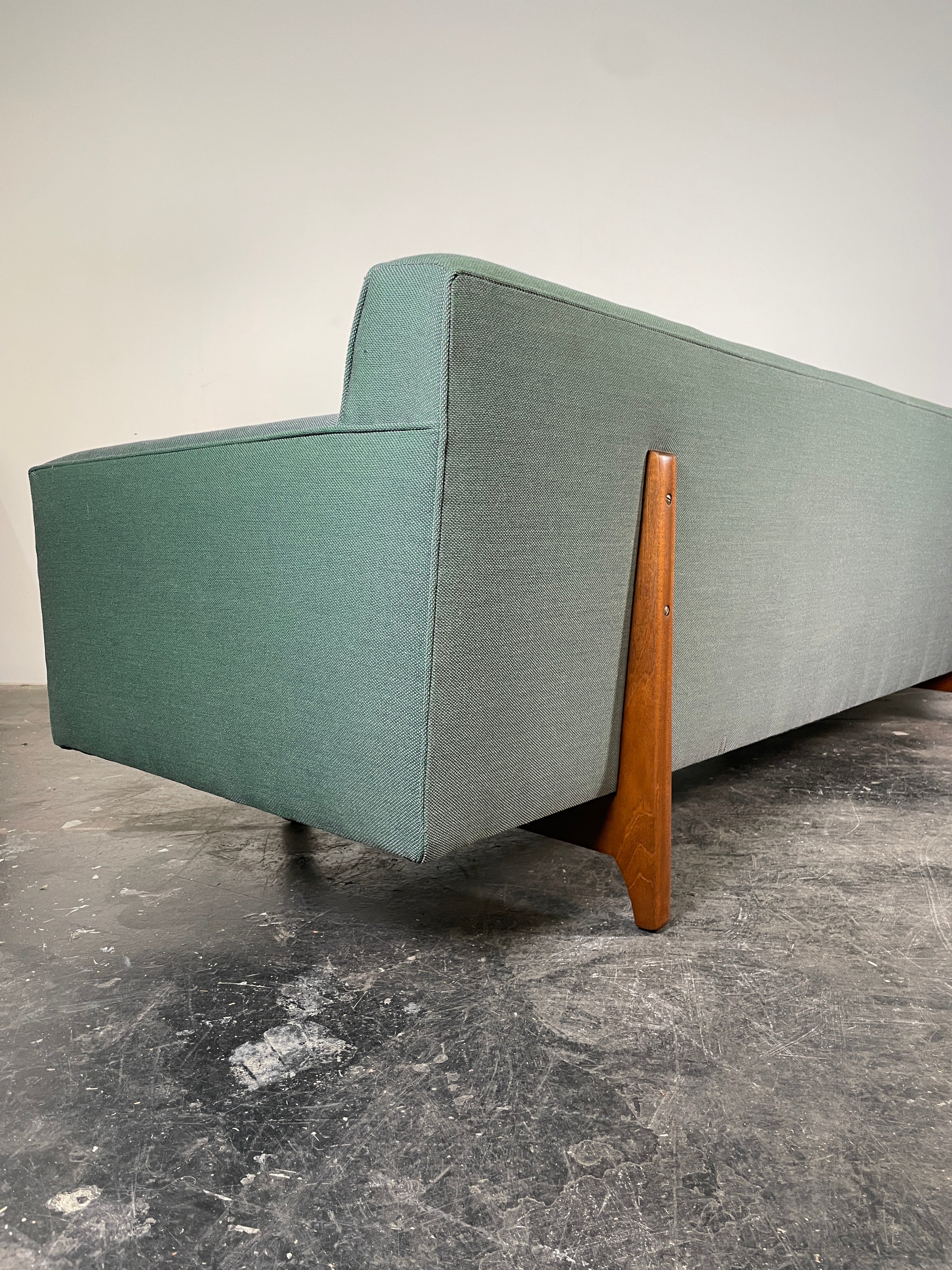 The sofa as been reupholstered in a fresh new Kvadrat SteelCut Trio 3: Color: 966 Emerald fabric which was originally designed by Frans Dijkmeijer, it comes in updated color ways crafted by Giulio Ridolfo.ย The fabric contrasts beautifully with the warm bracketed wood. Amazingly comfortable for a family room or a bedroom and it will be the perfect addition to any space. This sofa will look amazing floating in a room.ย