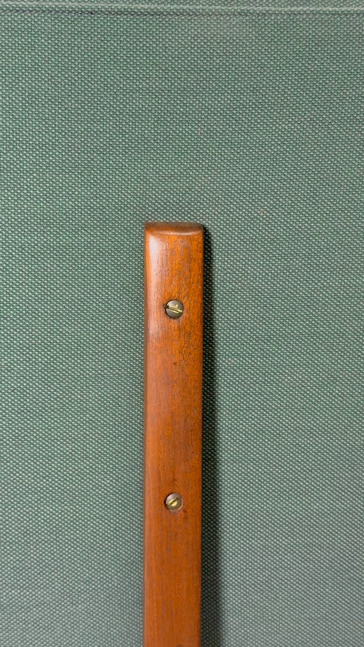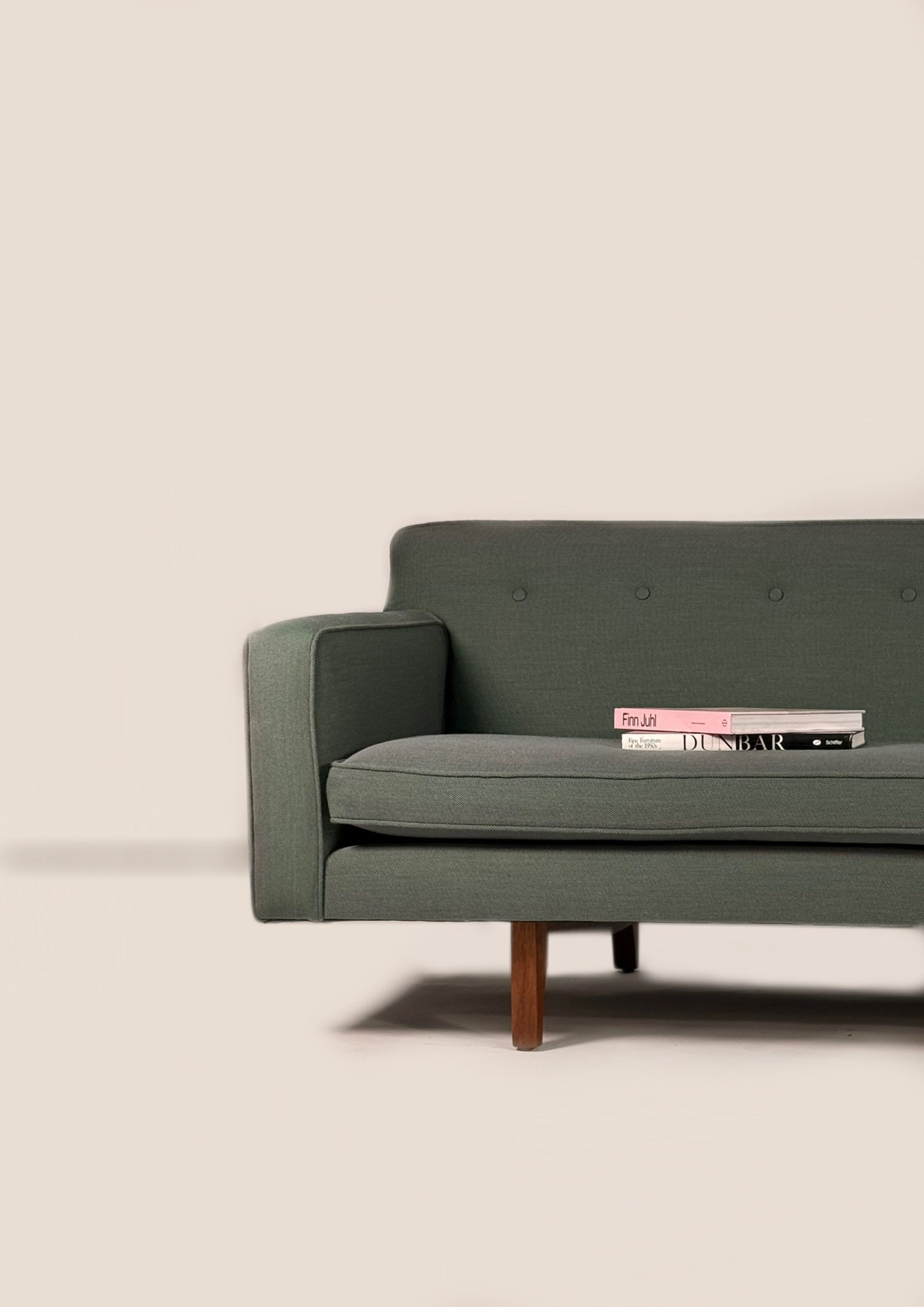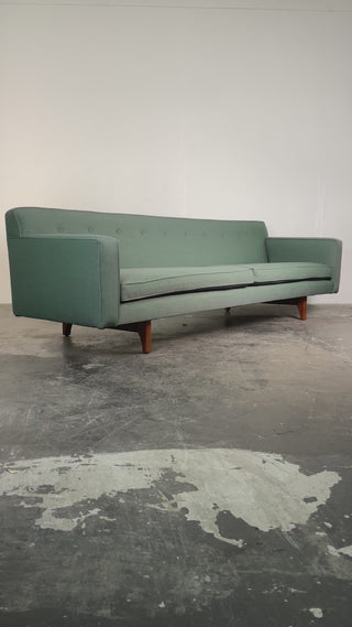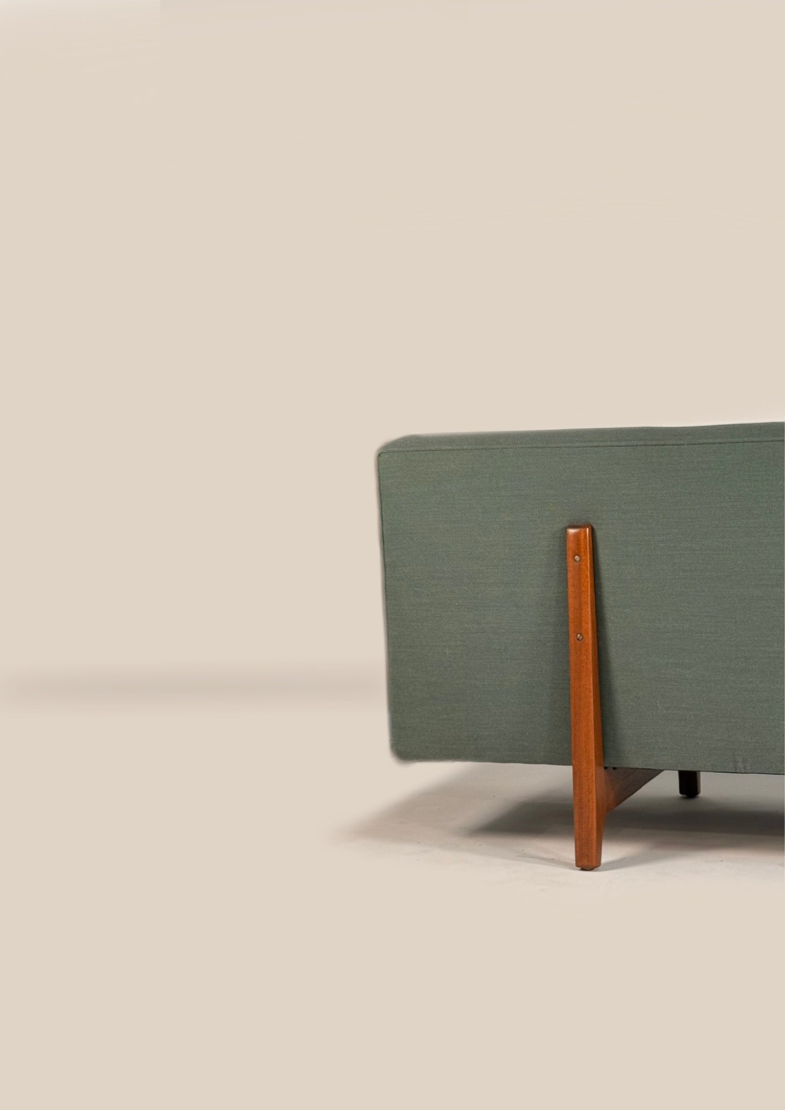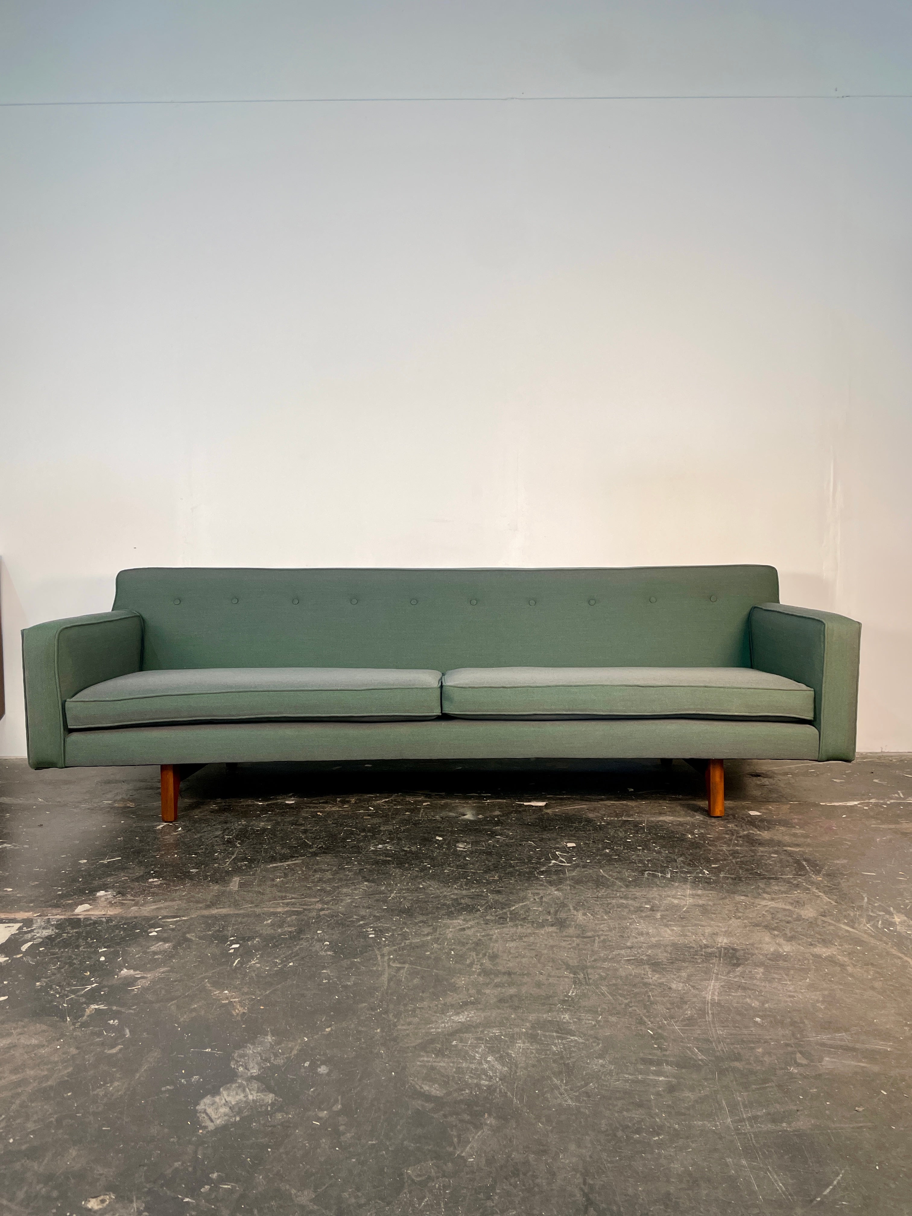 The sofa as been reupholstered in a fresh new Kvadrat SteelCut Trio 3: Color: 966 Emerald fabric which was originally designed by Frans Dijkmeijer, it comes in updated color ways crafted by Giulio Ridolfo.ย The fabric contrasts beautifully with the warm bracketed wood. Amazingly comfortable for a family room or a bedroom and it will be the perfect addition to any space. This sofa will look amazing floating in a room.ย