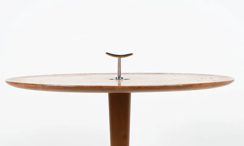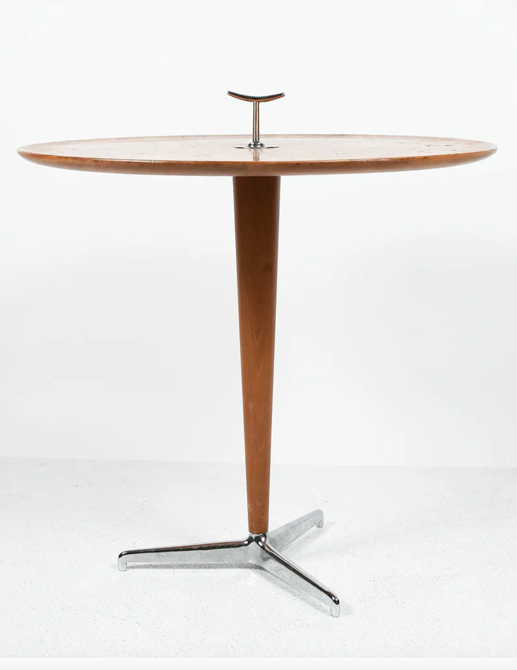 Raised on chromed legs. Small handle allows for easy in moving the table.