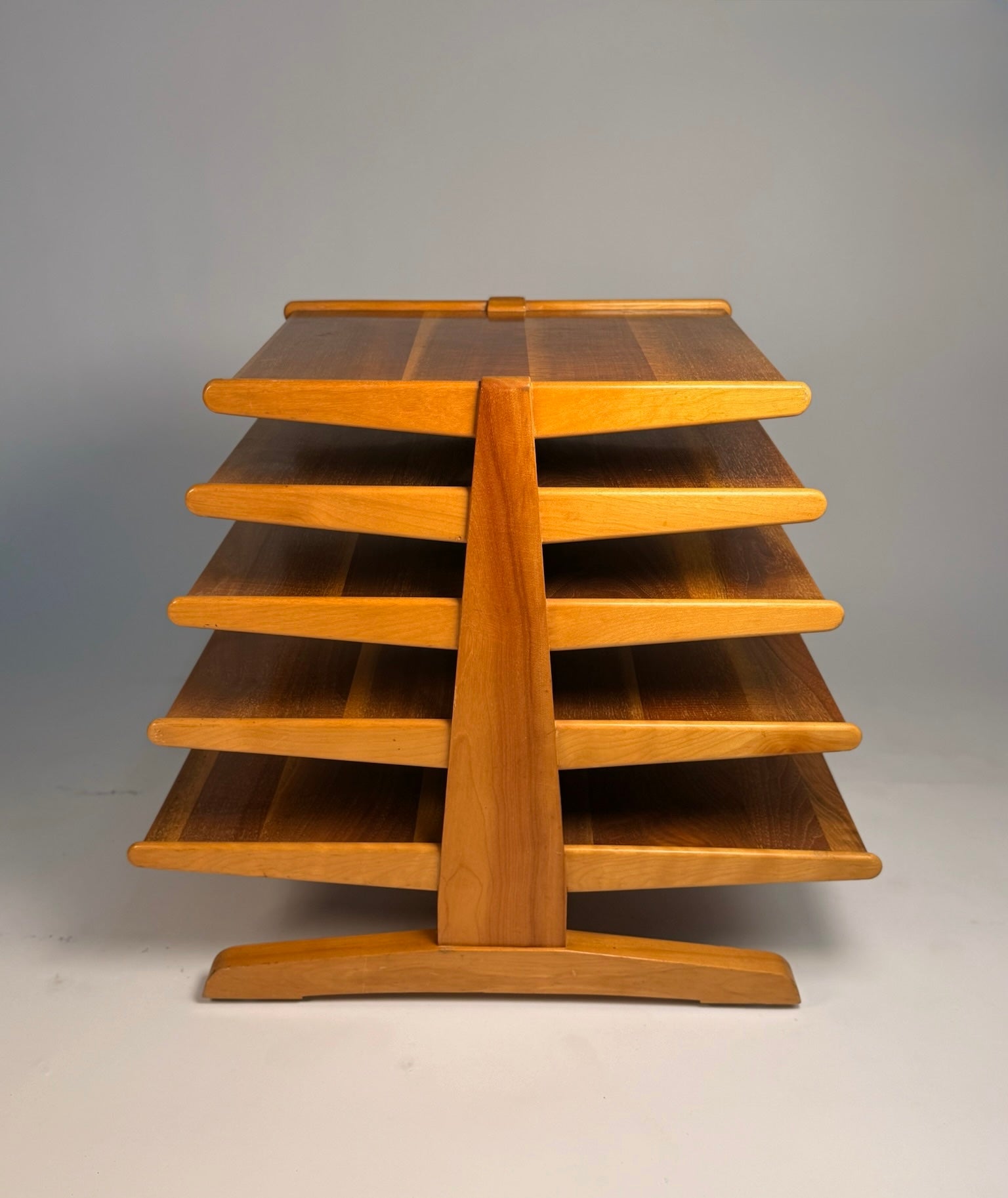 Architectural, useful, and unmistakably Dunbar, this Edward Wormley “Magazine Tree” table presents five cantilevered trays radiating from a central upright—an elegant way to stage books, magazines, or objects while keeping a compact footprint. Crafted in solid walnut with soft bullnose edges and Dunbar’s refined joinery, it reads like a small piece of sculpture beside a lounge chair or sofa.