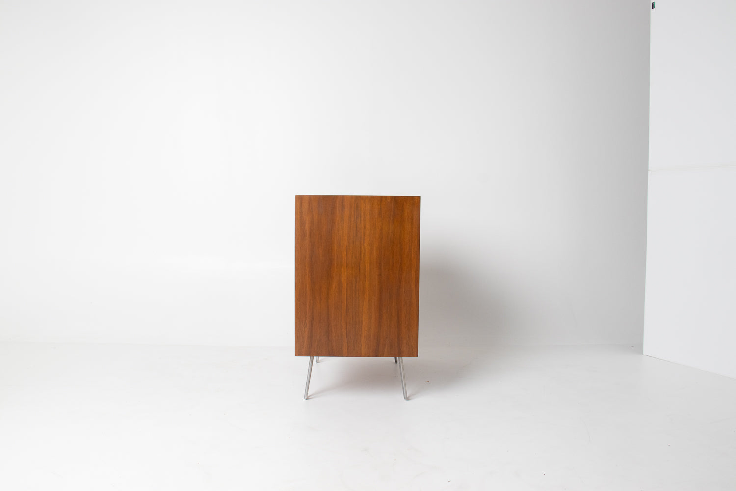 A refined example from George Nelson’s iconic Basic Series for Herman Miller, this three-drawer walnut dresser perfectly captures the clean lines and honest materiality that defined post-war American modernism. The warm walnut case features a restrained, architectural silhouette paired with its most distinctive design detail — an unusual set of sculptural hairpin legs that lift the cabinet visually and give the piece a light, elevated stance.