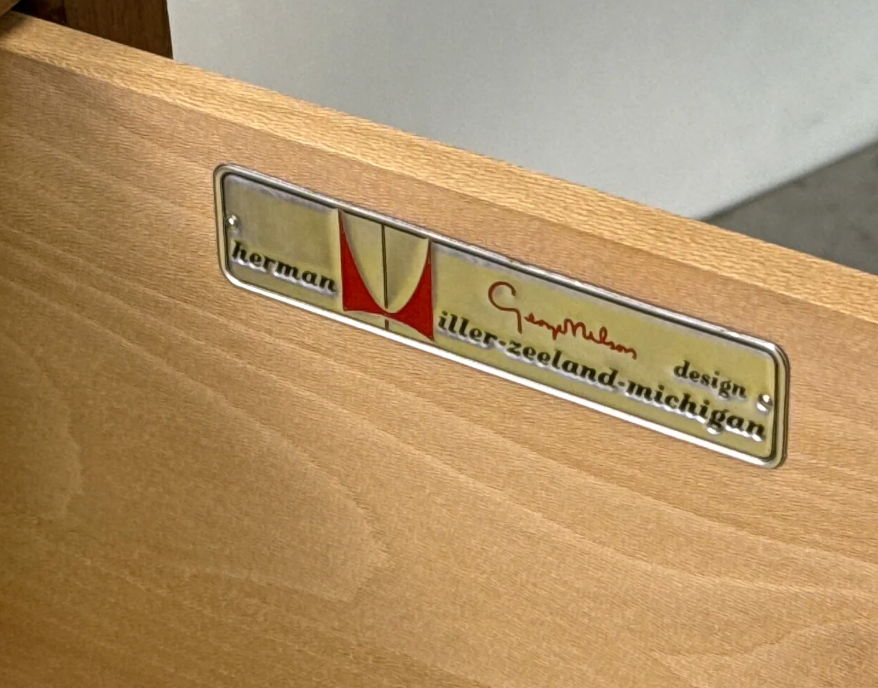 The drawers are fitted with understated brushed metal pulls that echo Nelson’s emphasis on function-forward elegance. Inside the top drawer, the dresser proudly retains its original Herman Miller label, confirming its authenticity and heritage.