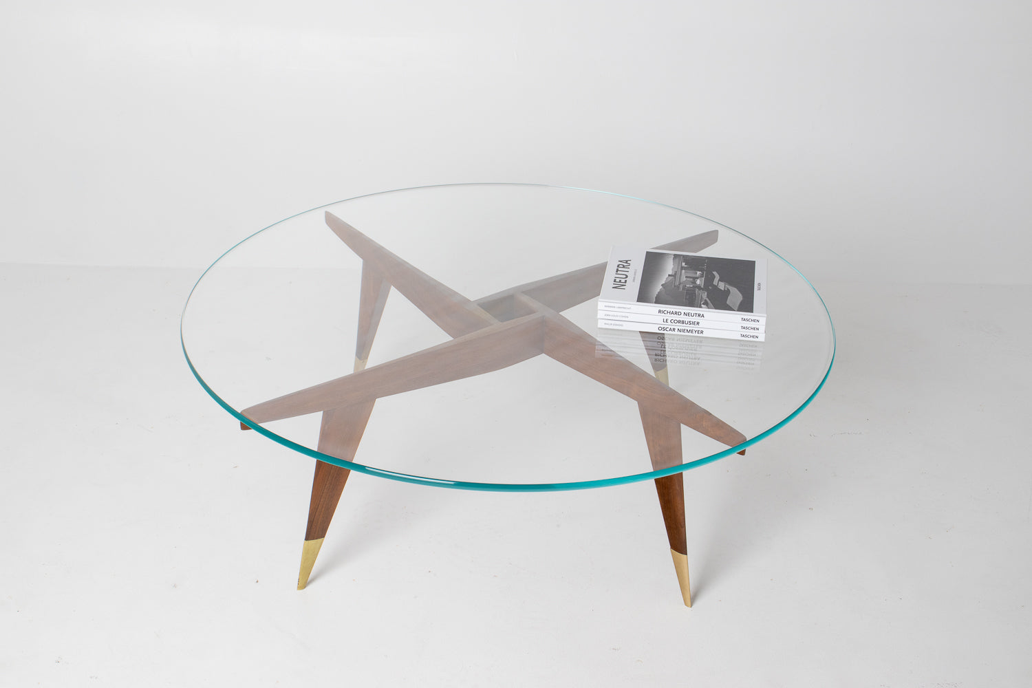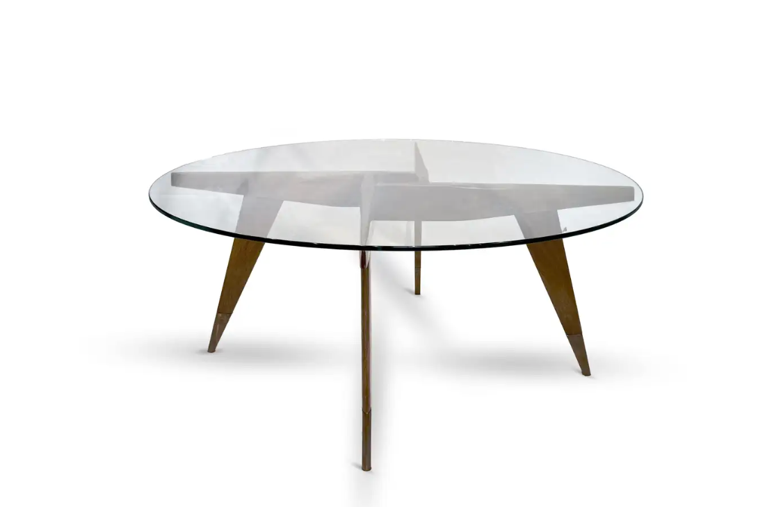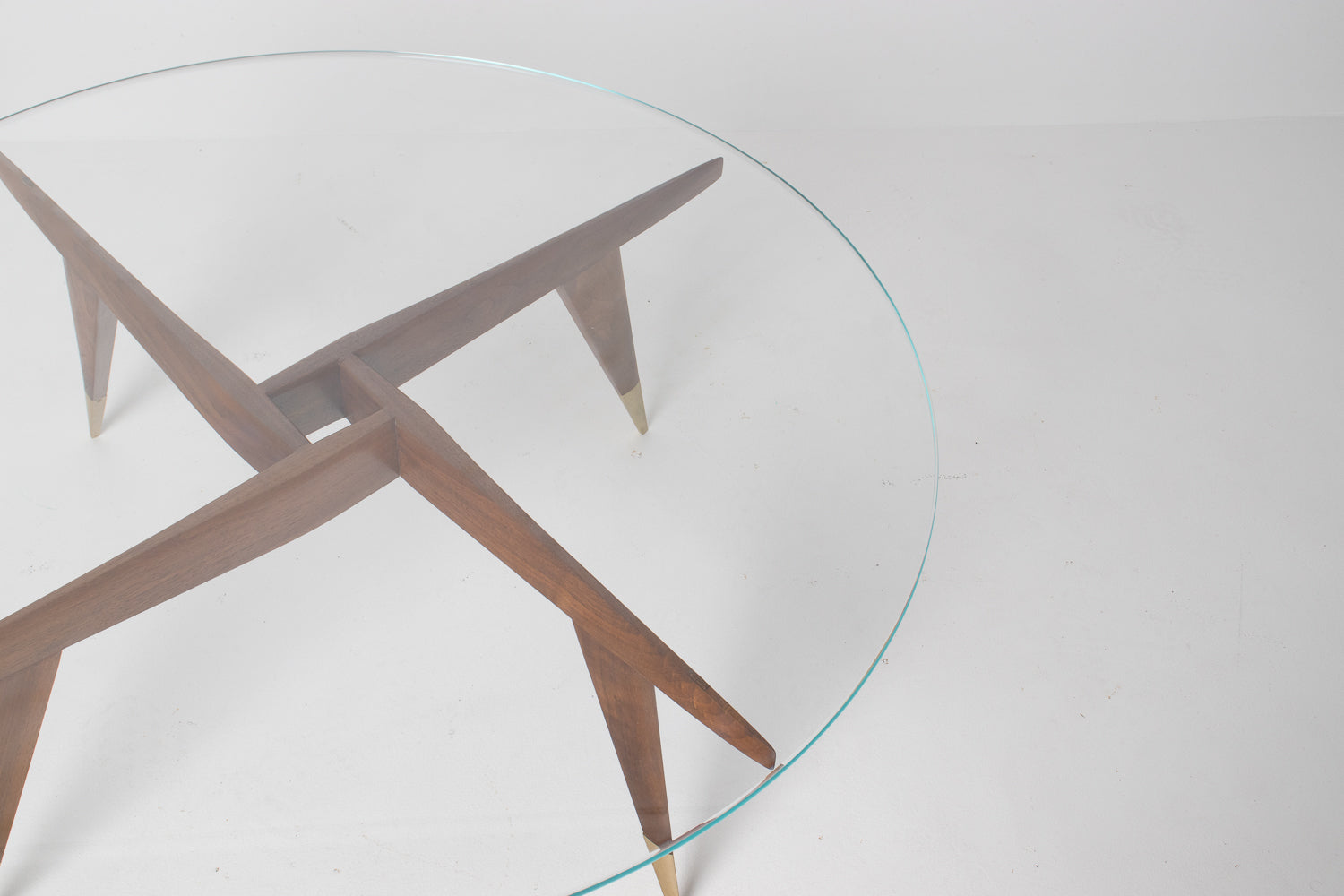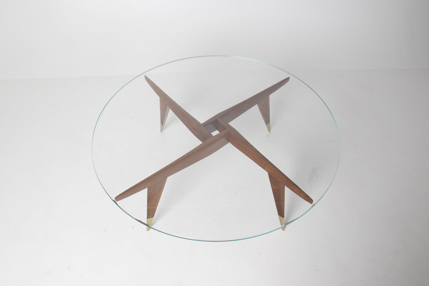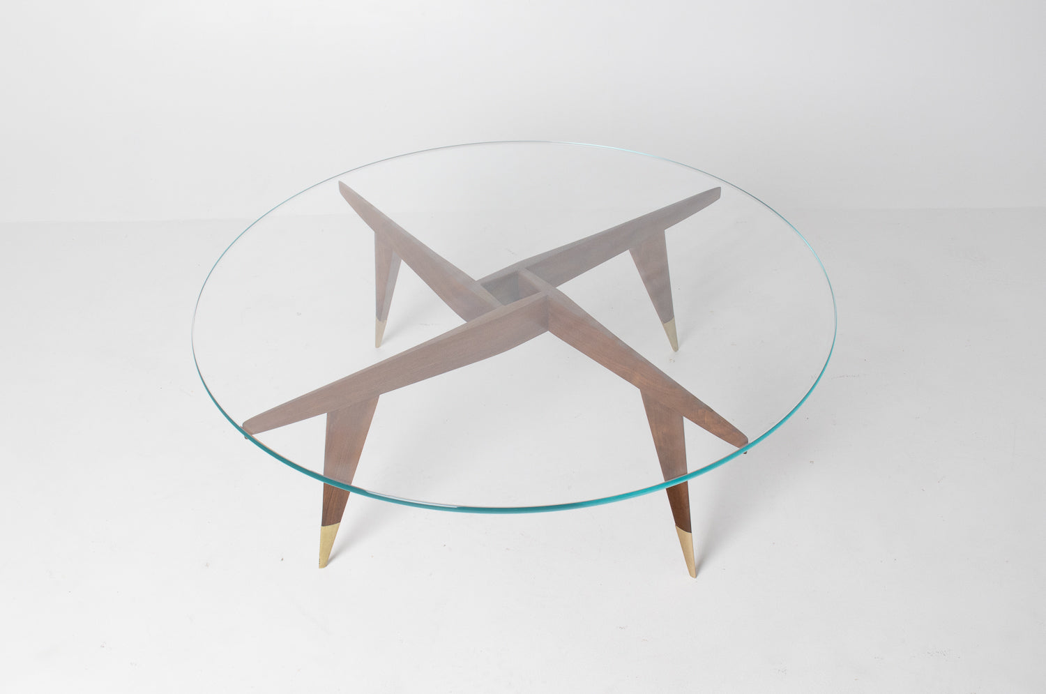 The base is beautifully constructed in rich walnut, formed by four sharply tapered legs that meet in a striking geometric configuration beneath the glass. At the feet, refined brass caps stamped โMade in Italyโ provide both a visual accent and a hallmark of authenticity โ a subtle but meaningful detail cherished by collectors.