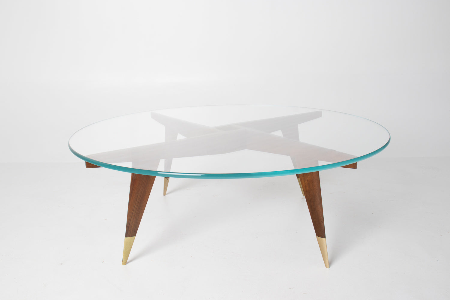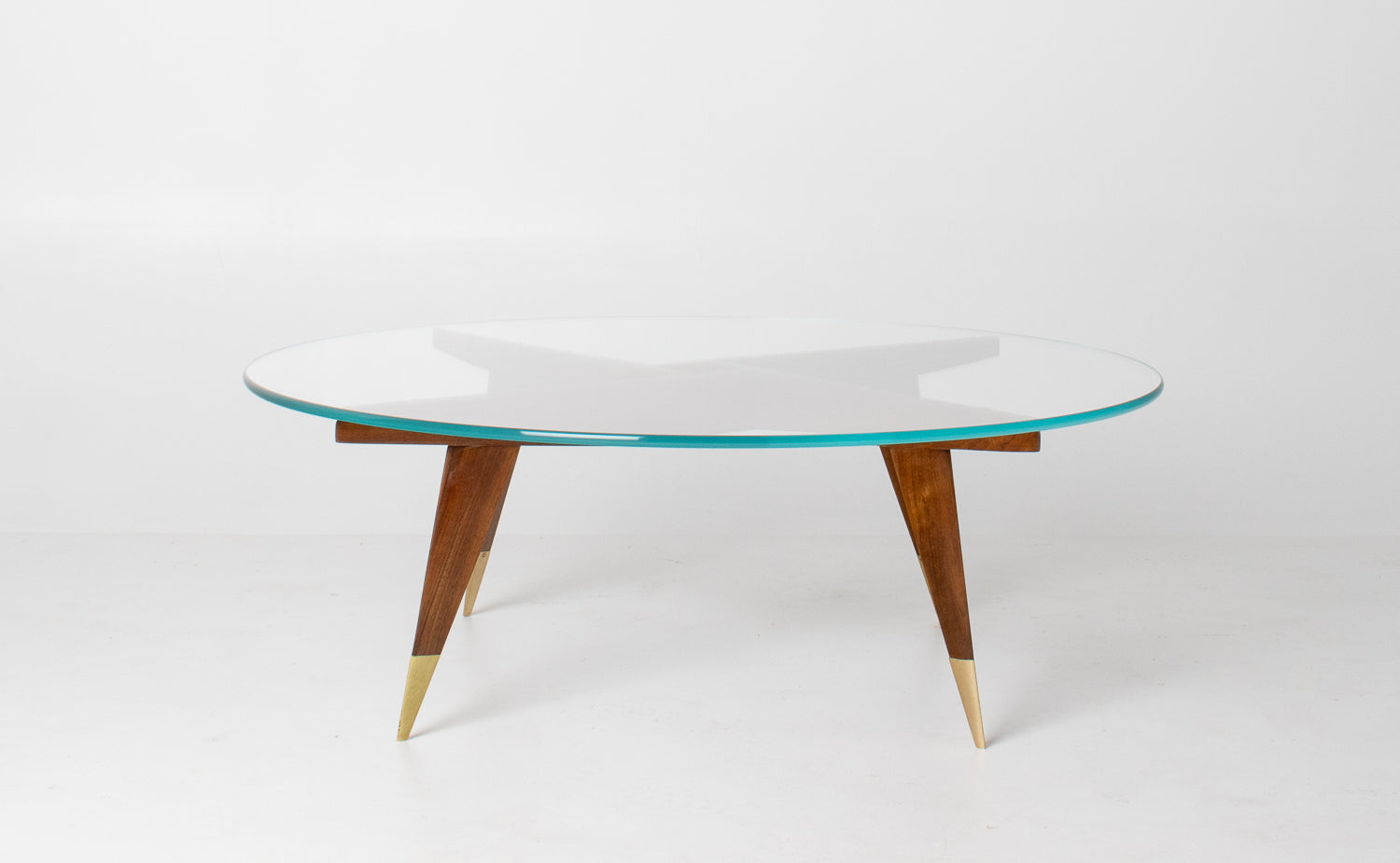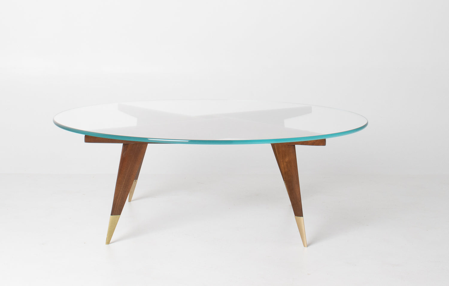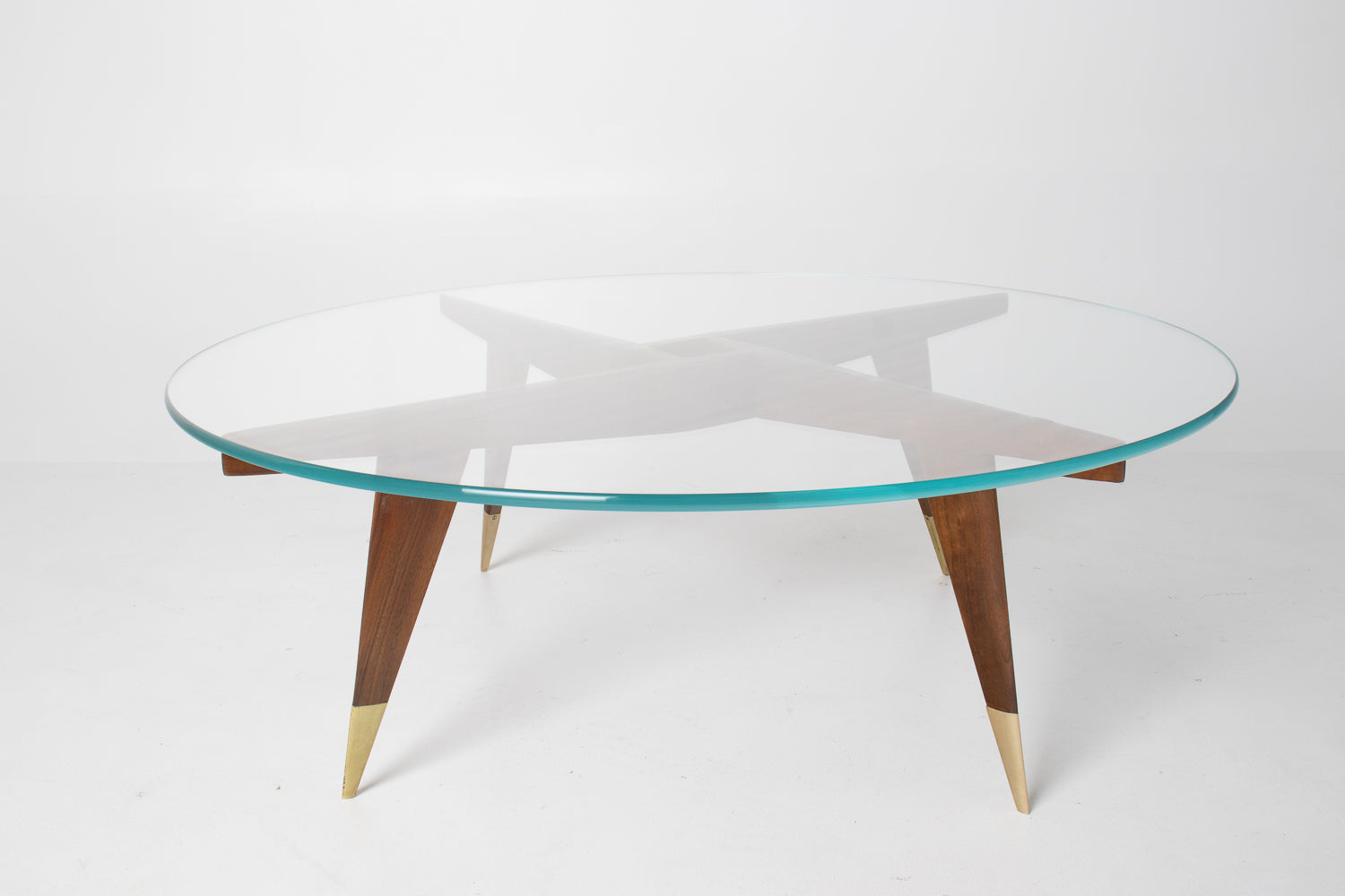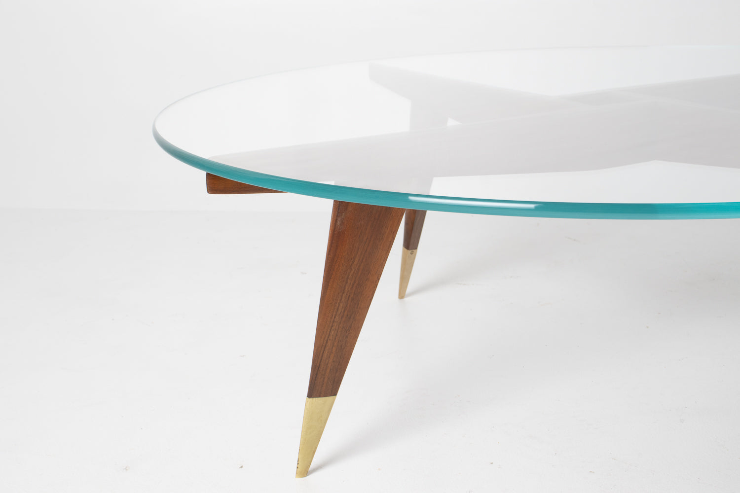 The base is beautifully constructed in rich walnut, formed by four sharply tapered legs that meet in a striking geometric configuration beneath the glass. At the feet, refined brass caps stamped โMade in Italyโ provide both a visual accent and a hallmark of authenticity โ a subtle but meaningful detail cherished by collectors.