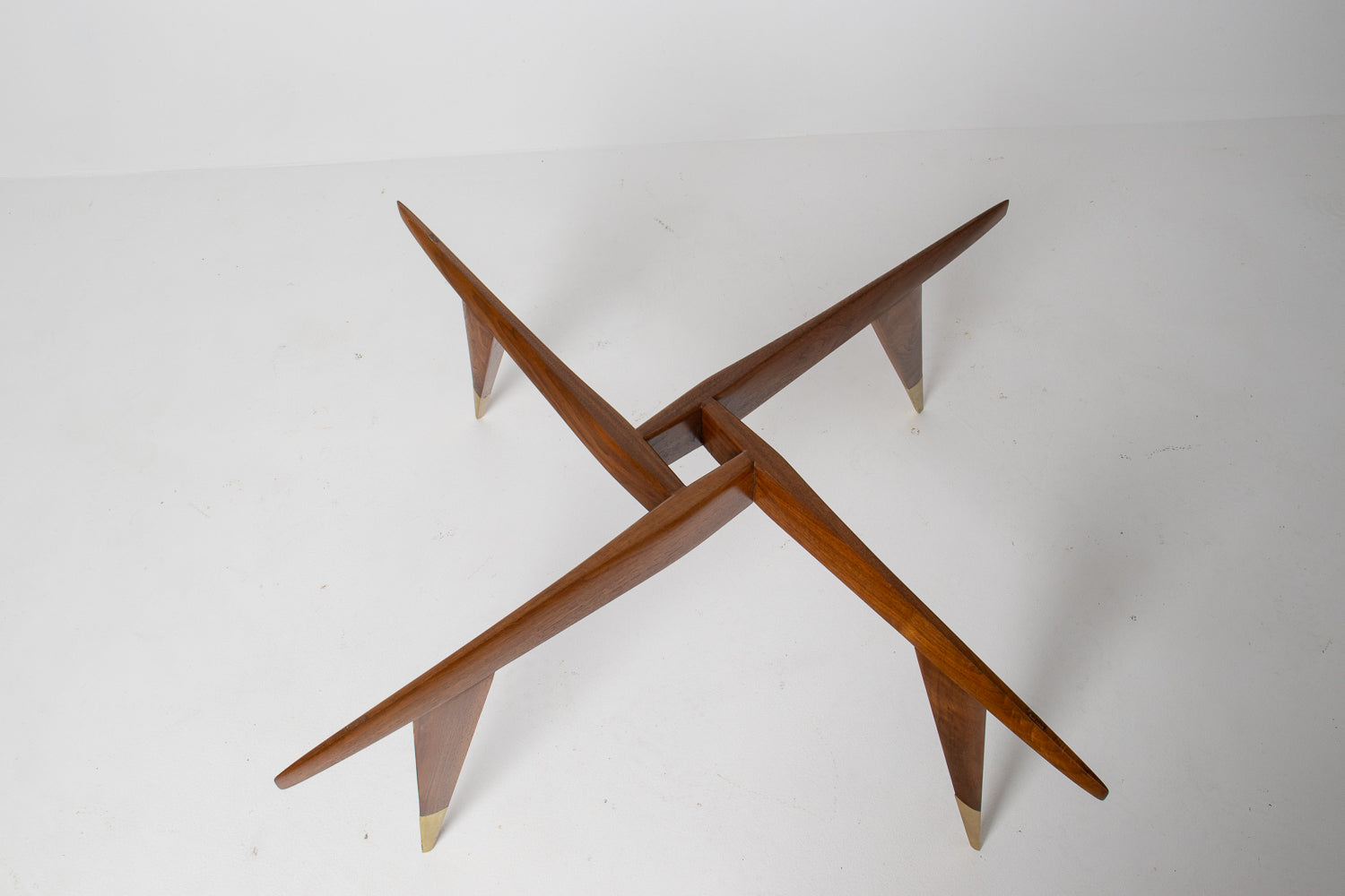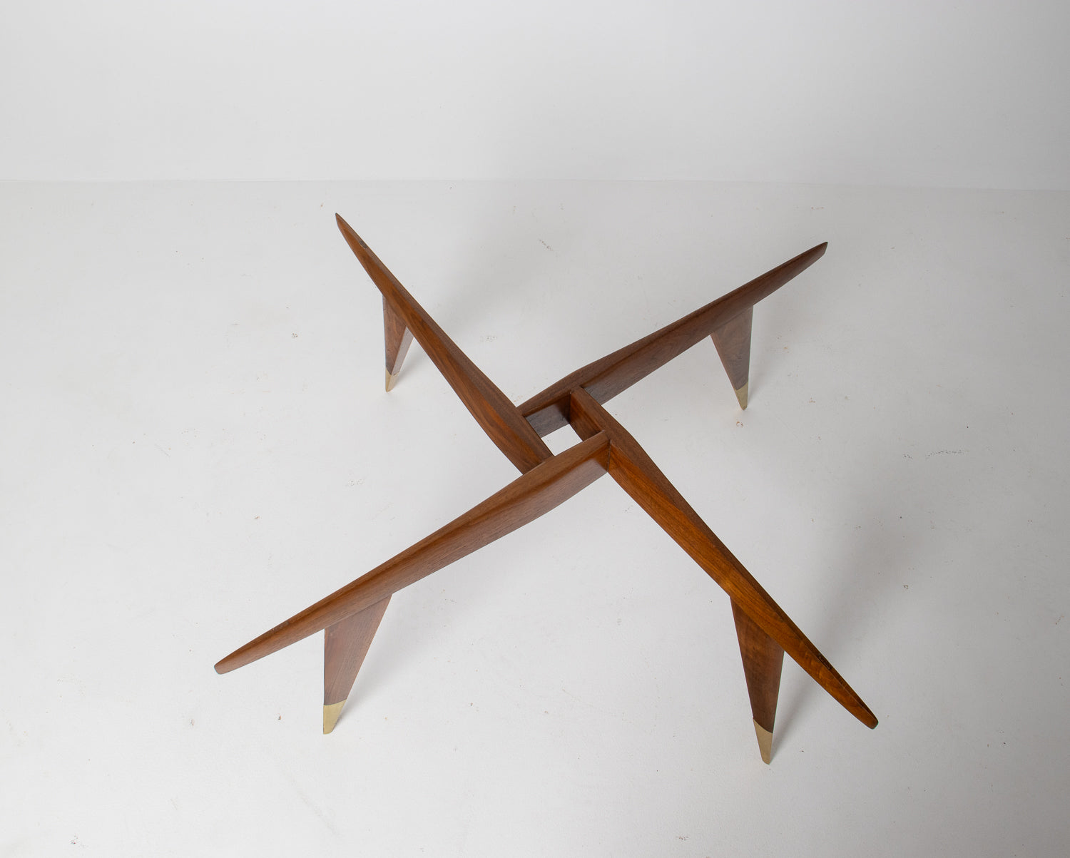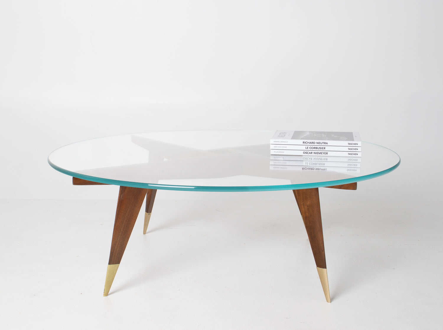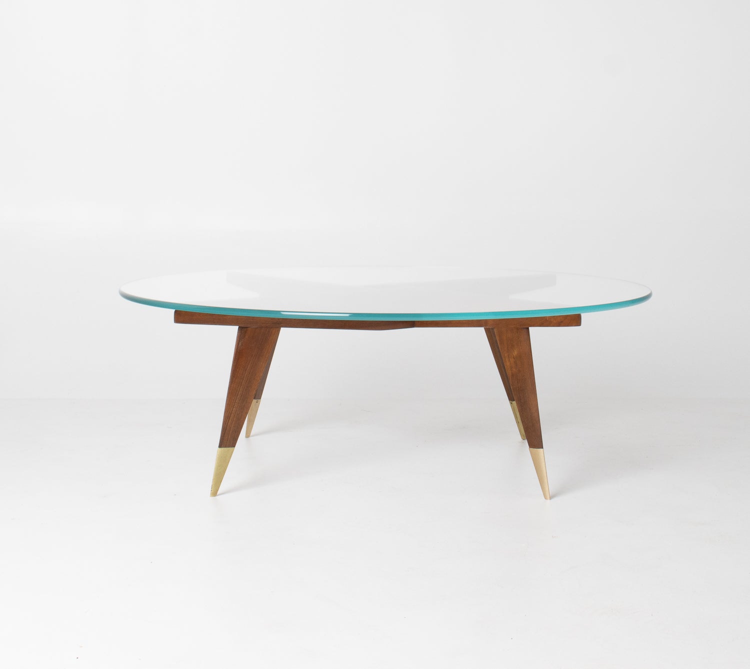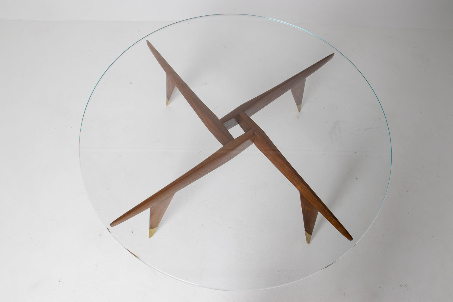 The base is beautifully constructed in rich walnut, formed by four sharply tapered legs that meet in a striking geometric configuration beneath the glass. At the feet, refined brass caps stamped โMade in Italyโ provide both a visual accent and a hallmark of authenticity โ a subtle but meaningful detail cherished by collectors.