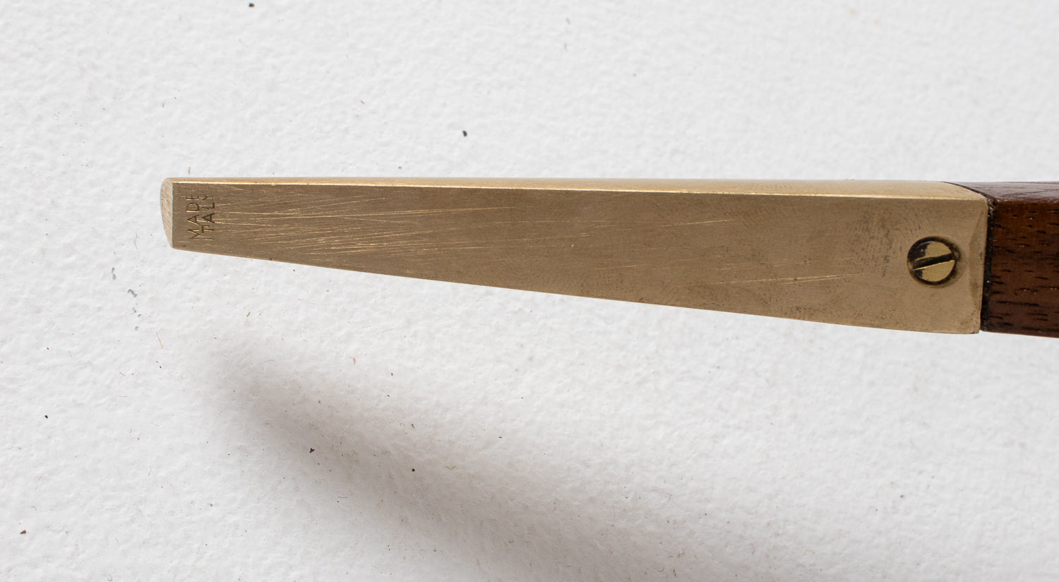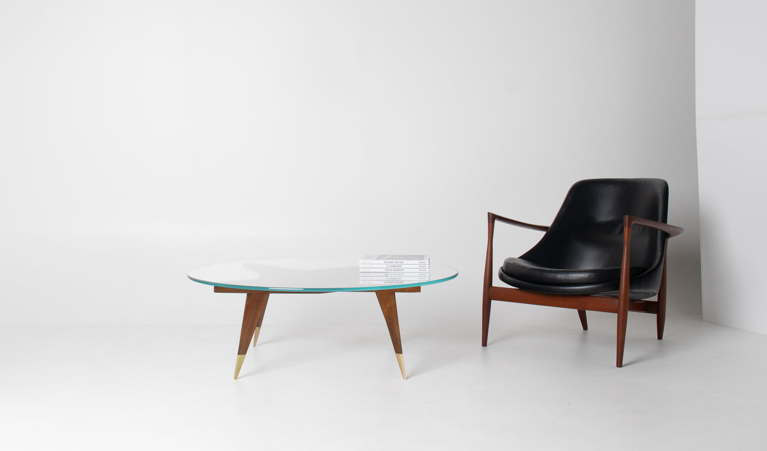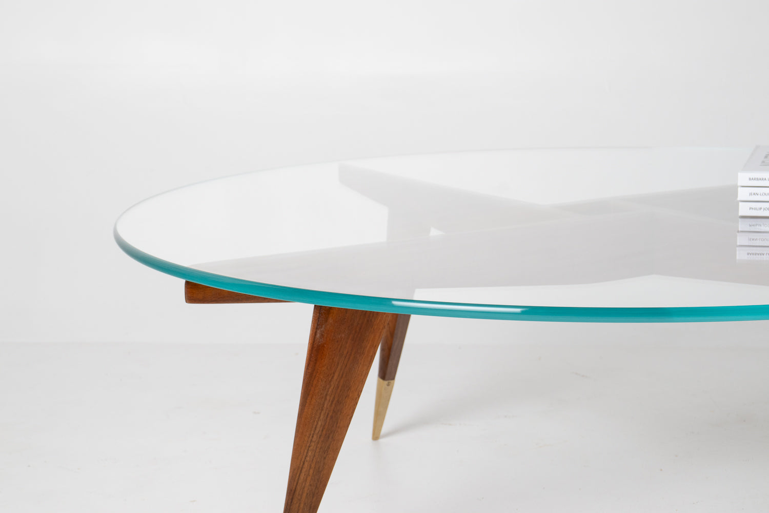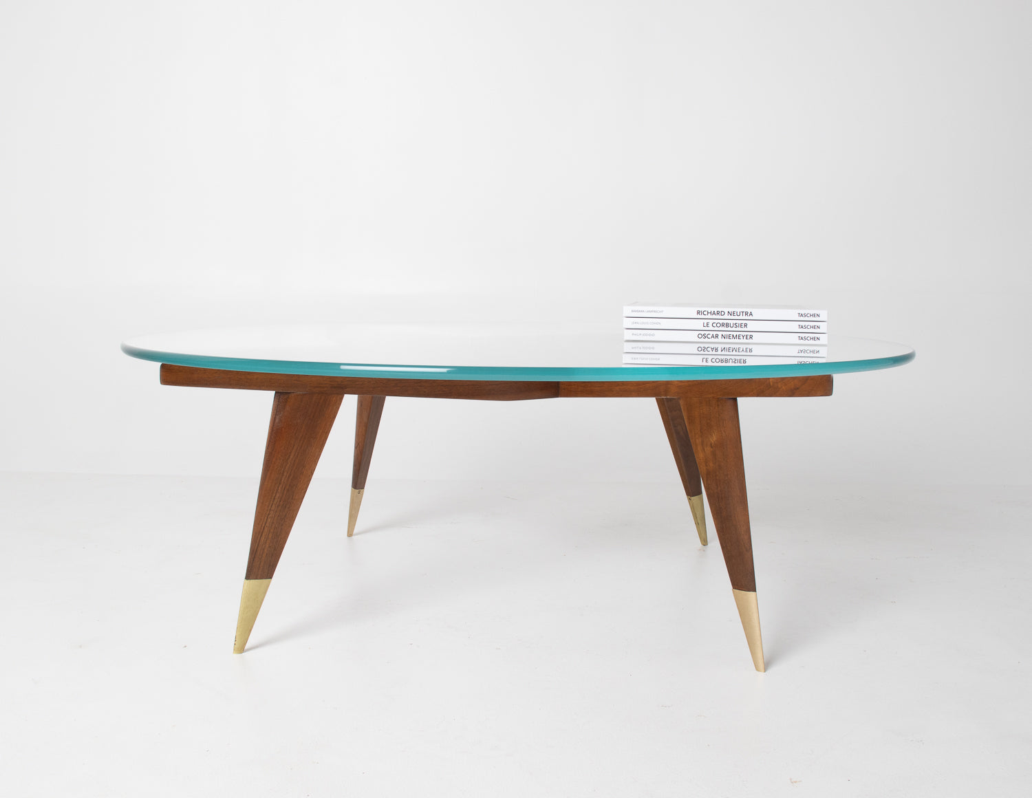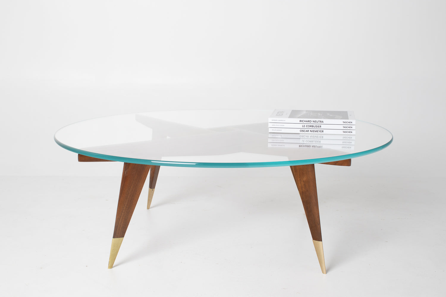 The base is beautifully constructed in rich walnut, formed by four sharply tapered legs that meet in a striking geometric configuration beneath the glass. At the feet, refined brass caps stamped โMade in Italyโ provide both a visual accent and a hallmark of authenticity โ a subtle but meaningful detail cherished by collectors.