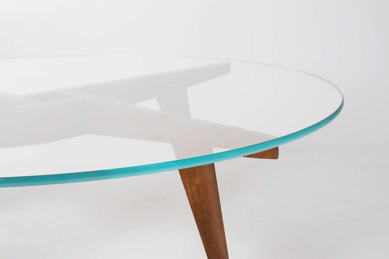 The circular beveled glass top rests lightly on the walnut structure, fully removable and designed to emphasize transparency and airiness โ a recurring Ponti theme, allowing light to move through the form rather than sit atop it. The proportions feel effortless and well-resolved, making the piece both sculptural and highly functional as a centerpiece.