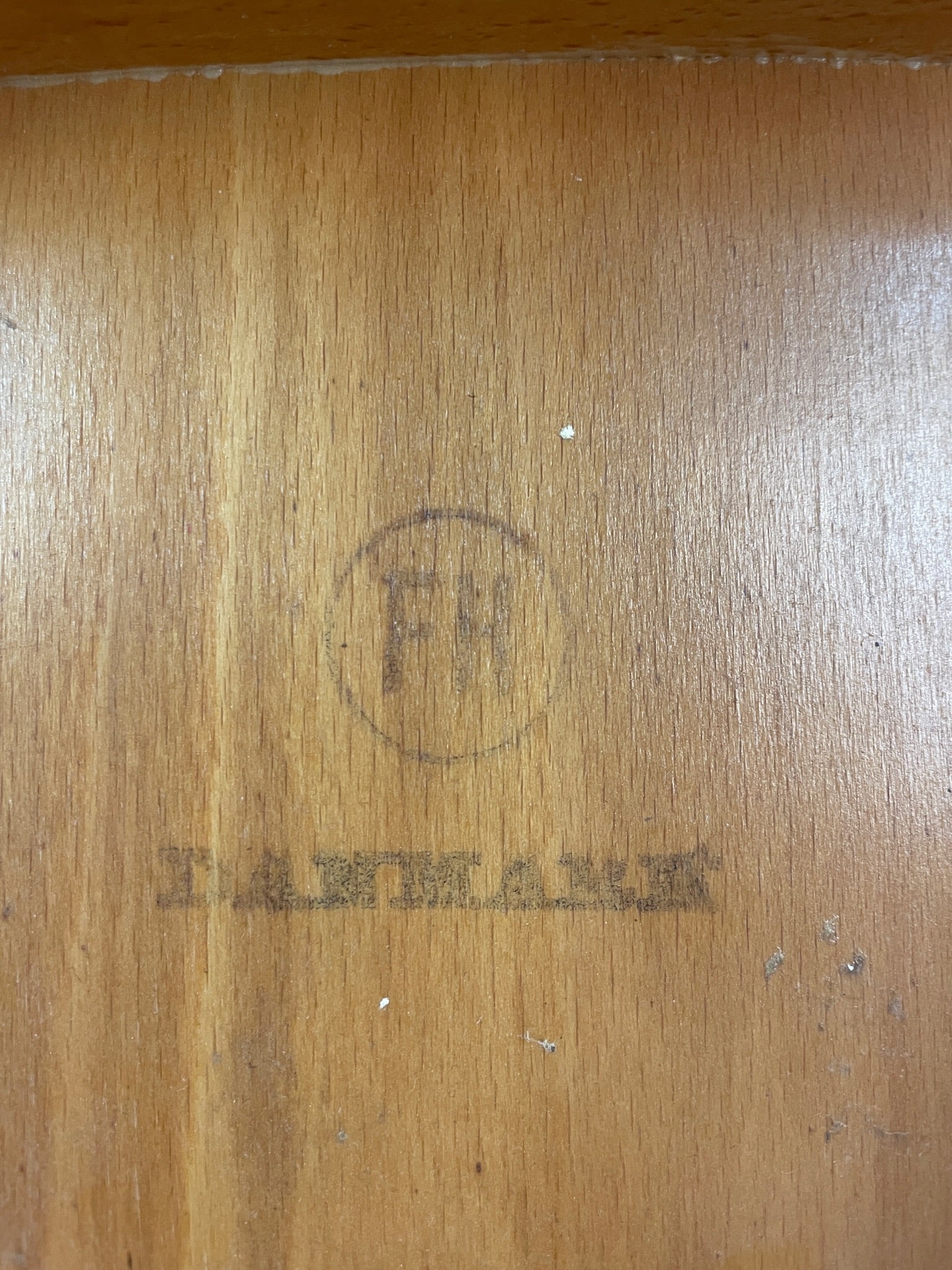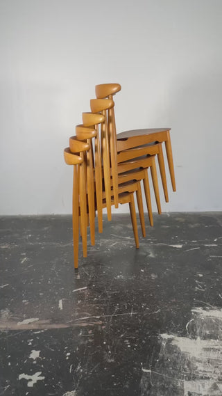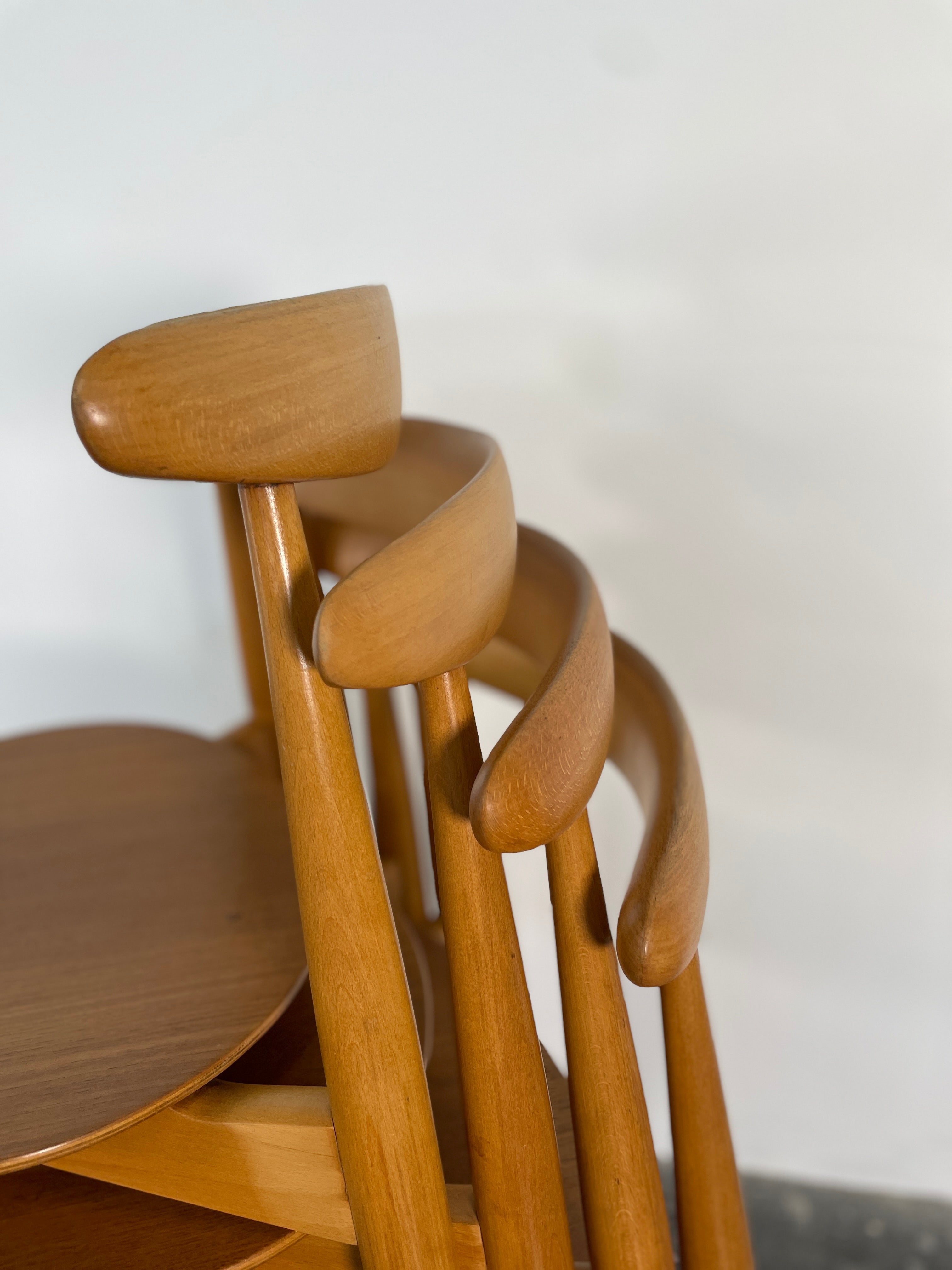 Hans Wegner "Heart" for Fritz Hansen Beech and Teak Heart Dining Table and set of 6 chairs with teak plywood seats. These chairs are supremely comfortable with a unique three legged design and a backrest that feels very comfortable on your back. This unique design features allows them to be stacked and fit around the table. The table is also a three legged design, made of beech legs for strength and a teak top durability and beauty day to day. Amazing set for the collector.ย