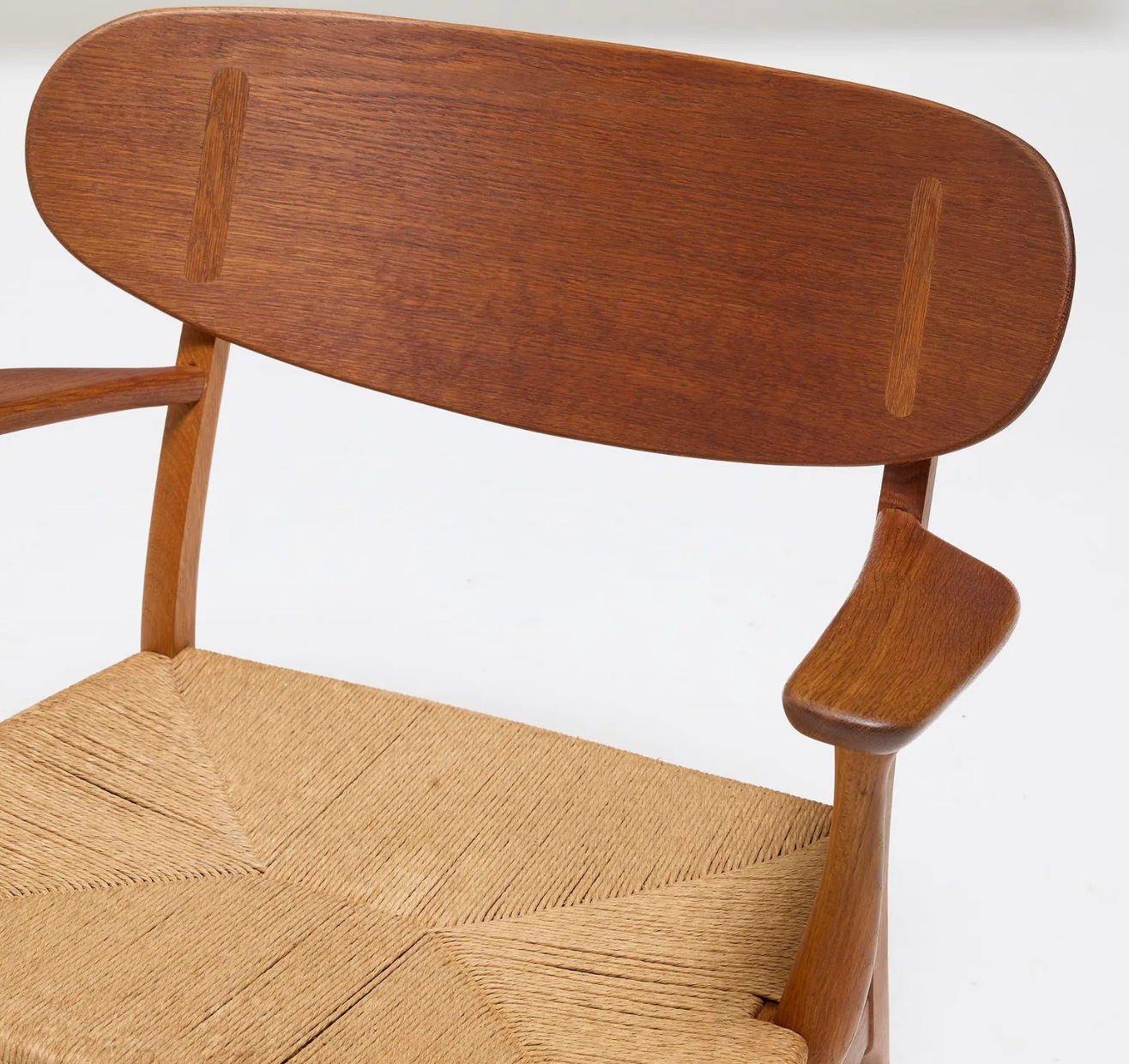 One chair features an early production burn-mark stamp beneath the arm, indicating its first-generation manufacture. The second chair is an authentic later / 2nd-generation example that originally carried factory stickers, now lost over time — a common occurrence in mid-century Danish seating. Together, they represent the subtle evolution of early CH22 production while maintaining visual harmony as a pair.