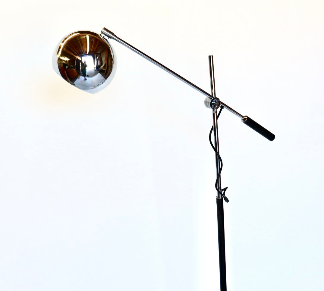 Robert Sonneman eyeball floor lamp c.1960s, USA. The lamp features a chrome sphere shade on a pivoting arm that can be adjusted to multiple vertical heights with cylindrical black handle. The stem of the lamp is a narrow chrome and black cylindrical pole that connects to a steel tripod base. A simplistic yet eye catching design. Excellent condition; professionally cleaned.