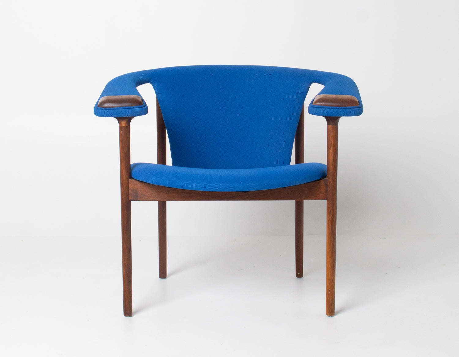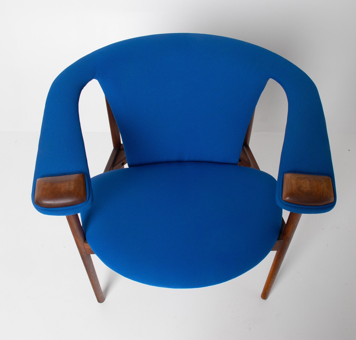 This chair remains in original vintage condition, retaining honest age character and some light wear on the arm caps that speaks to its history and authenticity. The seat and back have been newly upholstered in a vibrant Knoll blue fabric, offering a fresh, modern contrast against the walnut frame while honoring the period aesthetic.
