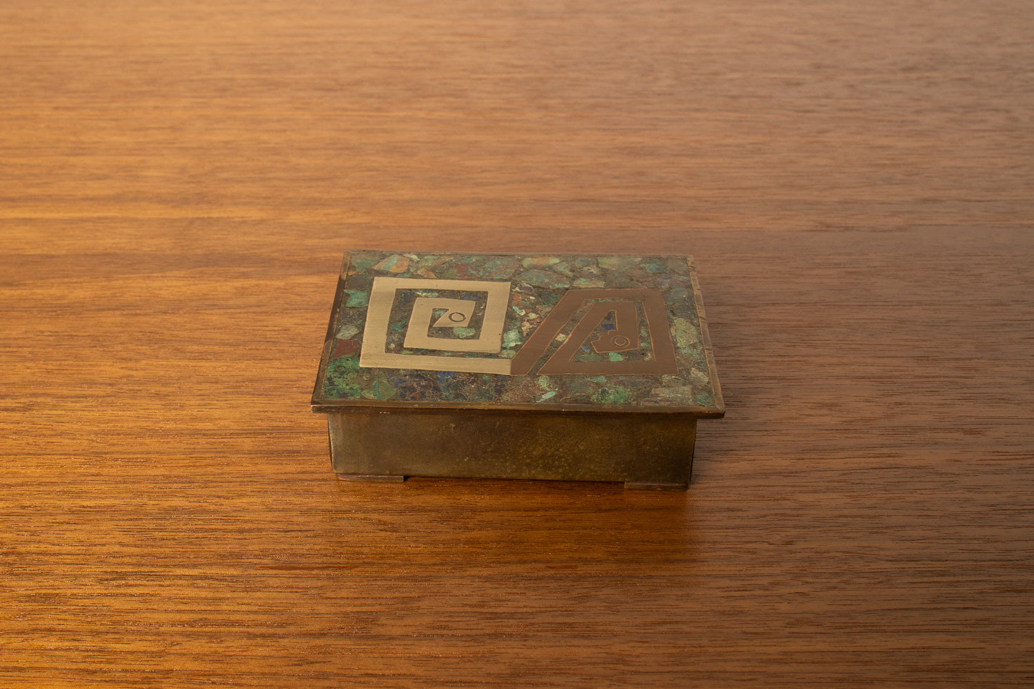 Mexican made trinket box c.1960s, comprised of copper, brass, silver and malachite. The rectangular box is wood lined with a shallow basin to store ring or other precious items or . The lid of the box depicts a mixed metal iconography with a malachite background.