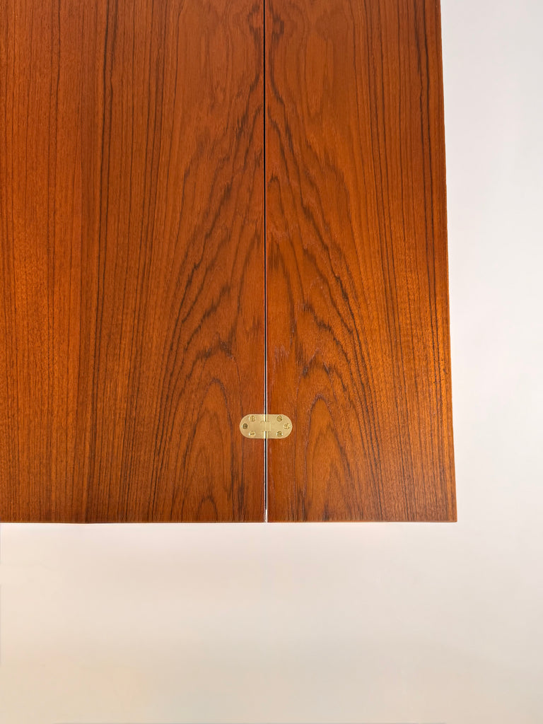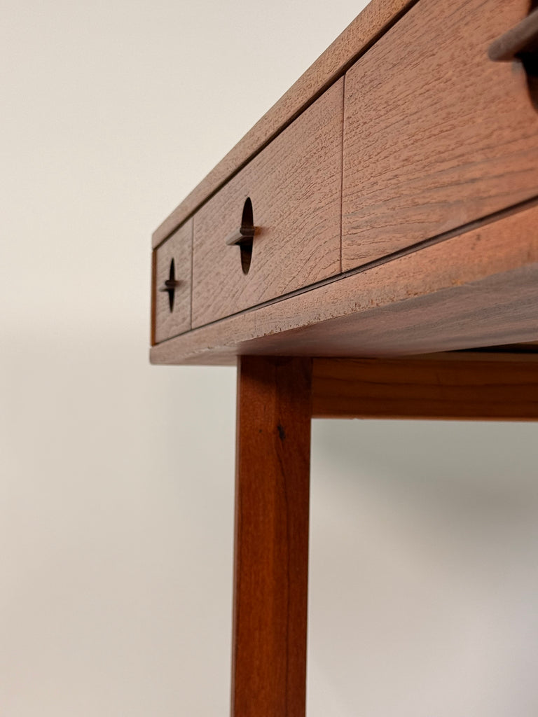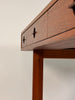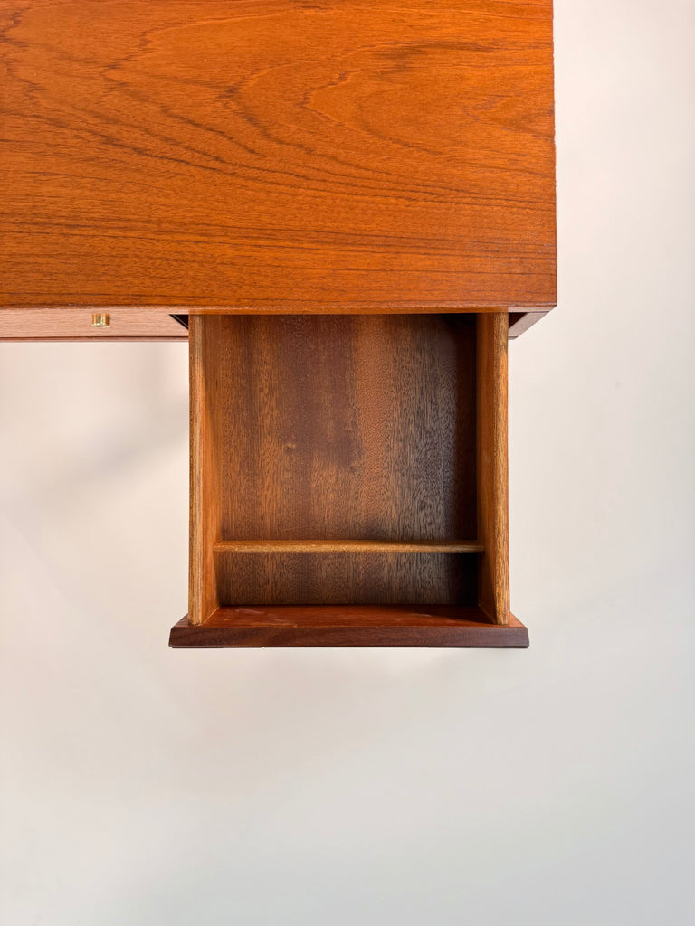 Lovig’s masterful use of teak showcases the wood’s warm glow and fine grain, while the floating top and tapered legs give the piece its signature lightness. Designed to be appreciated from every angle, this desk features an ingenious reversible design with drawers and open shelving accessible from both sides—making it ideal for placement in the center of a room.