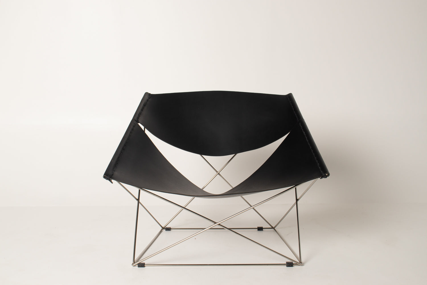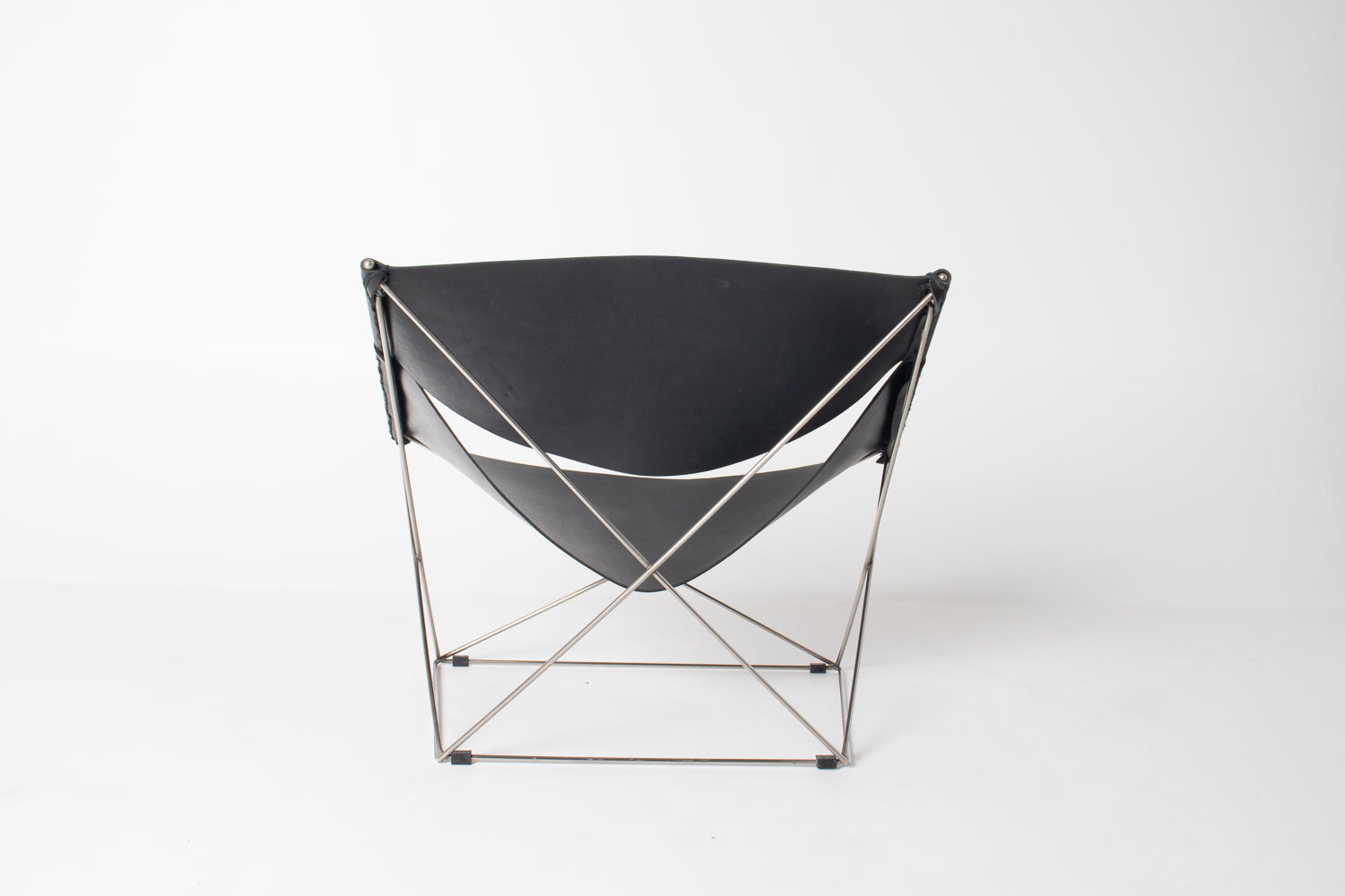 This example features a new black sling, crafted in the spirit of the original material and fitted with precision for a clean, sculptural presence. The sling’s crisp lines counterbalance the graceful tension of the stainless steel wire frame, creating a seat that appears to float while still offering comfortable, relaxed support.