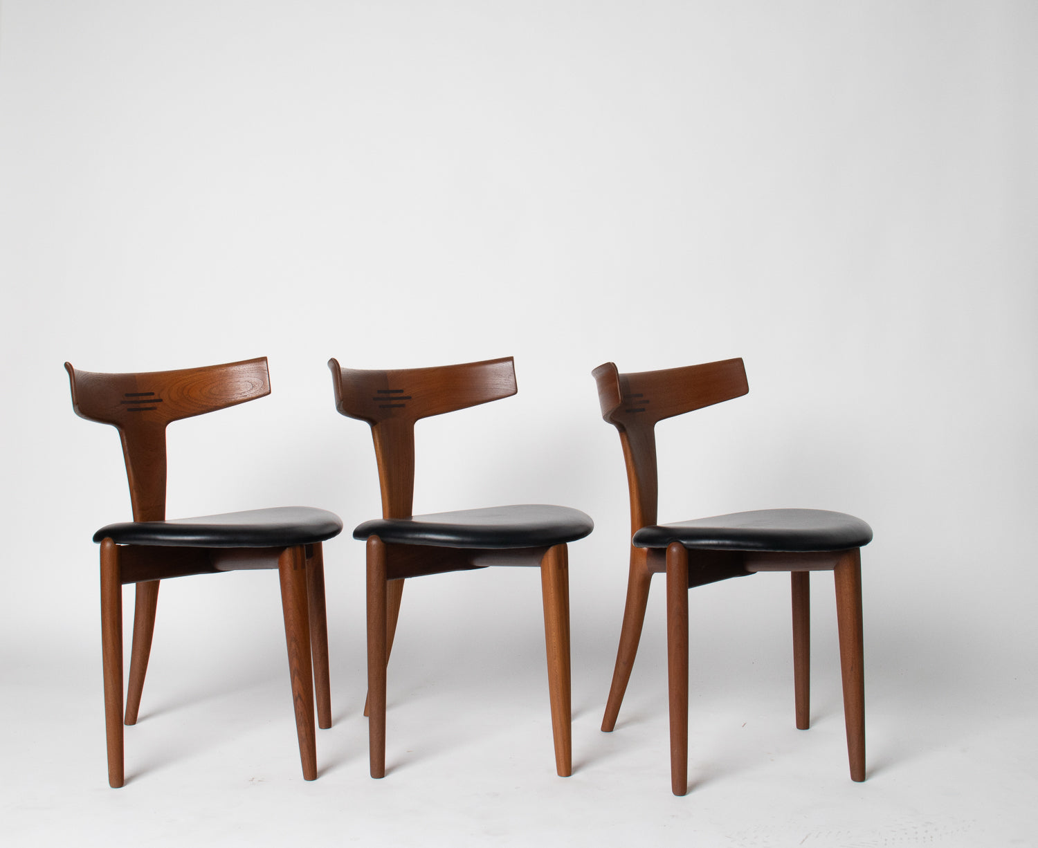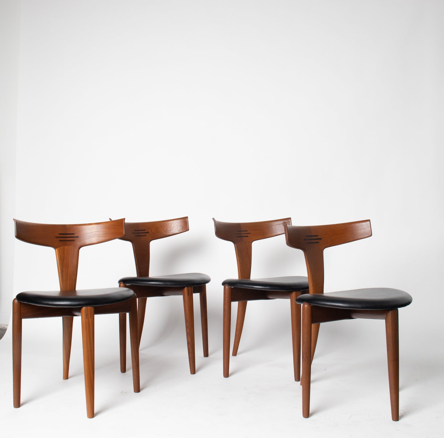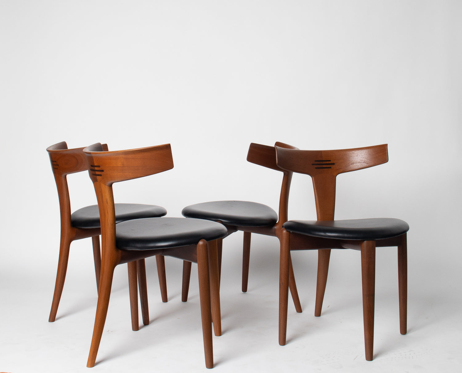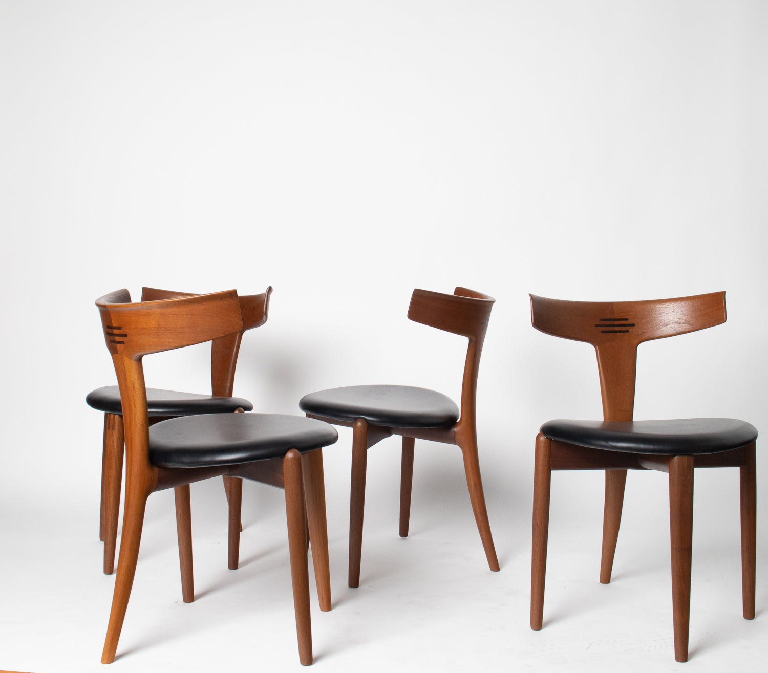 A beautifully sculpted set of Danish dining chairs by Palle Petersen & Erik Andersen, showcasing the refined craftsmanship and organic elegance of mid-century Scandinavian design. Made from old-growth teak with a soft, glowing grain, each chair features an exquisitely curved backrest with subtle integrated rosewood inlaysโan understated detail that speaks to the makerโs hand and the eraโs devotion to thoughtful joinery.